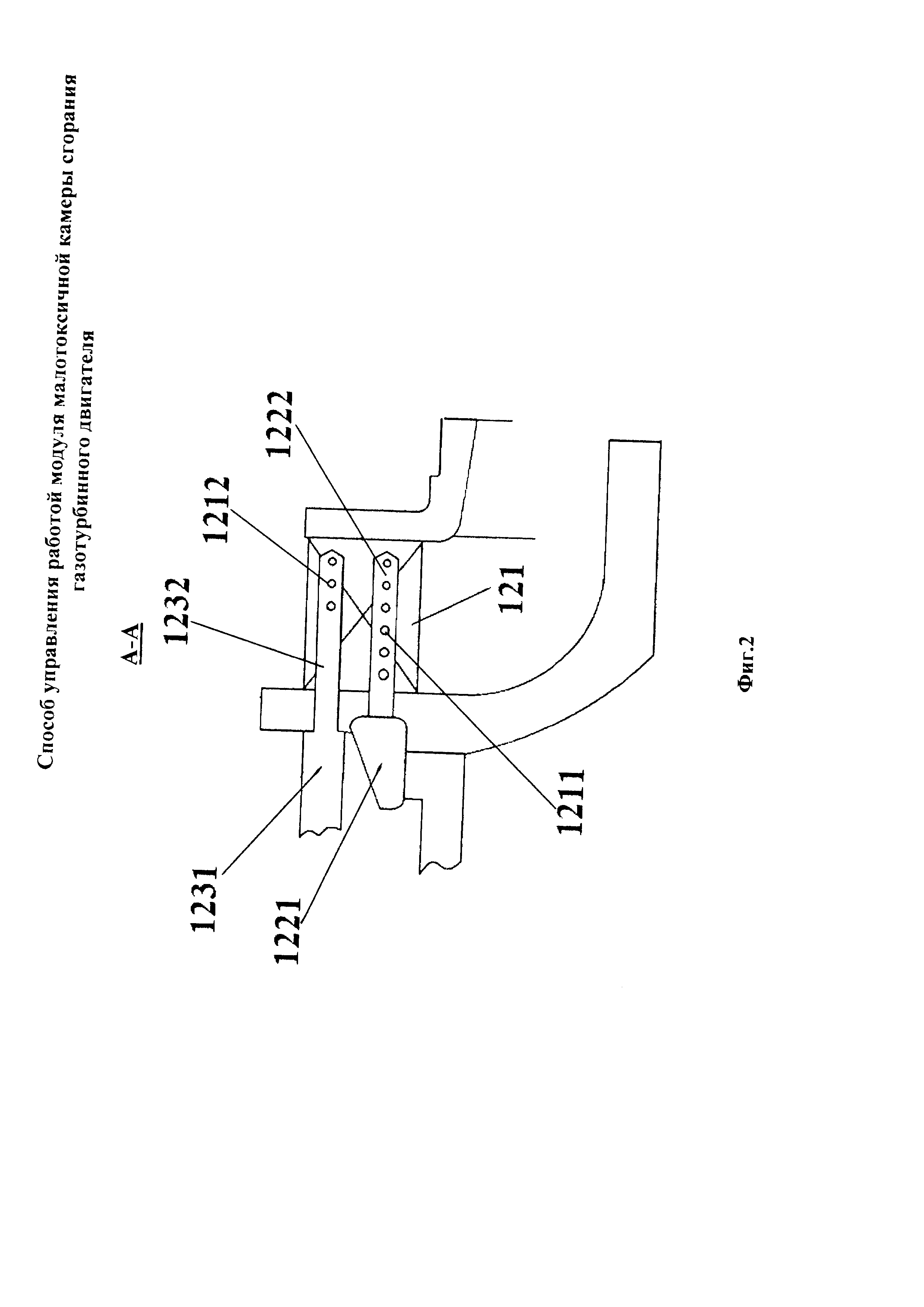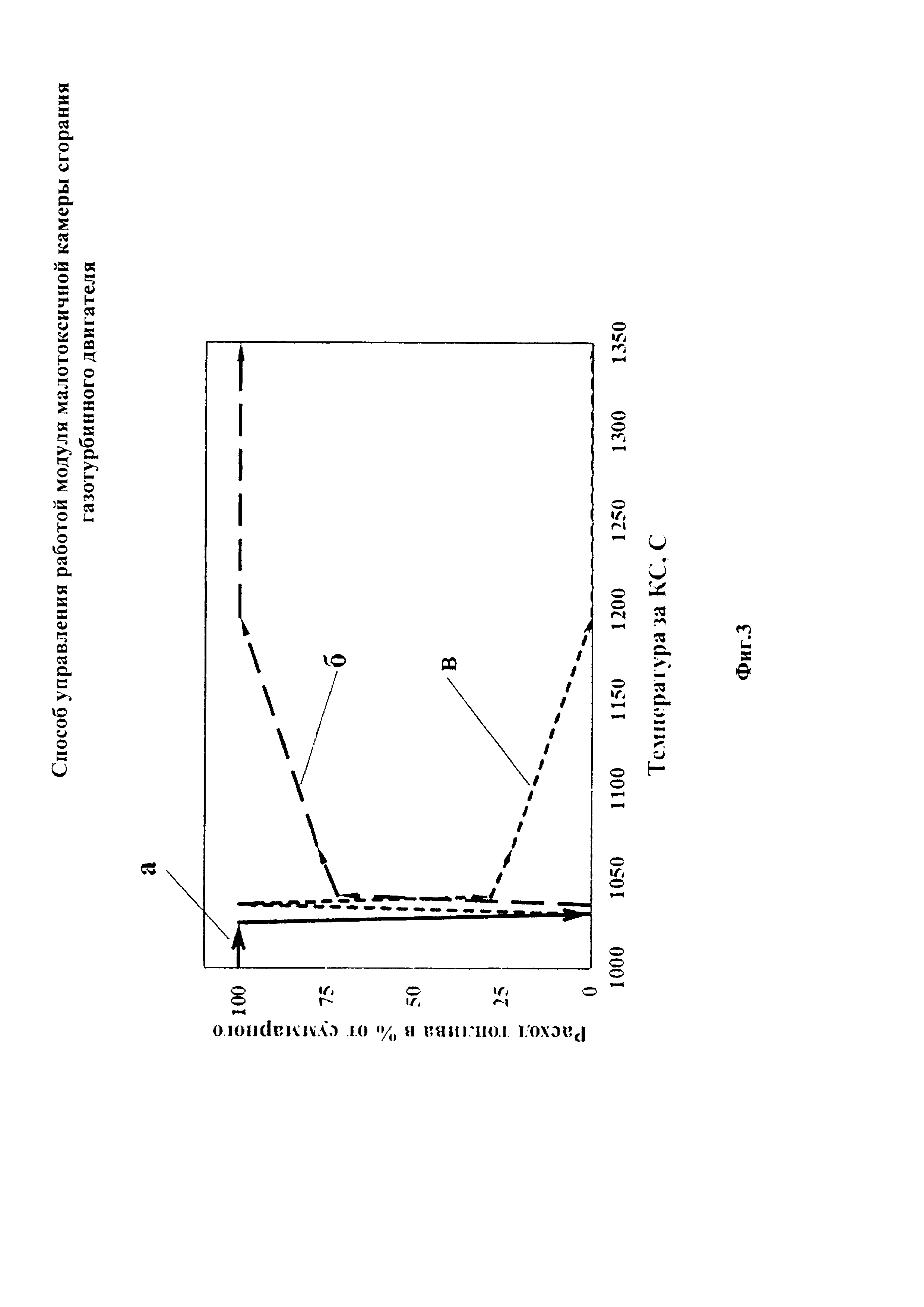 Способ управления работой модуля малотоксичной камеры сгорания газотурбинного двигателя, причем указанный модуль содержит: фронтовое устройство с концентрически расположенными внутренней диффузионной пилотной горелкой с регулируемым топливоподводом и внешней основной кольцевой горелкой предварительного смешения с лопаточным радиальным завихрителем воздуха и с двумя - главной и корректирующей независимыми регулируемыми топливораспределительными системами, выпускные каналы которых размещены в межлопаточных пространствах указанного завихрителя, а также примыкающую к фронтовому устройству жаровую трубу, заключающийся в том, что в режиме перехода подачи топлива с пилотной на основную горелку соотношение расходов топлива между указанными двумя топливораспределительными системами устанавливают экспериментально в период наладки режима, исходя из условия устойчивого безвибрационного характера горения, отличающийся тем, что: в период от включения основной горелки до ее выхода на максимальный режим расход топлива через главную топливораспределительную систему увеличивают от 0 до 95…99%, а через корректирующую - уменьшают от 100 до 5…1% от общего расхода топлива, а указанное экспериментальное соотношение расходов топлива определяют для каждой конкретной конструкции модуля функцией температуры на выходе из жаровой трубы и поддерживают в дальнейшем эту зависимость на всех режимах работы основной горелки.