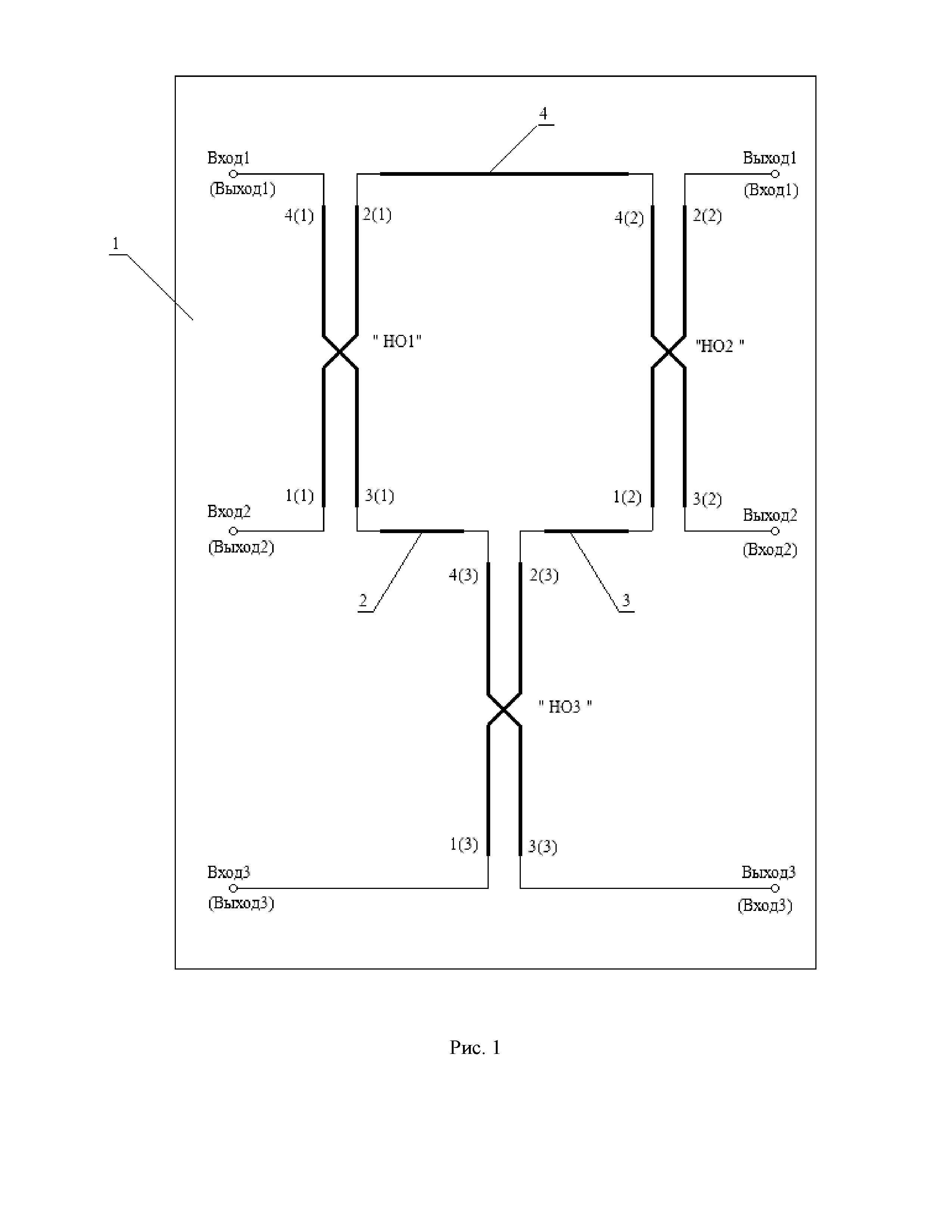 3 дБ, однократно перекрещивающихся. Смежные микрополосковые направленные ответвители расположены перпендикулярно один по отношению к другому, так что проводники их связанных линий образуют стороны двух квадратов, первый из которых расположен внутри второго. Проводники связанных линий каждого микрополоскового направленного ответвителя скрещены так, что их концы расположены на сторонах первого и второго квадратов. Концы проводников, расположенных на смежных сторонах внутреннего квадрата, соединены между собой. Концы проводников, расположенных на противолежащих сторонах второго квадрата, являются входами и выходами соответственно.