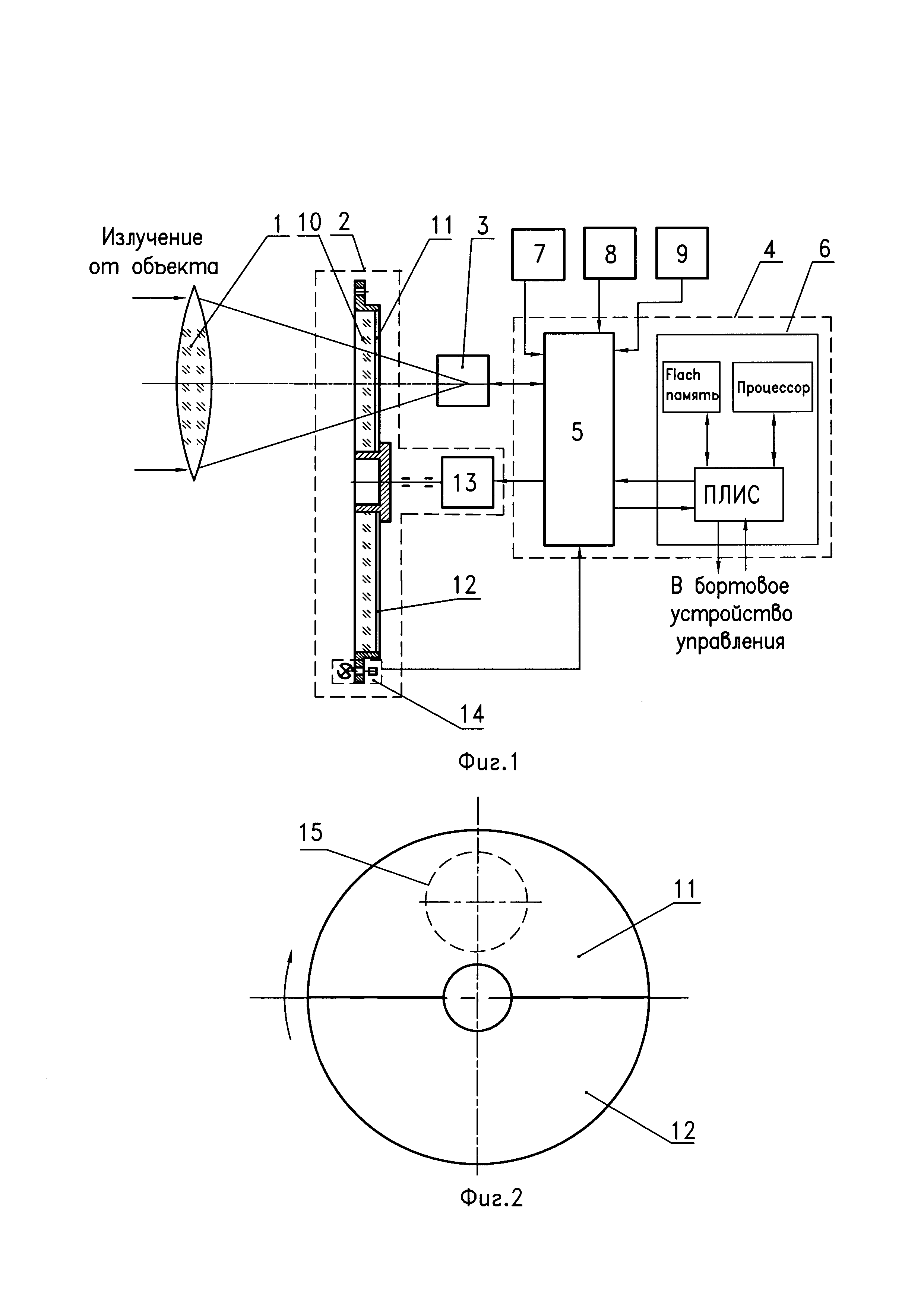 Изобретение относится к приборостроению, а именно к оптико-электронным приборам - теплопеленгаторам (ТП), предназначенным для обнаружения и определения координат теплоизлучающих объектов. Такие приборы находят применение в системах индивидуальной защиты летательных аппаратов (ЛА) (см. патент РФ №2601241 МКИ F41G 7/00, опубл. 27.10.2016). В настоящее время в системах защиты ЛА отдается предпочтение датчикам мгновенного (несканирующего) обзора, осуществляющим практически одновременный просмотр пространства в секторе более 90° (см. Авиационные станции предупреждения о ракетной атаке // Зарубежное военное обозрение. 2016. №10. С.67-72). Комбинация из четырех или шести подобных датчиков обеспечивает обзор соответственно либо круговой зоны пространства, либо полной сферы. С увеличением зоны обзора возрастает количество целеподобных объектов, из которых должен быть выделен объект с характерными признаками. Одним из таких признаков является отношение сигналов, создаваемых излучением объекта в двух или более узких диапазонах оптического спектра. На использовании этого признака основана спектральная селекция объектов, позволяющая выделять теплоизлучающие объекты на фоне отличающихся по спектру помех. Применение спектральной селекции в ТП способствует повышению вероятности правильного обнаружения объектов. Известно пассивное оптико-электронное следящее устройство (см. патент США №8280113 МКИ G06К 9/00, G06F 19/00, опубл. 02.10.2012), содержащее единый входной оптический компонент и спектроделитель, разделяющий излучение на два канала, в каждом из которых установлен фотоприемник. Наличие двух фотоприемников ухудшает возможность правильного обнаружения объекта из-за сложности обеспечения одинакового размера и формата изображений. Кроме того, в схеме с двумя каналами увеличивается количество оптических компонентов, возрастают габариты и стоимость устройства, снижается его надежность. Наиболее близким к предполагаемому изобретению является устройство, принятое за прототип и содержащее объектив, устройство фильтрации оптического излучения, матричное фотоприемное устройство (МФПУ) и блок обработки информации (см. патент Франции №2885224 МКИ G01S 3/781, опубл. 03.11.2006). Объектив создает изображение пространства объектов в ИК области спектра, которое фокусируется в плоскости чувствительных элементов МФПУ. Устройство фильтрации оптического излучения содержит три спектральных фильтра, переключаемых с помощью привода, и снабжено датчиком положения фильтров. Спектральные фильтры, каждый из которых пропускает излучение в соответствующем диапазоне спектра, последовательно вводятся в оптический тракт между объективом и МФПУ. В результате воздействия оптического изучения, прошедшего через объектив и спектральные фильтры, в элементах МФПУ вырабатываются электрические сигналы, моменты съема которых синхронизированы с положением спектральных фильтров. Сигналы с МФПУ поступают в блок обработки информации, в котором сначала осуществляется пространственная селекция объектов, находящихся в поле зрения объектива, т.е. происходит выделение объектов, соответствующих по своим пространственным признакам заданным критериям. Затем сигналы от выделенных объектов классифицируются по спектральному признаку, в результате чего при наличии объекта, представляющего у