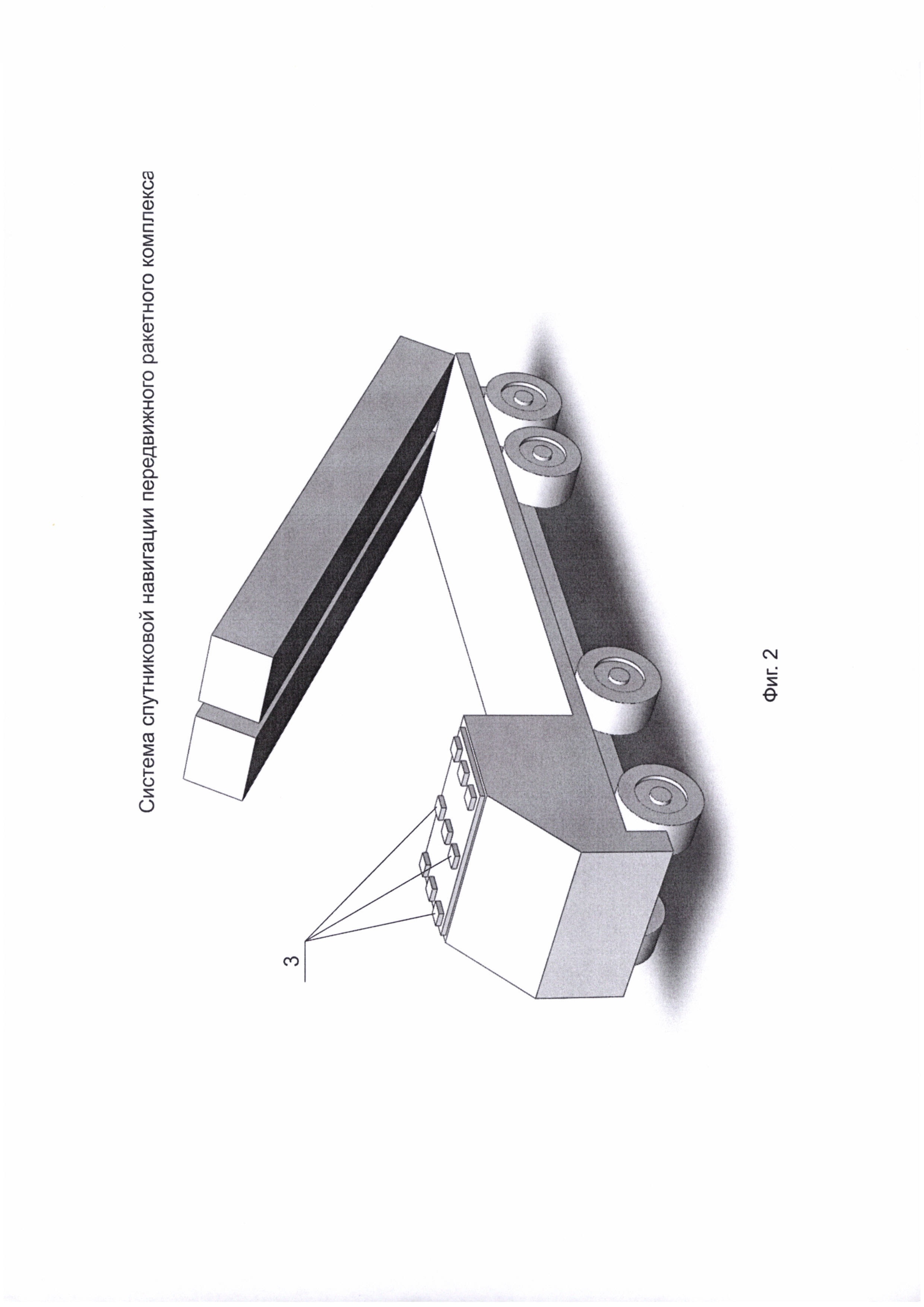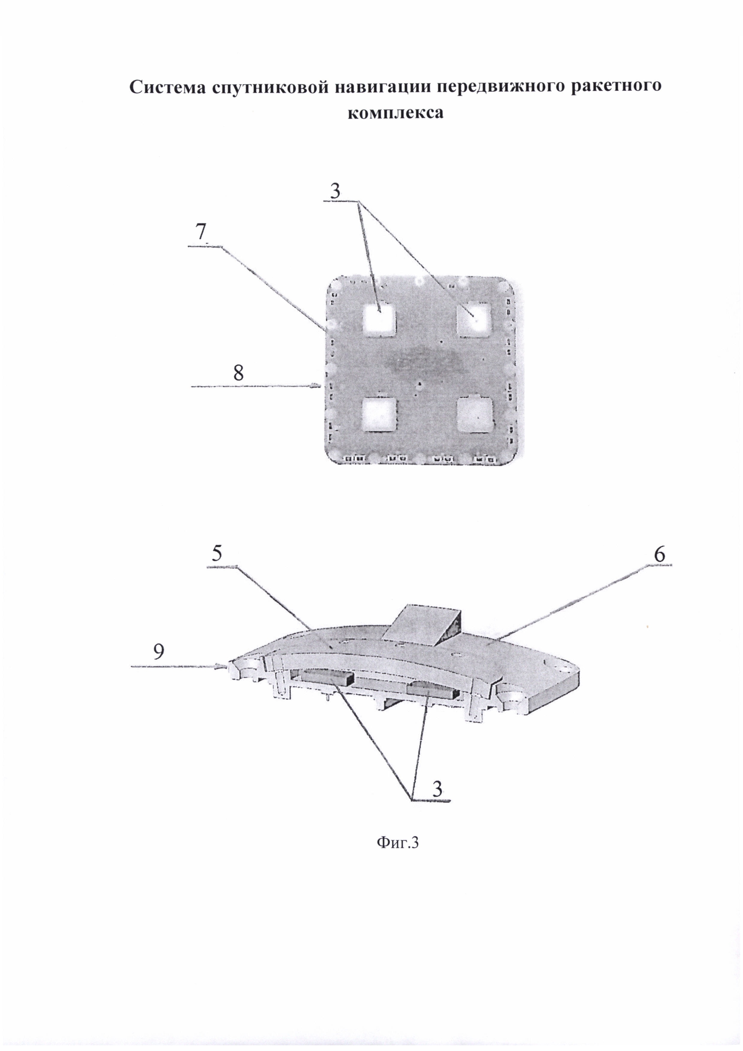 Изобретение относится к помехозащищенным системам спутниковой навигации, предлагаемым к использованию в составе передвижных ракетных комплексов. Система спутниковой навигации передвижного ракетного комплекса содержит аппаратуру спутниковой навигации и антенную систему, выполненную помехозащищенной в виде независимых блоков: антенны системы спутниковой навигации и блока обработки информации, при этом антенна выполнена в виде отдельных, в количестве не менее четырех, антенных элементов приема спутниковых сигналов, предназначенных для обеспечения работы одного канала спутниковой связи, каждый антенный элемент независимо соединен с блоком обработки информации, причем антенна размещена в верхней части элементов комплекса под радиопрозрачным защитным кожухом. Блок обработки информации размещают под радиопрозрачным защитным кожухом или в отсеке бортовой аппаратуры комплекса. Изобретение позволяет повысить помехозащищенность системы спутниковой навигации. 2 з.п. ф-лы, 3 ил.