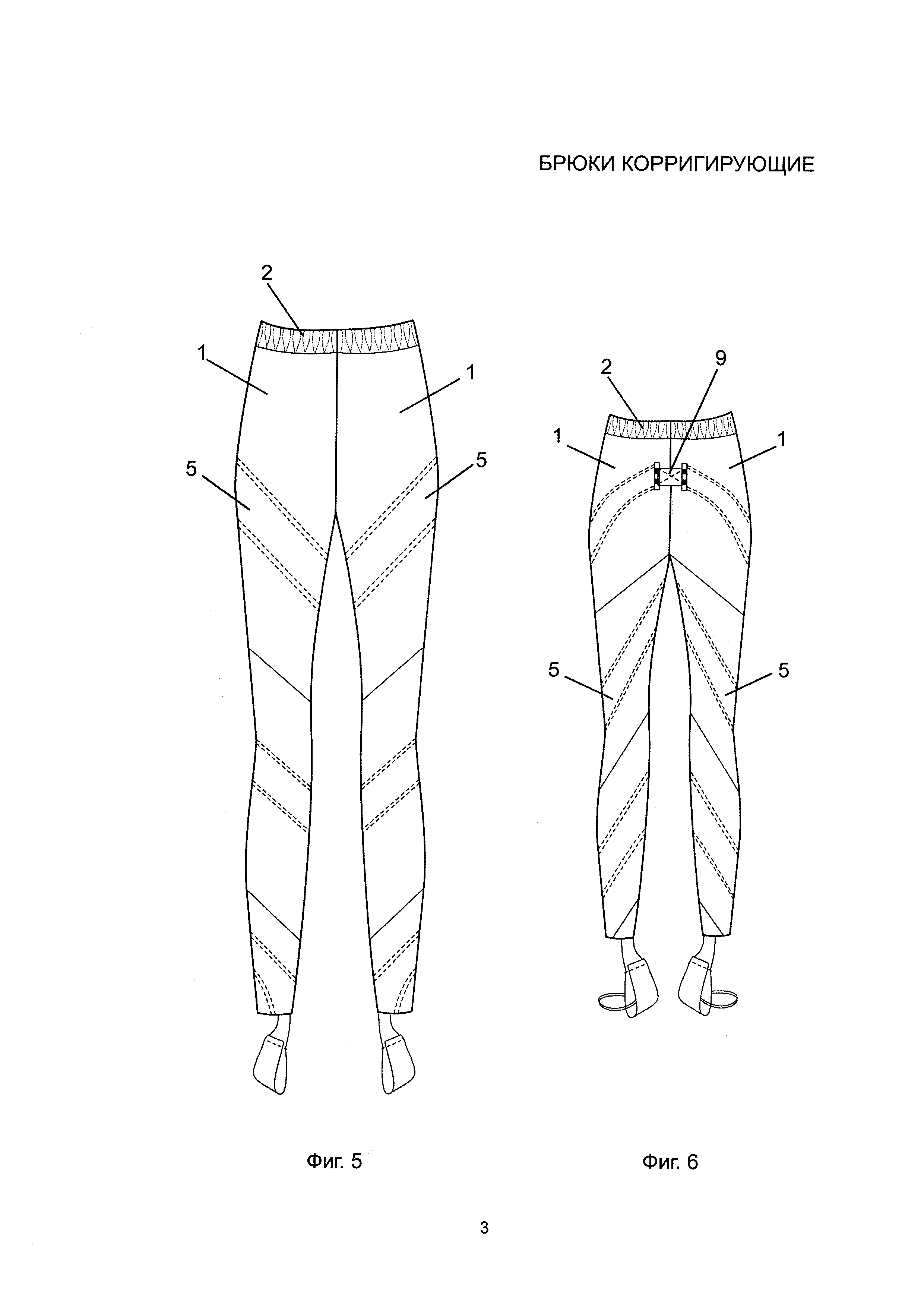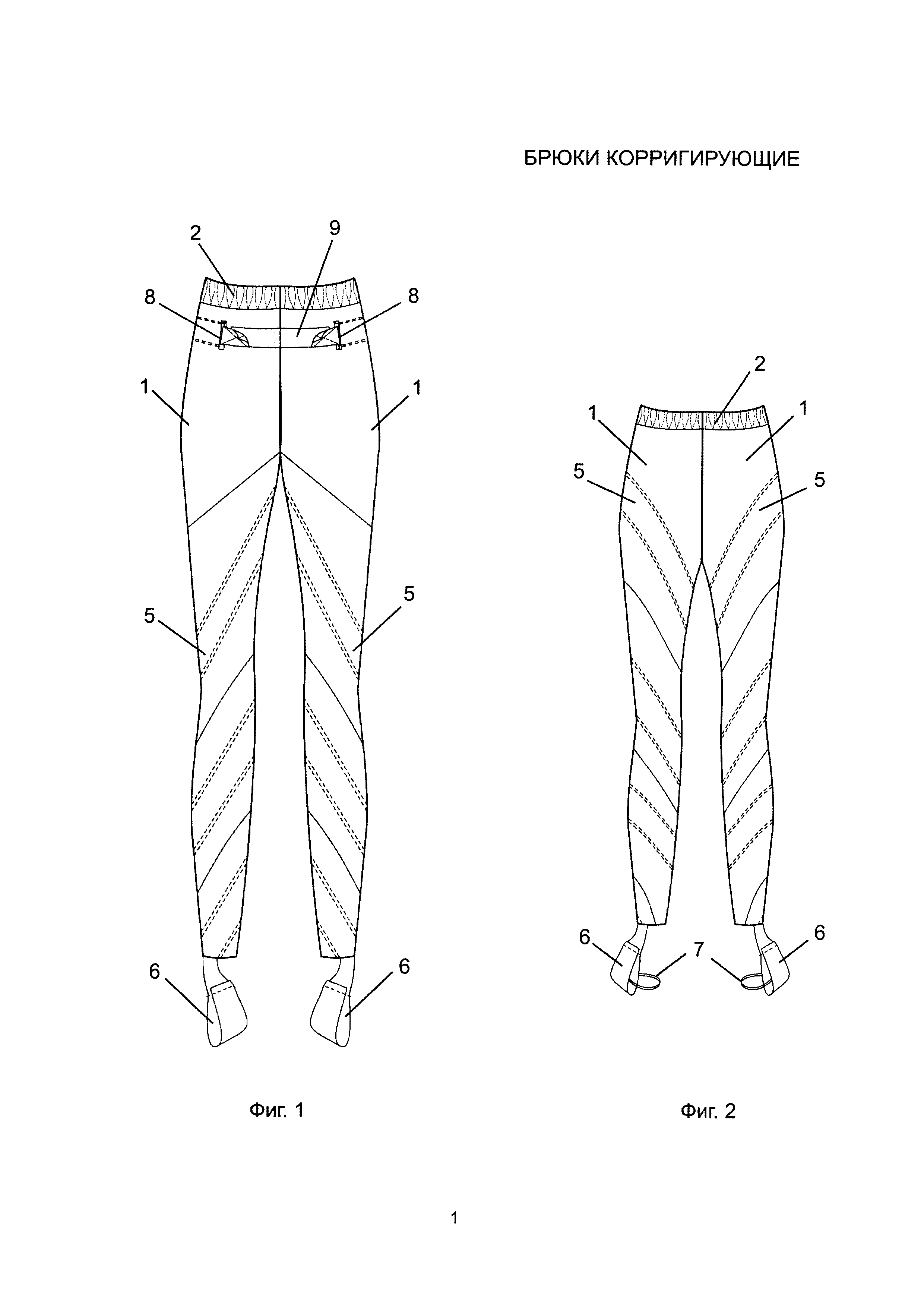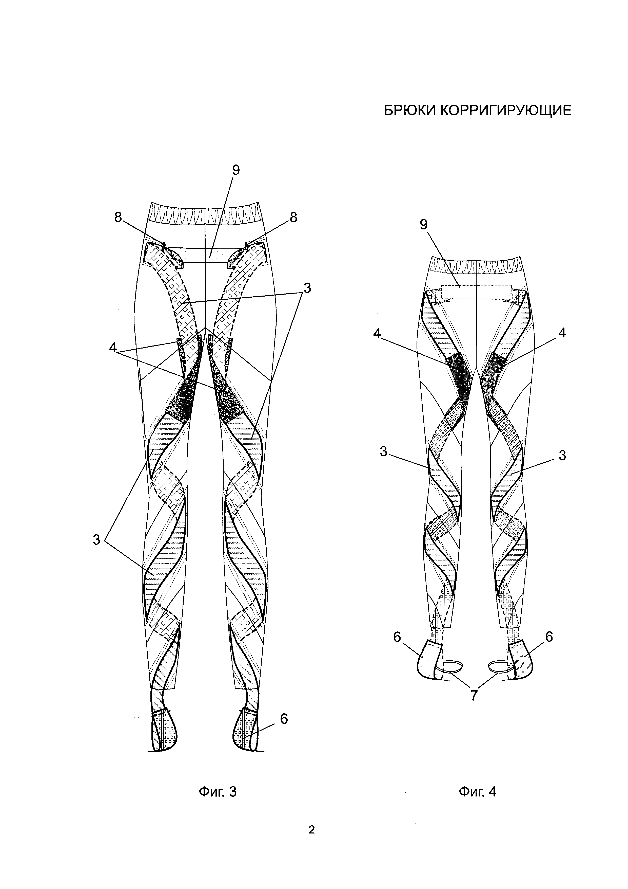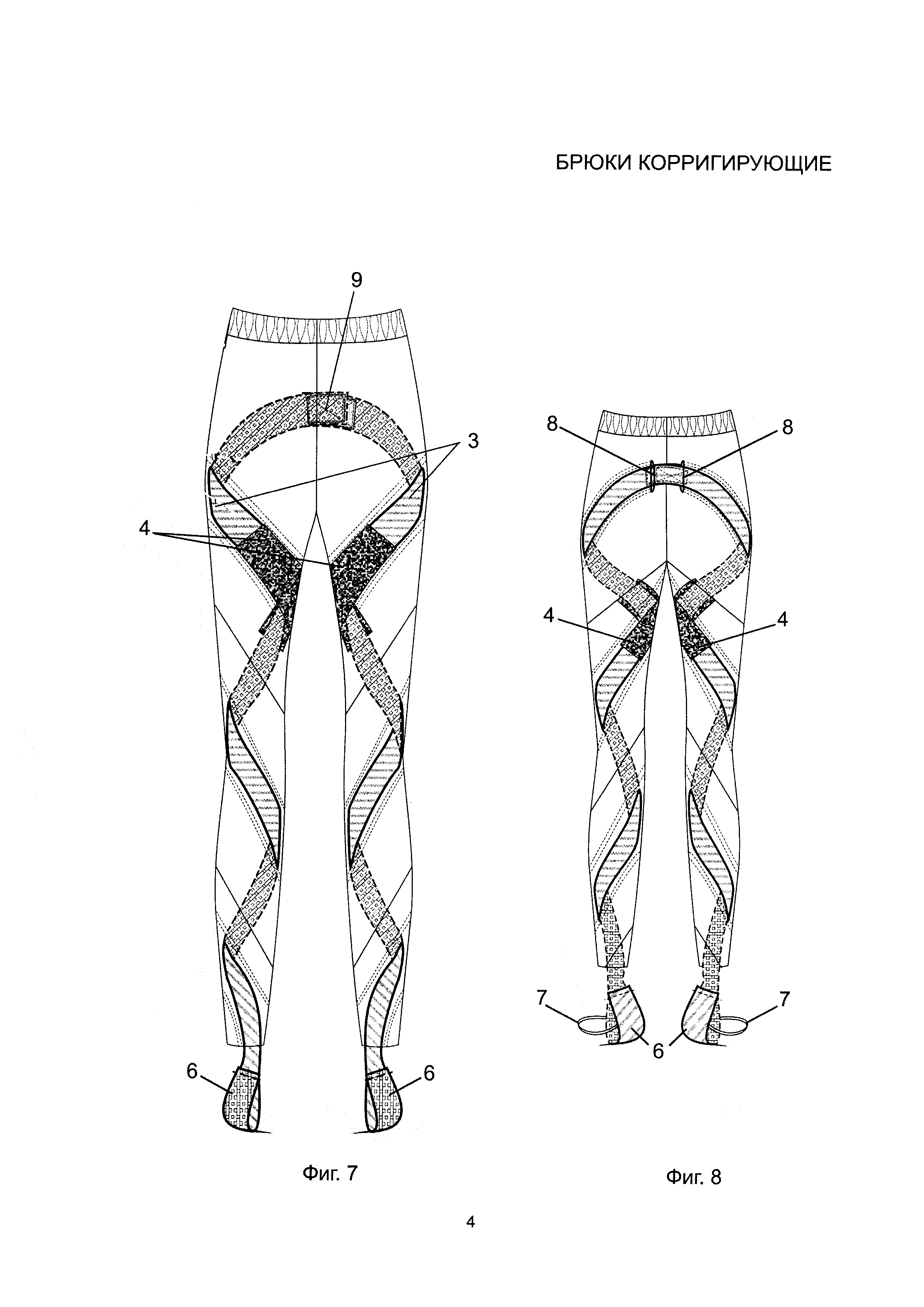 1. Брюки корригирующие, характеризующиеся тем, что состоят из двух соединенных между собой по среднему шву штанин, каждая из которых образована путем стачивания соответствующего полотна заготовки по диагонально-винтовой линии, притачного пояса и являются двухслойными, где верхний и нижний слои ткани каждой штанины брюк соединены между собой двумя эквидистантными строчками, образующими вертикально ориентированный спиралевидный канал для эластичной тяги, нижний конец которой выходит из канала внизу штанины и, образуя штрипку-петлю, притачивается к этой эластичной тяге, а верхние свободные концы эластичных тяг выходят наружу навстречу друг другу через расположенные на передних частях брюк прорези и фиксируются на застежку на передних частях брюк ниже шва притачивания пояса с возможностью регулирования их относительного смещения по длине застежки, при этом диагонально-винтовая линия шва стачивания и вертикально ориентированный спиралевидный канал имеют направление, если смотреть на изделие спереди и снизу вверх, на левой штанине против часовой стрелки, на правой - по часовой стрелке. 2. Брюки по п. 1, отличающиеся тем, что между верхним и нижним слоями ткани каждой штанины брюк в области внутренней поверхности бедра на детали нижнего слоя штанины притачан усилитель. 3. Брюки по п. 1 или 2, отличающиеся тем, что каждая штрипка-петля имеет фиксирующий пятку задник. 4. Брюки по п. 1, отличающиеся тем, что верхние концы эластичных тяг фиксируются на текстильную застежку. 5. Брюки по п. 1, отличающиеся тем, что расположенные на передних частях брюк прорези для верхних концов эластичных тяг представляют собой обработанные петли-отверстия. 6. Брюки по п. 1, отличающиеся тем, что притачной пояс изготовлен из эластичной ленты. 7. Брюки по п. 1, отличающиеся тем, что выполнены без боковых и шаговых швов. 8. Брюки корригирующие, характеризующиеся тем, что состоят из двух соединенных между собой по среднему шву штанин, каждая из которых образована путем стачивания соответствующего полотна заготовки по диагонально-винтовой линии, притачного пояса и являются двухслойными, где верхний и нижний слои ткани каждой штанины брюк соединены между собой двумя эквидистантными строчками, образующими вертикально ориентированный спиралевидный канал для эластичной тяги, нижний конец которой выходит из канала внизу штанины и, образуя штрипку-петлю, притачивается к этой эластичной тяге, а верхние свободные концы эластичных тяг выходят наружу навстречу друг другу через расположенные на задних частях брюк прорези и фиксируются на застежку на задних частях брюк ниже шва притачивания пояса с возможностью регулирования их относительного смещения по длине застежки, при этом диагонально-винтовая линия шва стачивания и вертикально ориентированный спиралевидный канал имеют направление, если смотреть на изделие спереди и снизу вверх, на левой штанине брюк по часовой стрелке, на правой - против часовой стрелки. 9. Брюки по п. 8, отличающиеся тем, что между верхним и нижним слоями ткани каждой штанины брюк в области внутренней поверхности бедра на детали нижнего слоя штанины притачан усилитель. 10. Брюки по п. 8 или 9, отличающиеся тем, что каждая штрипка-петля имеет фиксирующий пятку задник. 11. Брюки по п. 8, отличающиеся тем, что верхние концы эластичных тяг фиксирую