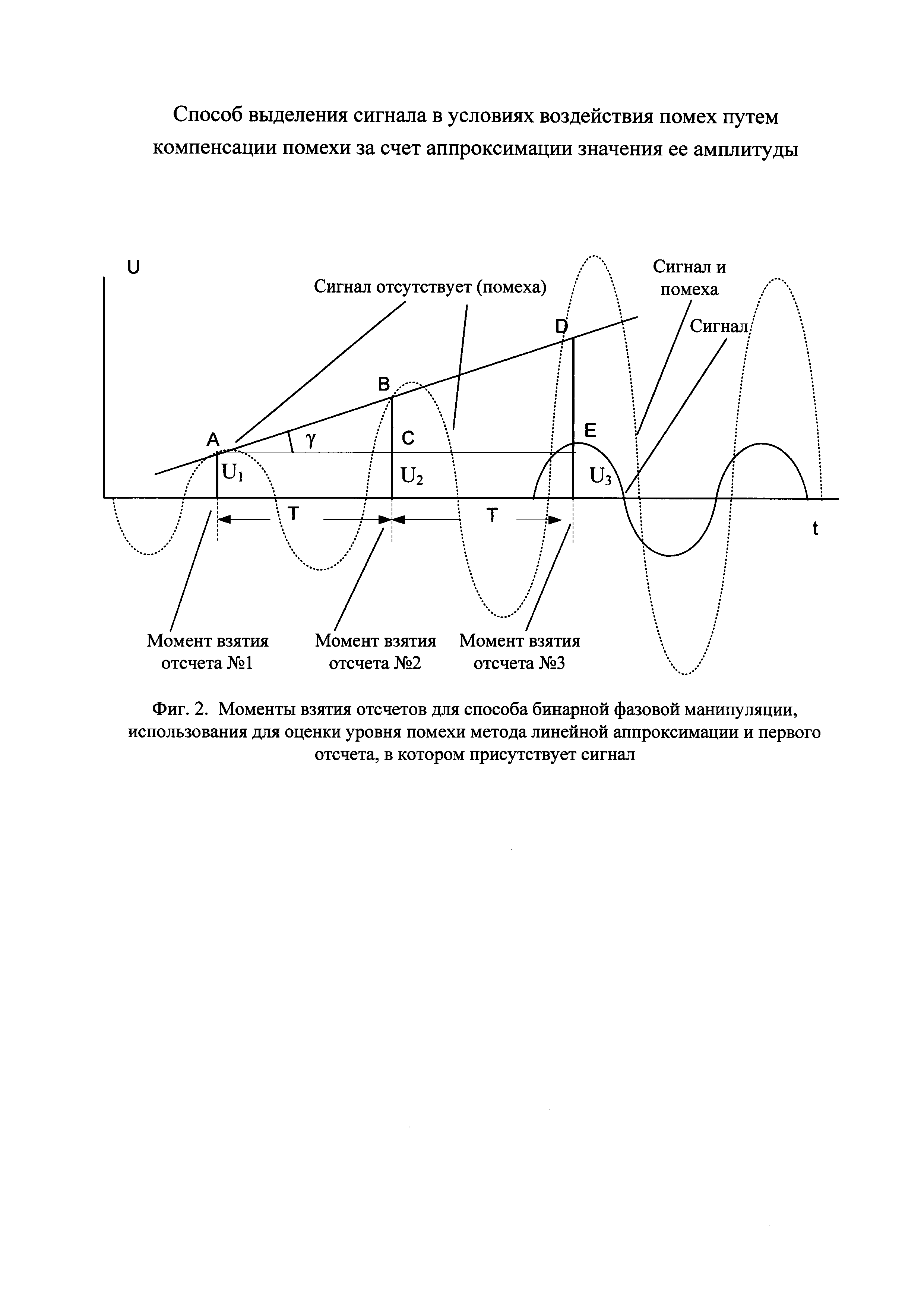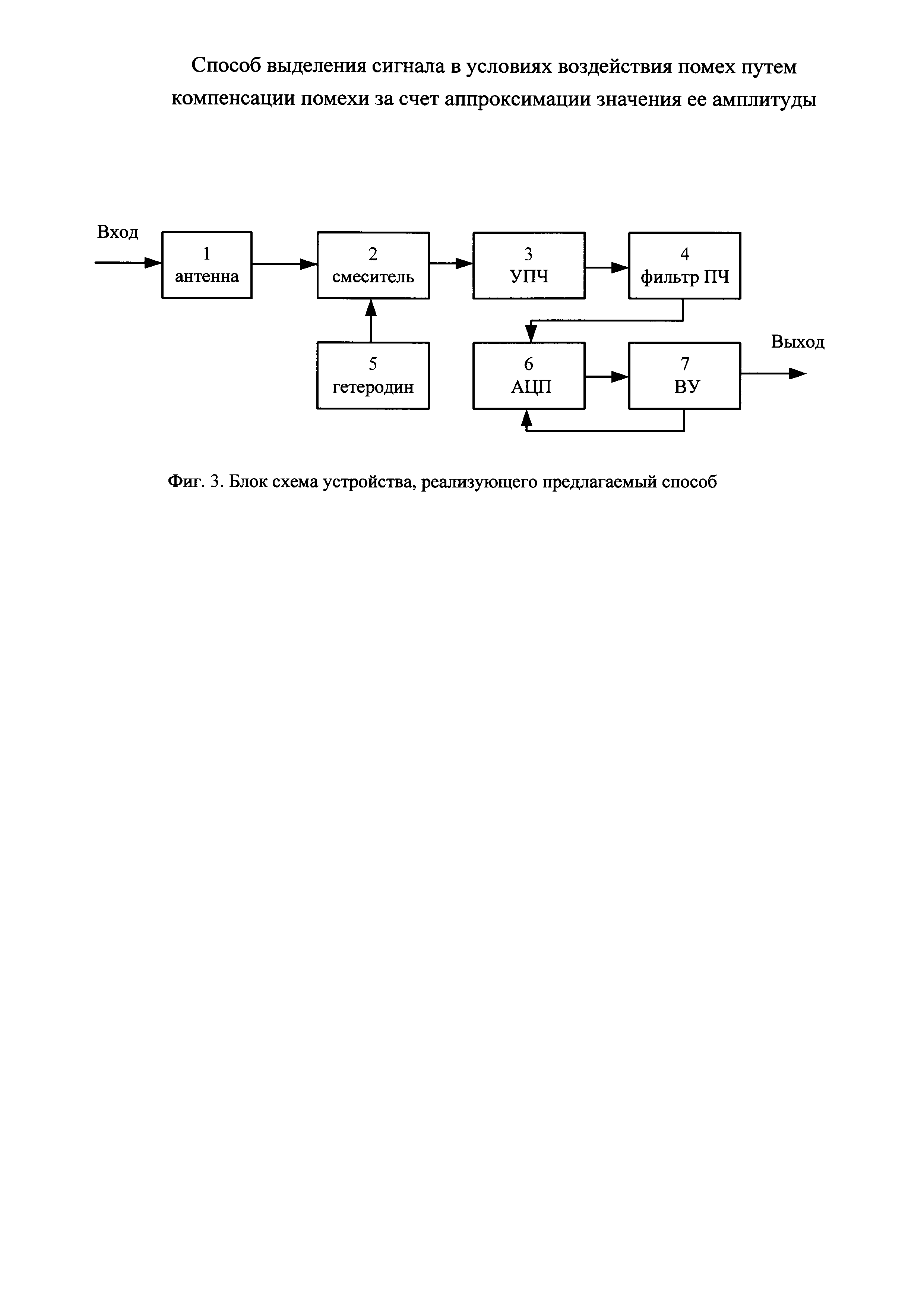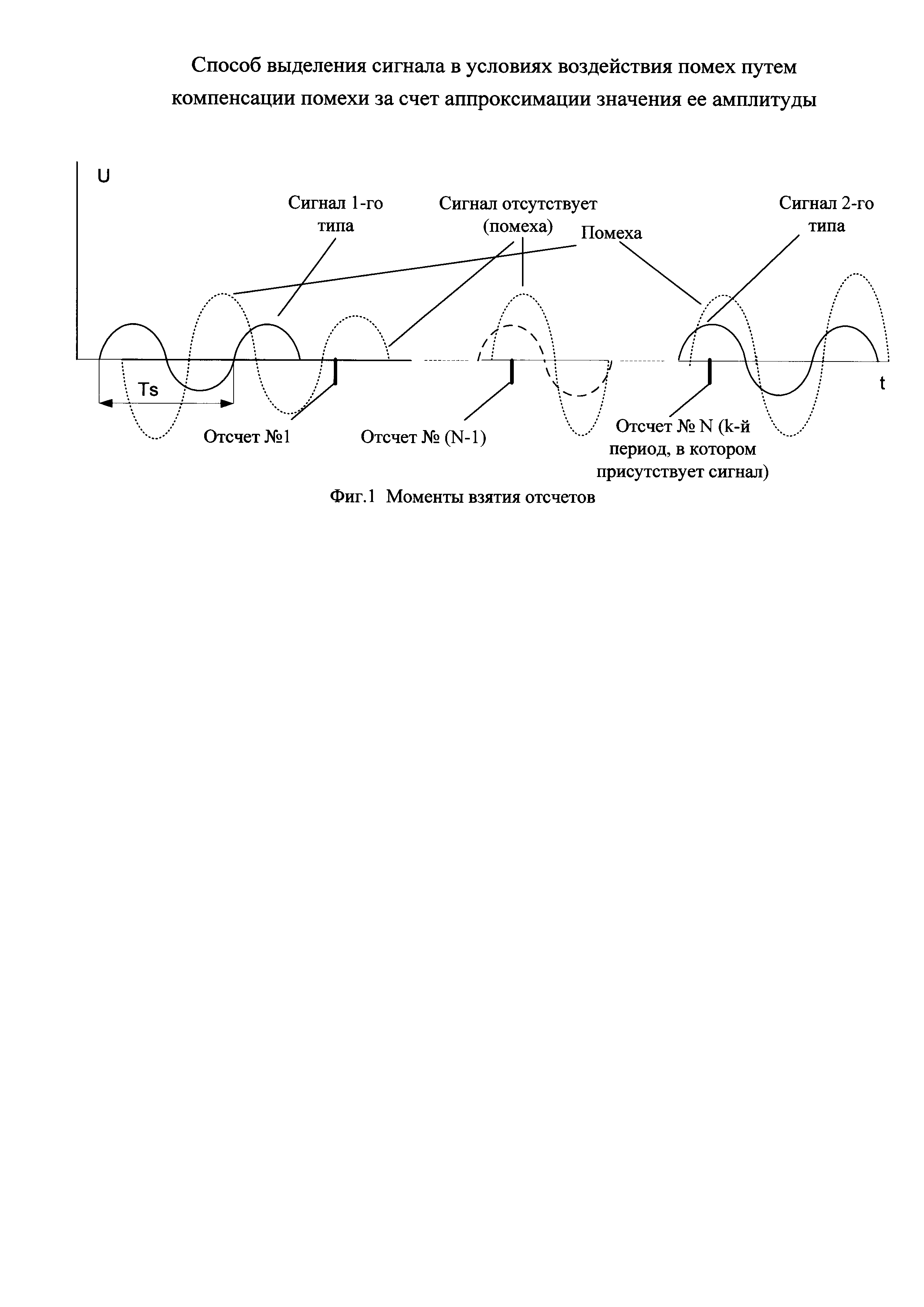 Способ выделения сигнала в условиях наличия помех, заключающийся в том, что формируется сигнал методом амплитудной, частотной или фазовой манипуляции и передается на фиксированной или соответствующей рабочей частоте, если используется перестройка рабочей частоты, на начальном этапе осуществляется синхронизация сигнала, например, путем обработки используемой кодовой последовательности, причем синхронизация осуществляется в начале передачи, если перестройка рабочей частоты не используется, и при каждом скачке частоты, если перестройка рабочей частоты используется, отличающийся тем, что сигналы передаются с паузой в начале передачи и между сигналами, длительность которой определяется исходя из используемого способа аппроксимации помехи и инерционности полосового фильтра, аддитивную смесь сигнала и помехи фильтруют полосовым фильтром, полученную смесь сигнала и помехи усиливают в усилителе и формируют в цифровом виде отсчеты смеси сигнала и помехи, первые (N-1) отсчеты берутся, когда сигнал отсутствует, через время, равное периоду изменения сигнала, причем отсчеты берутся в моменты, когда значения амплитуды сигнала, если бы он в данные моменты существовал, принимали бы максимальное или минимальное значение, число отсчетов при этом определяется исходя из используемого способа аппроксимации, последний отсчет (N), берется через определенное заранее число периодов, в которых присутствует сигнал, выбираемое исходя из условия обеспечения максимальной эффективности, в момент времени, когда амплитуда сигнала принимает максимальное или минимальное значение, с применением используемого метода аппроксимации рассчитывается значение амплитуды помехи в момент времени, когда берется отсчет, в котором присутствует сигнал, рассчитанное значение амплитуды помехи вычитается из значения амплитуды последнего отсчета, полученное значение сравнивается с соответствующими порогами, и по результатам сравнения делается вывод о наличии сигнала какого-либо типа.