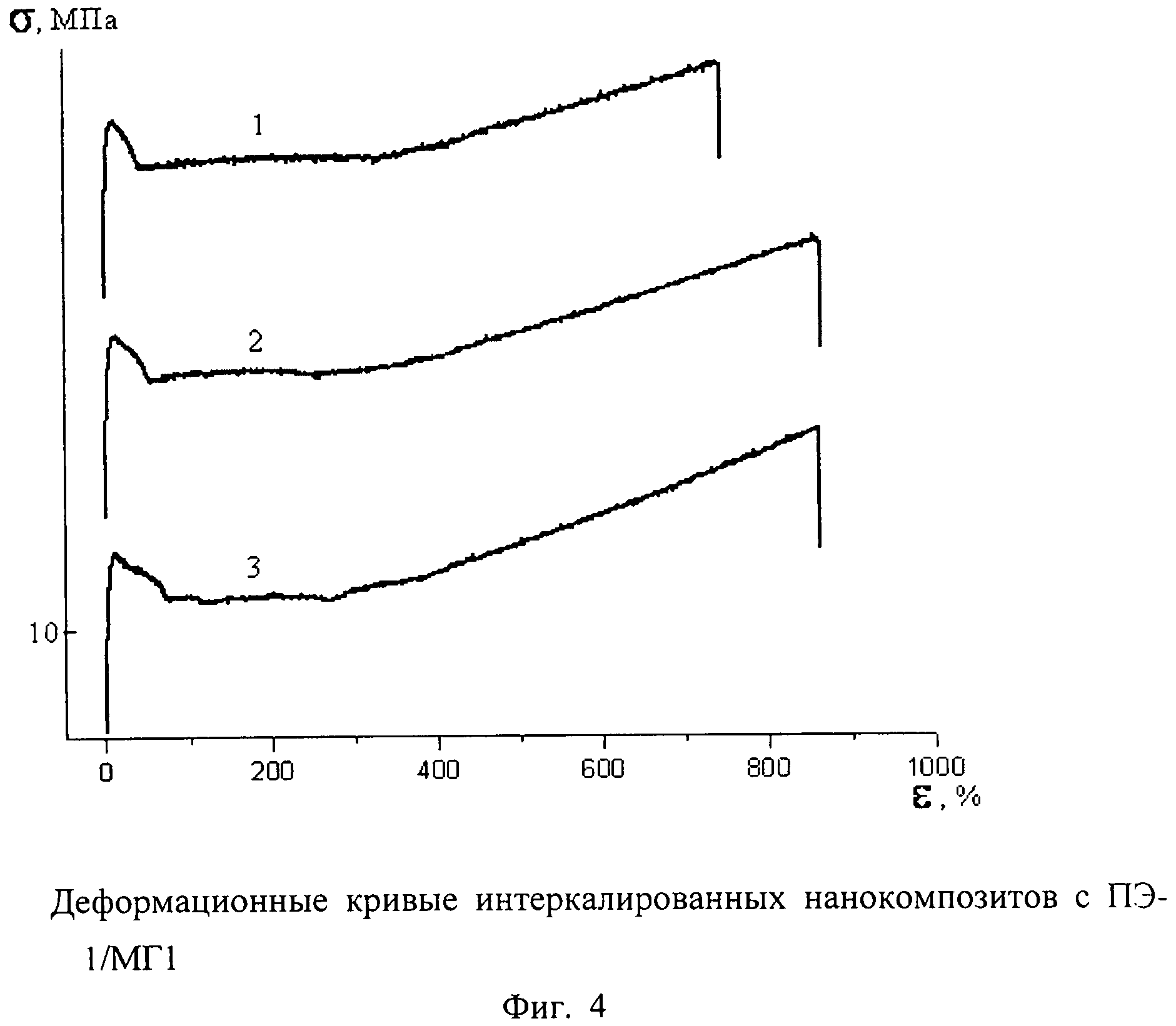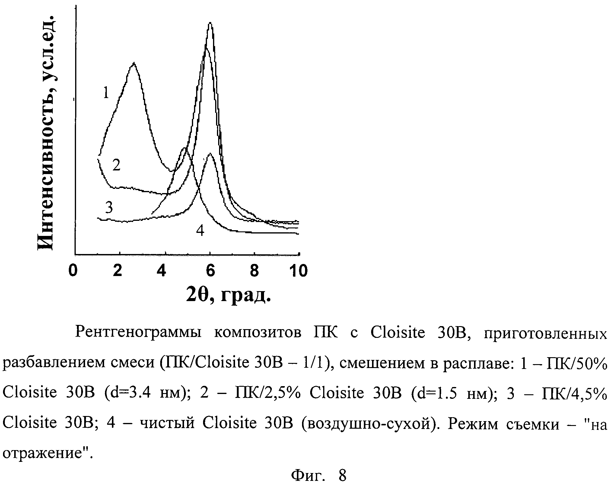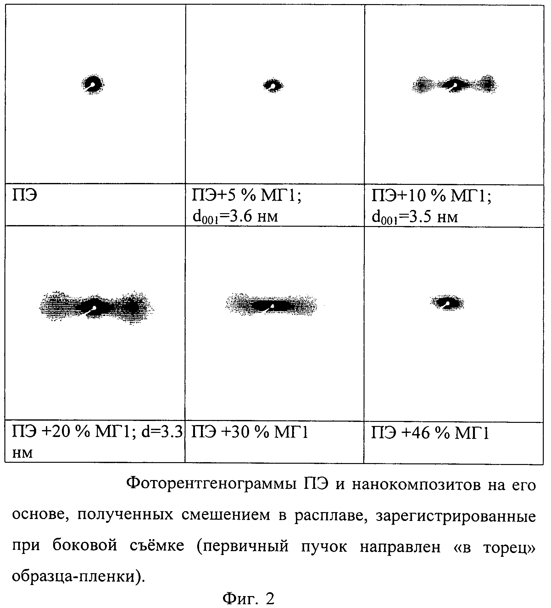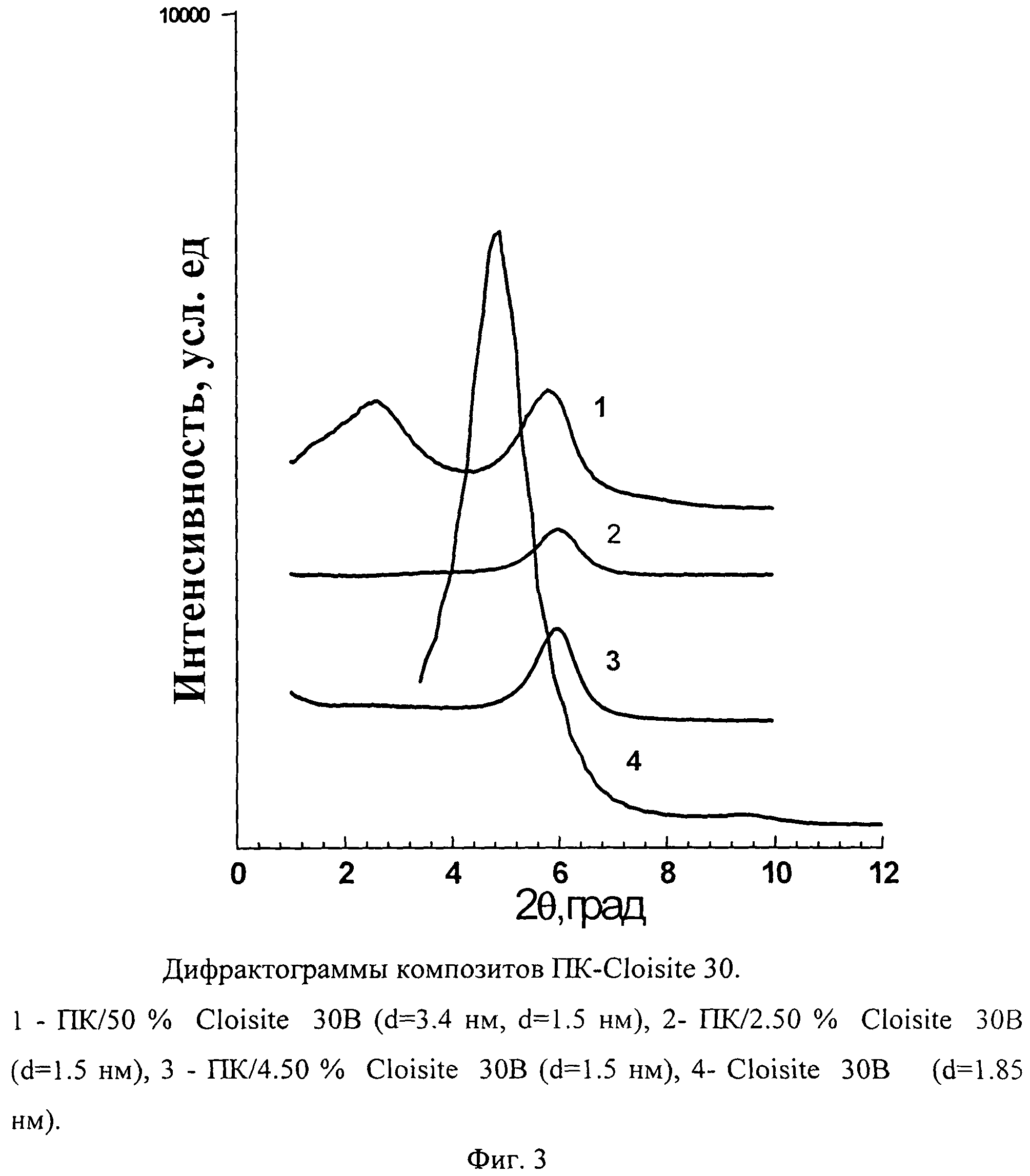 Изобретение относится к области создания нанокомпозитов на основе композиционных полимерных материалов с наноразмерными наполнителями и может быть использовано для создания материалов, применяемых, в частности, в полимерной индустрии и машиностроении. Одним из наиболее перспективных направлений развития современной химической технологии является производство и использование материалов, содержащих наночастицы, например, нанокомпозитов на основе органического полимера и неорганического нанонаполнителя - слоистого силиката. При уменьшении размеров частиц вещества до нанометрового диапазона изменяются его свойства, что объясняется высокой удельной поверхностью наночастиц. Однако высокая поверхностная энергия частиц, позволяющая в принципе получить материалы с уникальными свойствами, является в то же время препятствием для их равномерного распределения в полимерной матрице. Поэтому важнейшей задачей при получении полимерных нанокомпозитов является создание условий для раздвижения силикатных пластин и обеспечения интеркаляции полимерных цепей в межслоевые пространства с ограниченной геометрией. Для этого используют различные приемы: - модифицирование глины различными поверхностно-активными веществами (ПАВ), в том числе функционализированными (в частности, малеинизированными) полимерами (полиэтилен или полипропилен), которые, благодаря наличию функциональных групп в цепи, способны прививаться к поверхности глины; - создание высоких напряжений сдвига при смешении компонентов в расплаве и/или значительное увеличение времени их смешения; - проведение процесса расслоения (эксфолиирования) глины при твердофазном (ниже температуры плавления полимера) сдвиговом измельчении предварительно смешанного в расплаве композита. Модифицирование глины малеинизированными полимерами, как правило, применяют при использовании в качестве полимерной матрицы композита полиэтилена или полипропилена, что является определенным ограничением для первого технологического приема. Для второго - требуется использование шнеков сложной формы для создания высоких напряжений сдвига при смешении композитов в расплаве полимера. Кроме того, для каждого состава приходится проводить подбор оборудования и условий смешения для достижения эксфолиирования глины. К тому же увеличение времени смешения композитов для достижения эксфолиирования глины снижает производительность оборудования. В третьем случае проведение процесса эксфолиирования глины при твердофазном сдвиговом измельчении предварительно смешанного в расплаве композита требует больших затрат энергии и опять-таки использования специальных шнеков и оборудования высокой мощности. Известен метод получения эксфолиированных нанокомпозитов полимер/глина посредством твердофазного сдвигового измельчения (патент US №7223359). По этому методу эксфолиированные нанокомпозиты заданного состава (с низкими степенями наполнения) получают в две стадии. На первой наполнитель, предварительно модифицированный поверхностно-активным веществом - ПАВ (для улучшения совместимости с полимером), смешивают с расплавом полимера. Далее охлажденную ниже температуры плавления матрицы композицию перерабатывают в двухшнековом экструдере, в процессе чего в результате приложения больших 