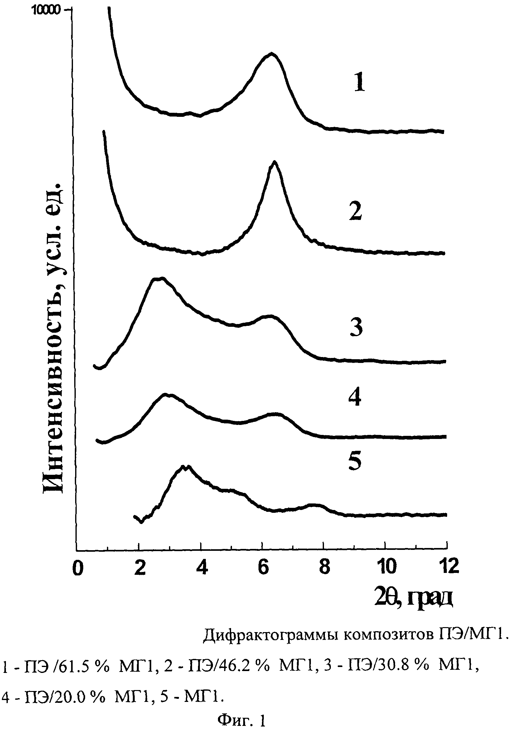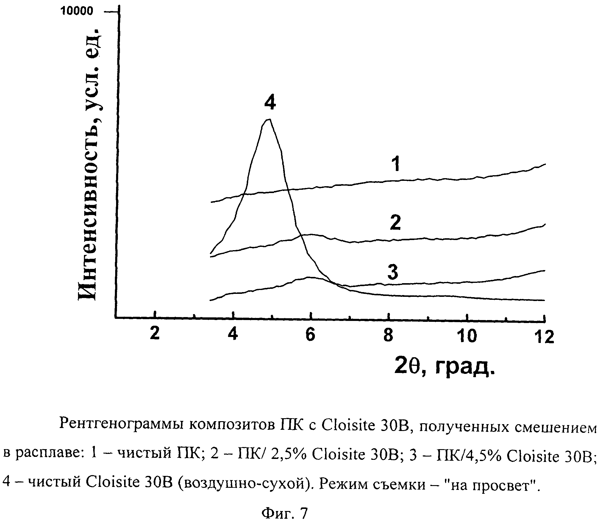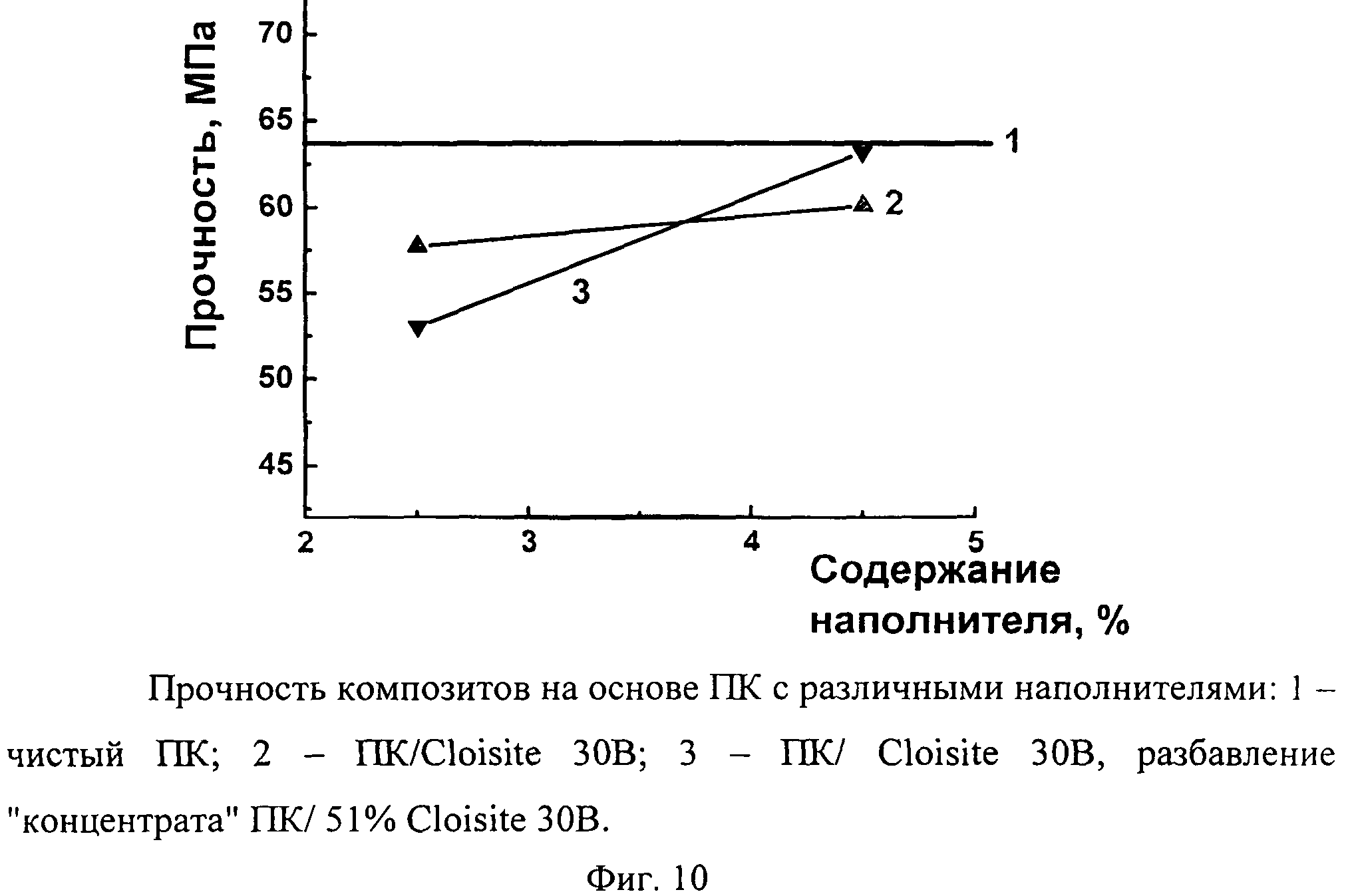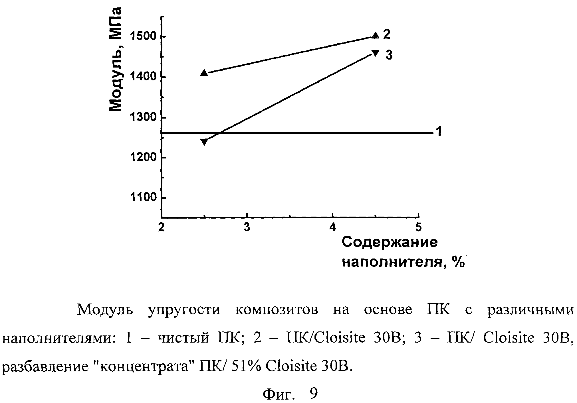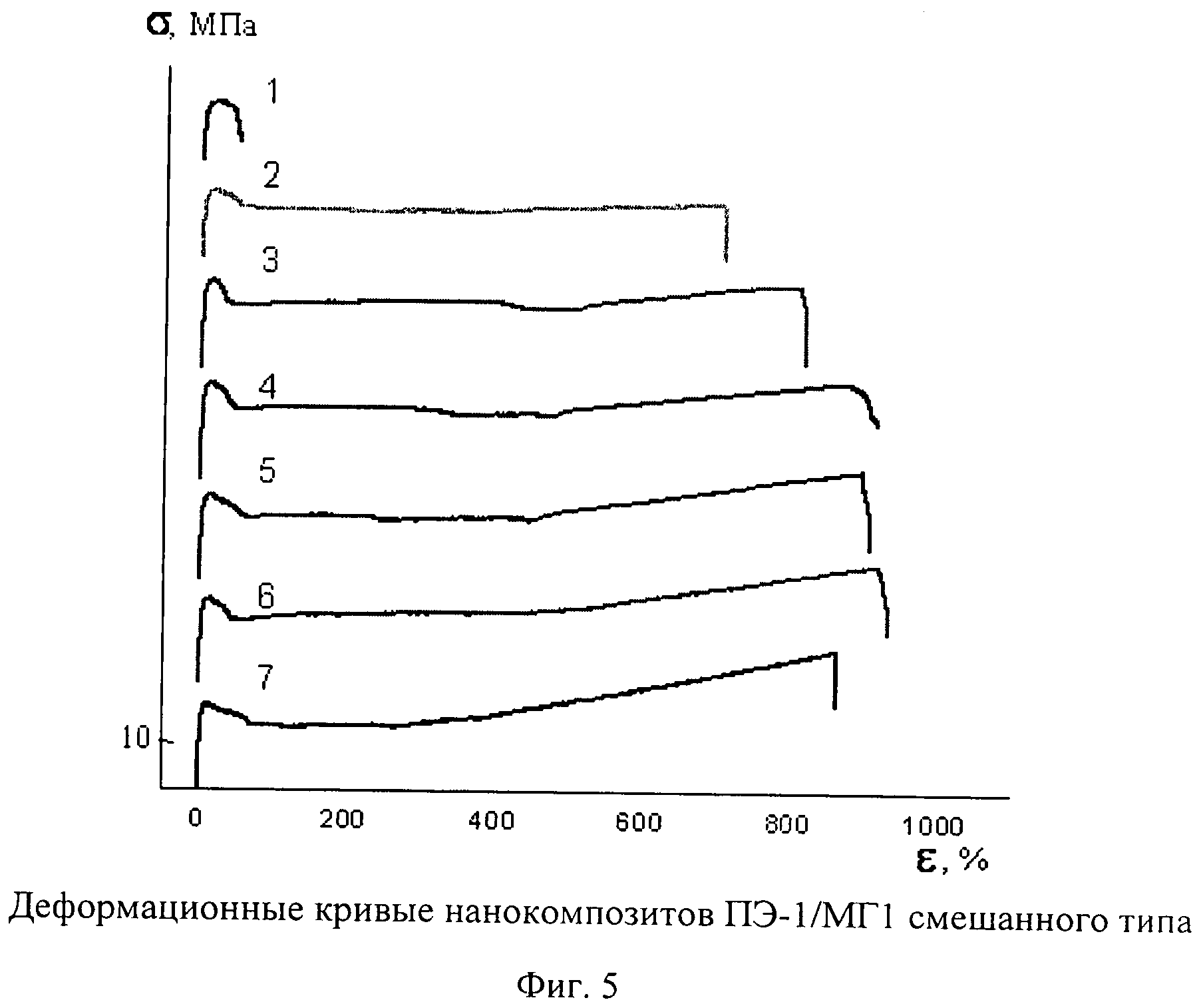 Изобретение относится к области создания нанокомпозитов на основе композиционных полимерных материалов с наноразмерными наполнителями и может быть использовано для создания материалов, применяемых, в частности, в полимерной индустрии и машиностроении. Одним из наиболее перспективных направлений развития современной химической технологии является производство и использование материалов, содержащих наночастицы, например, нанокомпозитов на основе органического полимера и неорганического нанонаполнителя - слоистого силиката. При уменьшении размеров частиц вещества до нанометрового диапазона изменяются его свойства, что объясняется высокой удельной поверхностью наночастиц. Однако высокая поверхностная энергия частиц, позволяющая в принципе получить материалы с уникальными свойствами, является в то же время препятствием для их равномерного распределения в полимерной матрице. Поэтому важнейшей задачей при получении полимерных нанокомпозитов является создание условий для раздвижения силикатных пластин и обеспечения интеркаляции полимерных цепей в межслоевые пространства с ограниченной геометрией. Для этого используют различные приемы: - модифицирование глины различными поверхностно-активными веществами (ПАВ), в том числе функционализированными (в частности, малеинизированными) полимерами (полиэтилен или полипропилен), которые, благодаря наличию функциональных групп в цепи, способны прививаться к поверхности глины; - создание высоких напряжений сдвига при смешении компонентов в расплаве и/или значительное увеличение времени их смешения; - проведение процесса расслоения (эксфолиирования) глины при твердофазном (ниже температуры плавления полимера) сдвиговом измельчении предварительно смешанного в расплаве композита. Модифицирование глины малеинизированными полимерами, как правило, применяют при использовании в качестве полимерной матрицы композита полиэтилена или полипропилена, что является определенным ограничением для первого технологического приема. Для второго - требуется использование шнеков сложной формы для создания высоких напряжений сдвига при смешении композитов в расплаве полимера. Кроме того, для каждого состава приходится проводить подбор оборудования и условий смешения для достижения эксфолиирования глины. К тому же увеличение времени смешения композитов для достижения эксфолиирования глины снижает производительность оборудования. В третьем случае проведение процесса эксфолиирования глины при твердофазном сдвиговом измельчении предварительно смешанного в расплаве композита требует больших затрат энергии и опять-таки использования специальных шнеков и оборудования высокой мощности. Известен метод получения эксфолиированных нанокомпозитов полимер/глина посредством твердофазного сдвигового измельчения (патент US №7223359). По этому методу эксфолиированные нанокомпозиты заданного состава (с низкими степенями наполнения) получают в две стадии. На первой наполнитель, предварительно модифицированный поверхностно-активным веществом - ПАВ (для улучшения совместимости с полимером), смешивают с расплавом полимера. Далее охлажденную ниже температуры плавления матрицы композицию перерабатывают в двухшнековом экструдере, в процессе чего в результате приложения больших 
