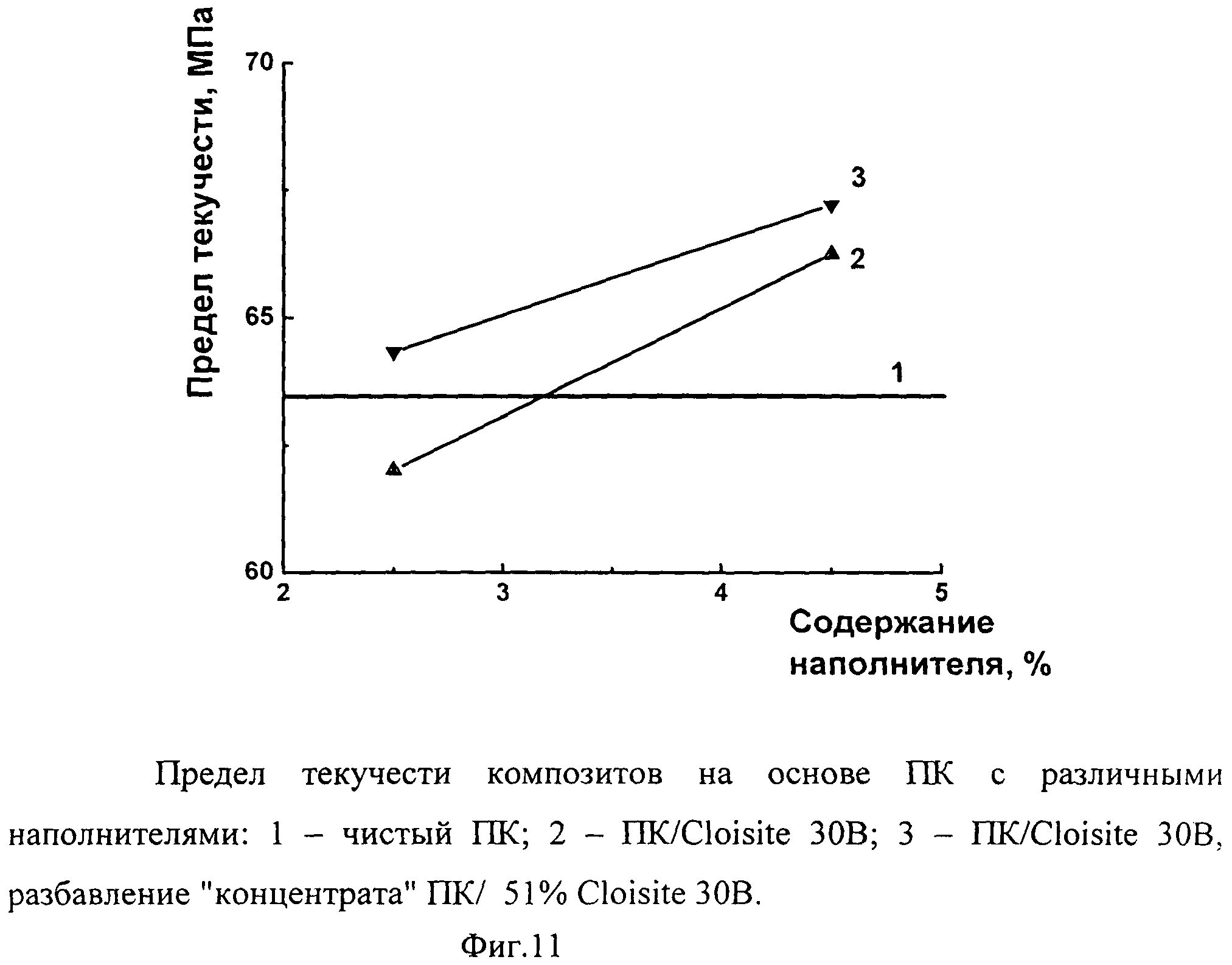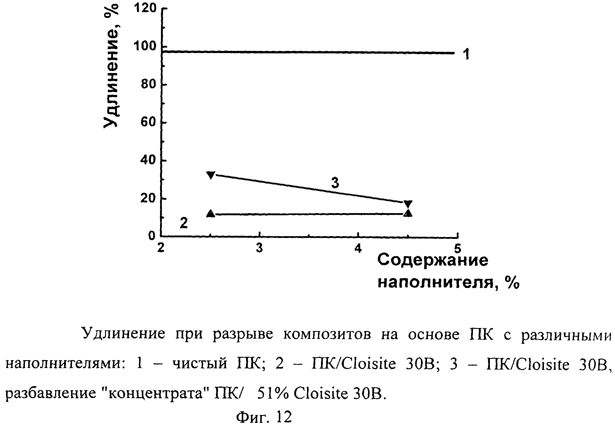 Изобретение относится к области создания композиционных полимерных материалов. Изобретение может быть использовано для создания материалов, применяемых, в частности, для упаковочных пленок с барьерными свойствами, оболочек для кабелей и других полимерных изделий, в машиностроении. Эксфолиированный нанокомпозит полимер/глина получают смешением матричного полимера и нанонаполнителя - глины, модифицированной четвертичной аммониевой солью, проводят со сдвиговым измельчением при температуре выше температуры плавления матричного полимера до концентрации нанонаполнителя 51-70% мас. Затем в полученную смесь добавляют матричный полимер до концентрации нанонаполнителя - 0,1-30% мас. Изобретение позволяет повысить эффективность эксфолиации глины, механические свойства нанокомпозита, снизить энергетические затраты на его получение. 2 табл., 12 ил., 3 пр.