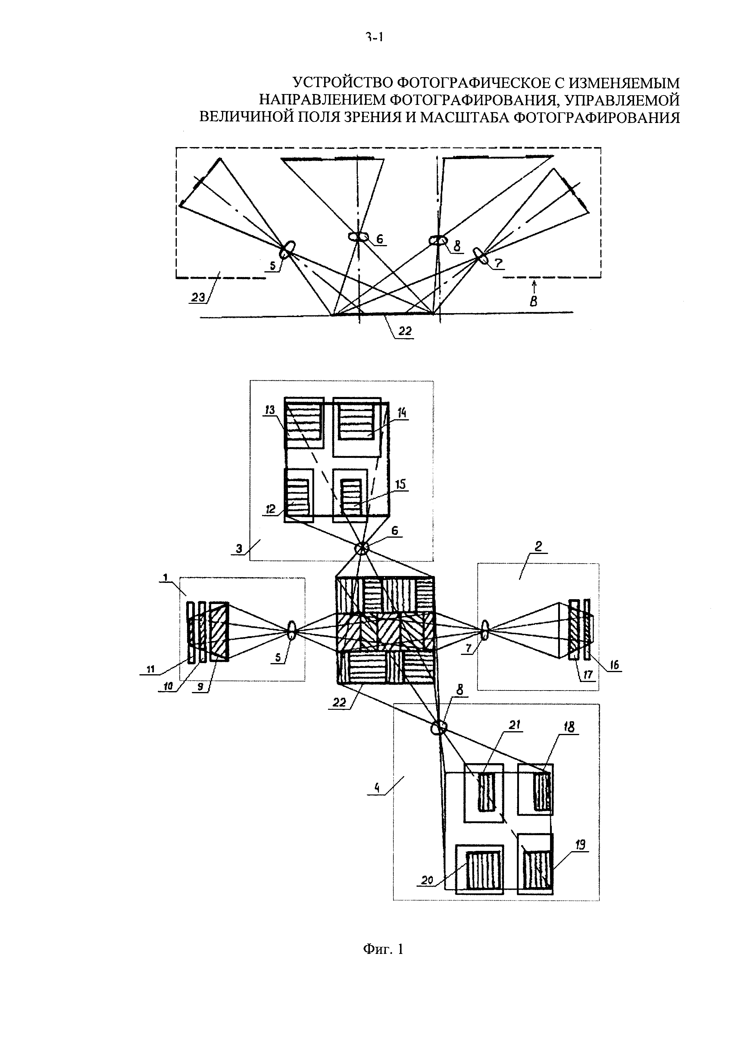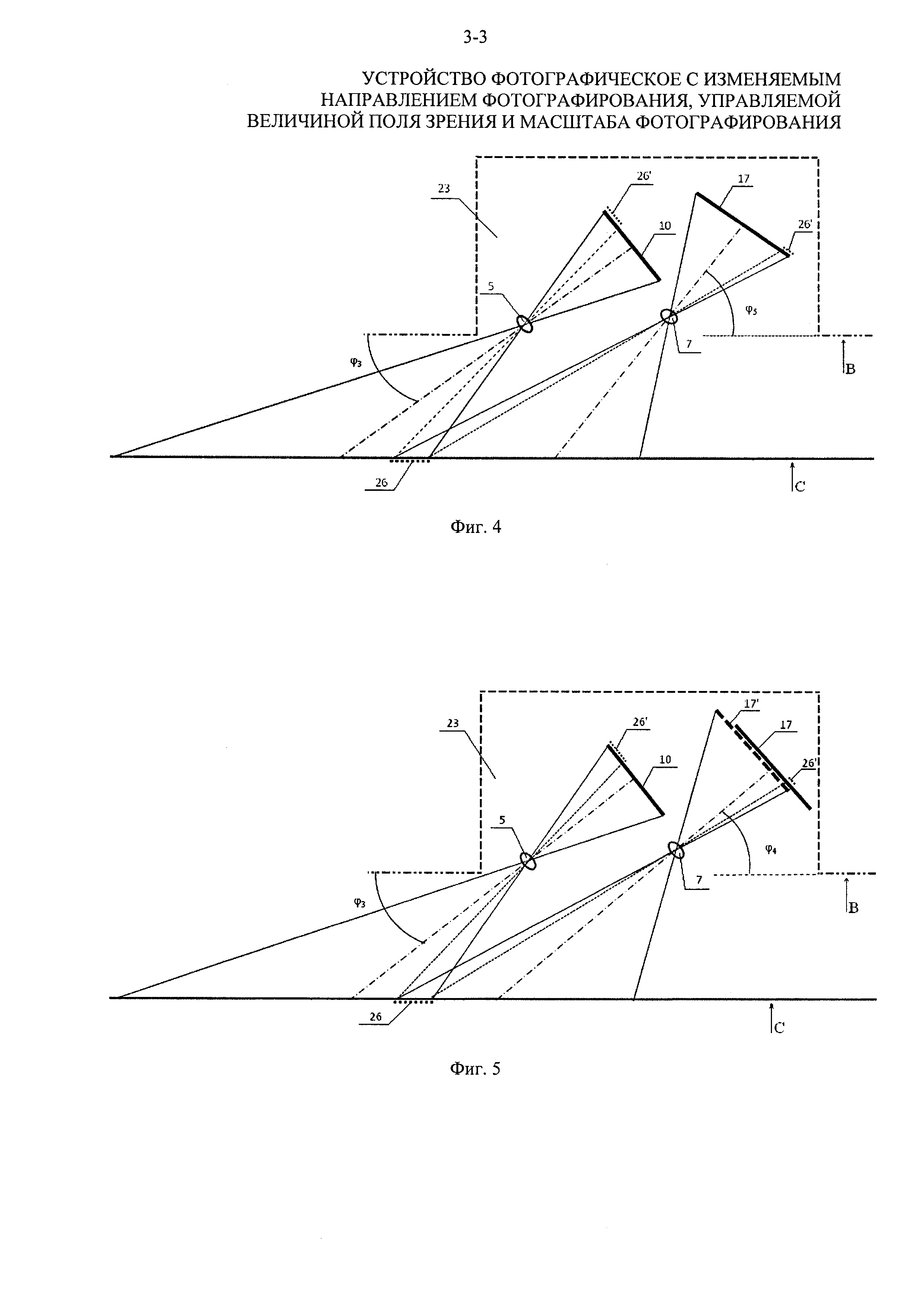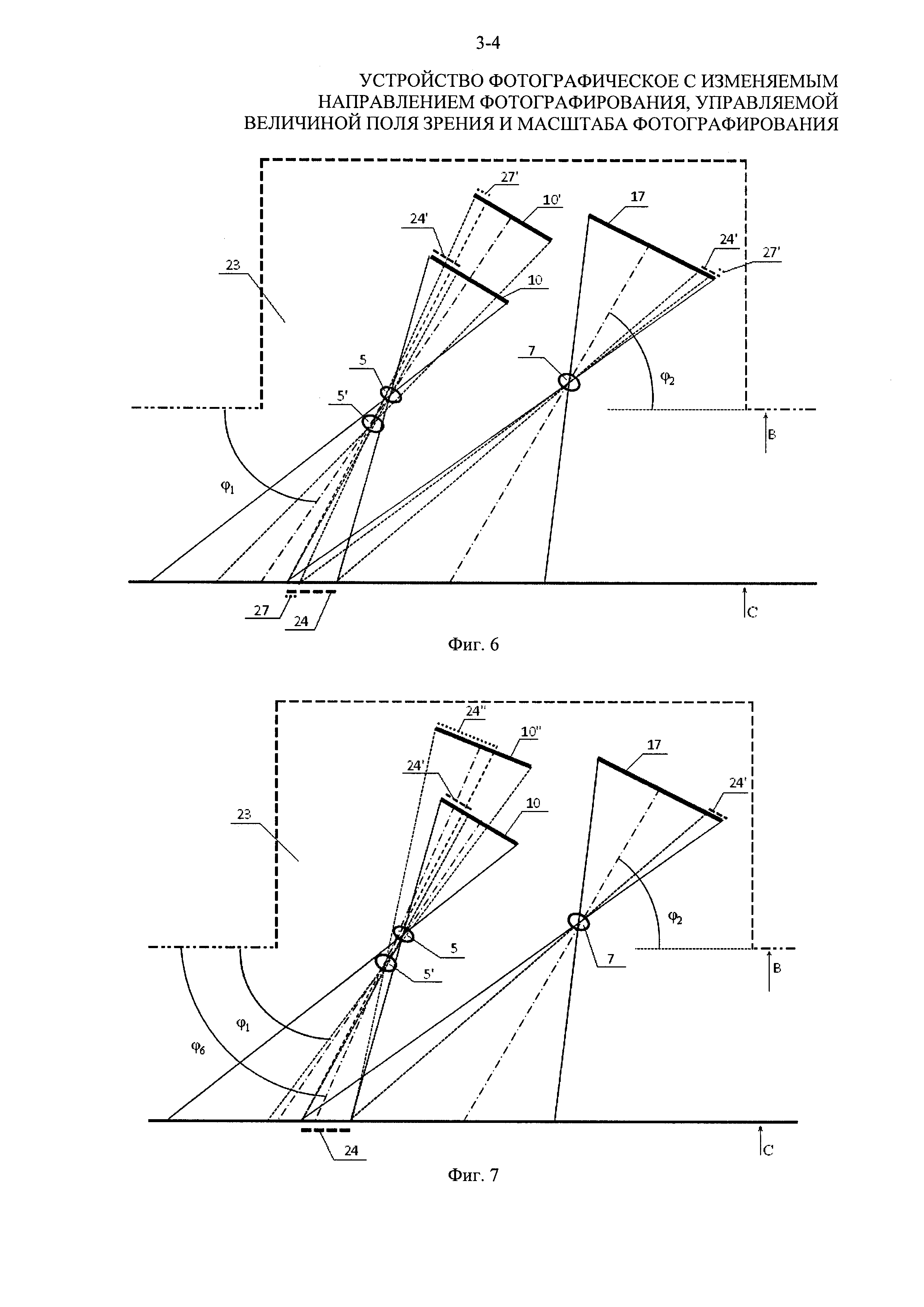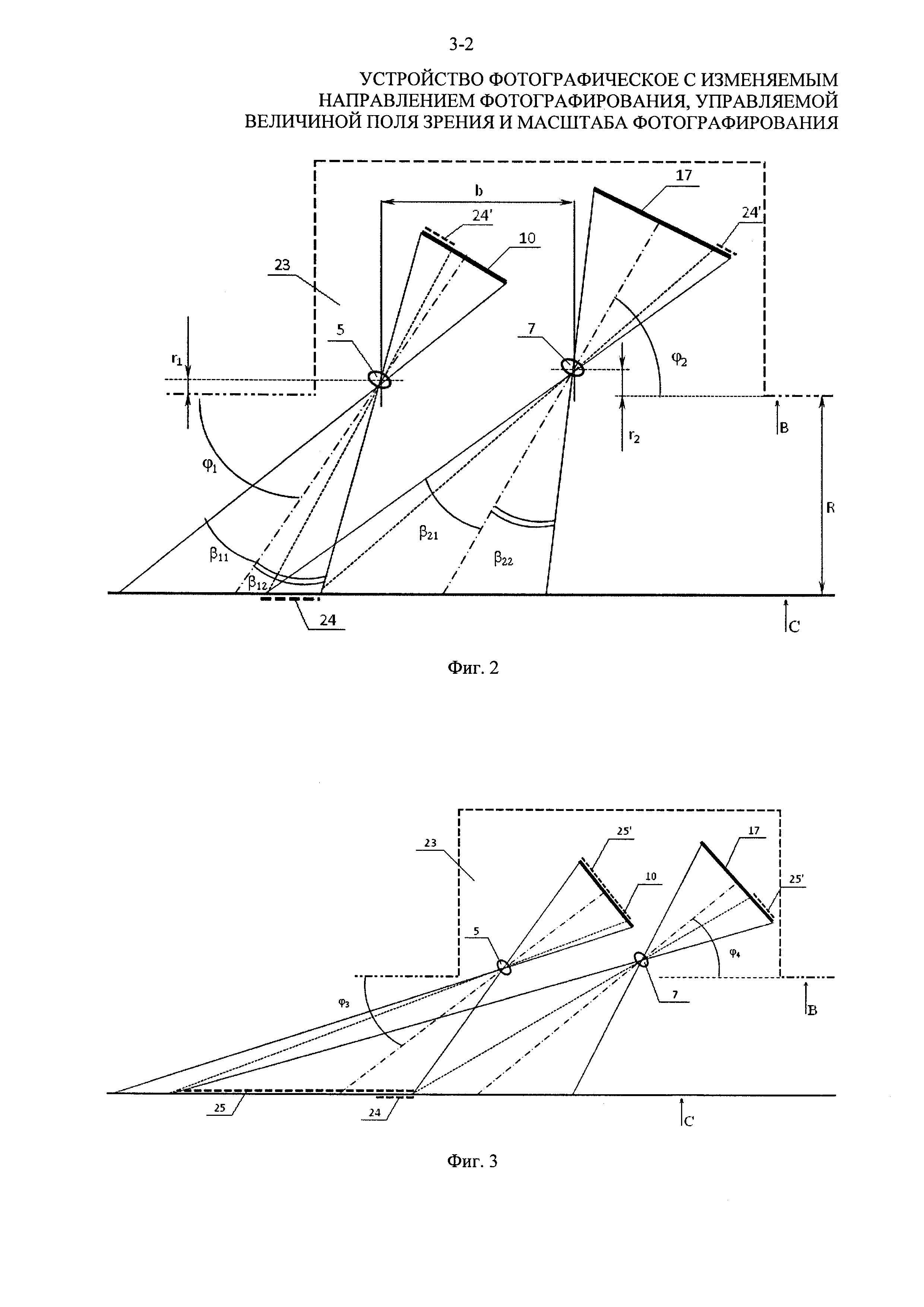 (что эквивалентно развороту всего изделия). В этом случае разность углов наклона фотокамер относительно базовой плоскости В остается равной исходной величине (φ4-φ3=φ2-φ1), поэтому также сохраняются исходные угловой размер суммарного поля зрения и угловой размер перекрытия. Однако линейный размер зоны перекрытия меняется. Зона перекрытия полей зрения соответствует участку 25 объекта 22 с проекциями этого участка 25′ на фотоприемниках 10 и 17. Для сравнения показан размер общего участка объекта 22 в зоне перекрытия 24 при исходном положении устройства (фиг. 2). Из результатов сравнения видно, что участок 25 превосходит размер участка 24, причем изображение участка 25 на фотоприемнике 10 (проекция 25′) занимает большую часть этого фотоприемника, что в ряде случаев фотографирования снижает эффективность суммирования полей зрения фотокамер.