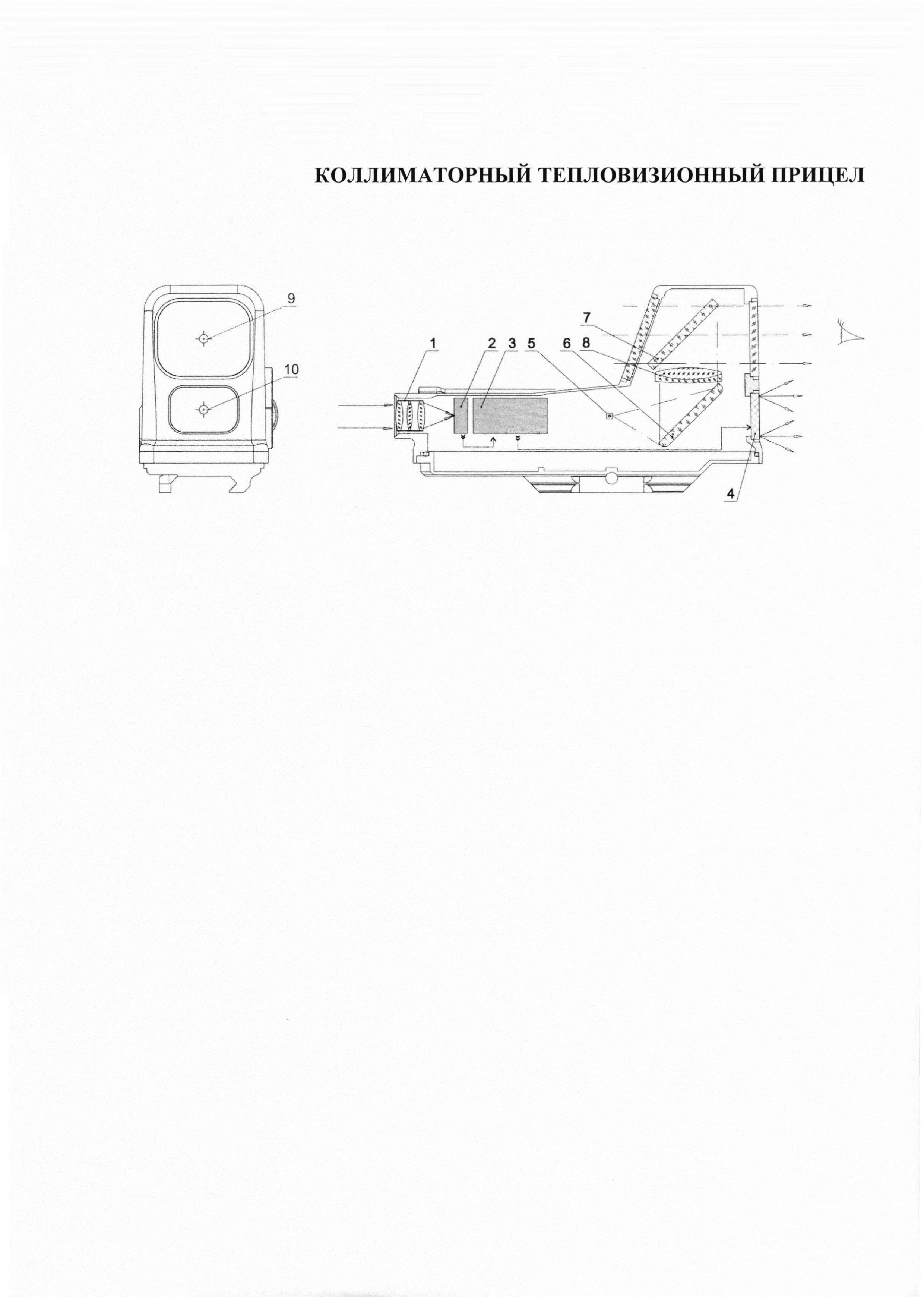 Область техники Изобретение относится к оптическому приборостроению и может быть использовано в оптических коллиматорных прицелах с целью увеличения их обнаружительной способности при наблюдении и ведении прицельной стрельбы не только в видимом диапазоне электромагнитного излучения, но и в невидимом невооруженным глазом спектральном диапазоне ближнего и дальнего инфракрасного спектра. Уровень техники Коллиматорные прицелы - оптические системы, использующие коллиматор для построения изображения прицельной метки, спроецированного в бесконечность. Излучение от источника света в прицеле преобразуется линзой коллиматора в параллельный пучок и через полупрозрачное зеркало или призму направляется в глаз наблюдателя вместе с изображением реальной сцены. Зрачок наблюдателя не должен находиться на оптической оси прицела, достаточно, чтобы он находился в пределах проекции прицела вдоль этой оси. При поперечных перемещениях глаза прицельная марка с точки зрения наблюдателя также перемещается по полю зрения прицела, оставаясь на точке прицеливания вне зависимости от положения глаза наблюдателя относительно прицела. Коллиматорный прицел обеспечивает очень высокую скорость прицеливания - примерно в 2-3 раза выше, чем традиционные. При прицеливании нет необходимости совмещать три точки - мушку, целик, цель; необходимо лишь навести прицельную марку, при этом глаз аккомодируется на расстоянии до цели (в механических прицелах - обычно на мушку, а целик и цель видны не в фокусе). Кроме того, коллиматорные прицелы имеют большие поля зрения, что дает возможность наблюдать за сценой и вести прицельную стрельбу двумя глазами на любом удалении от прицела. Разновидностью коллиматорных прицелов являются голографические прицелы, в которых мнимое изображение прицельной марки на бесконечности формируется предварительно записанной или синтезированной голограммой этой марки. Все коллиматорные прицелы не имеют увеличения для реализации достоинств их конструкции. Однако прицеливание на дальние дистанции-выше 200-300 метров - становится затруднительным. Особенности использования и применения прицелов в настоящее время требуют наблюдения сцены не только в видимом, но и в инфракрасном свете. Основные оптические материалы, из которых выполнена оптическая схема коллиматорного прицела для видимого диапазона, не прозрачны в области инфракрасного спектра от 0,8 мкм до 17 мкм. Для наблюдения в инфракрасном спектре излучения разработаны и широко применяются специализированные тепловизионные прицелы. Оптическая схема таких прицелов содержит несколько оптико-электронных приборов: объектив, фотоприемное устройство, блоки электроники, микродисплей, окуляр. Объектив для инфракрасного спектра излучения обычно выполняют из материалов, прозрачных в ИК диапазоне: монокристаллов германия, селенида цинка или сульфида цинка. Фотоприемное устройство матричного типа выполняют на базе различных чувствительных в этом диапазоне материалов, в том числе оно может быть выполнено на основе химических соединений, требующих для детектирования ИК излучения охлаждения до криогенных температур. В последнее время наиболее широко используются фотоприемные устройства на основе матрицы микроболометров в фокальной плоскости объектива, не требующие охла