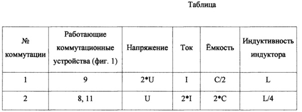 1. Согласующее устройство для индукционной нагрузки, включающее средства для подключения к источнику питания, средства для подключения к индуктору, коммутирующие элементы, первый и второй трансформаторы, при этом каждый из трансформаторов электрически связан с компенсирующими конденсаторами, отличающееся тем, что трансформаторы имеют одинаковый коэффициент трансформации, начало первичной обмотки первого трансформатора соединено с первым входом согласующего устройства, конец первичной обмотки первого трансформатора соединен с началом первичной обмотки второго трансформатора, конец первичной обмотки второго трансформатора соединен со вторым входом согласующего устройства, начало вторичной обмотки первого трансформатора подключено к первому контакту первого конденсатора, второй контакт первого конденсатора соединен с первым выходом согласующего устройства, конец вторничной обмотки первого трансформатора соединен с первым контактом первого коммутатора и первым контактом второго коммутатора, второй контакт второго коммутатора соединен со вторым выходом согласующего устройства, второй контакт первого коммутатора соединен с началом вторичной обмотки второго трансформатора и первым контактом третьего коммутатора, второй контакт третьего коммутатора соединен с первым выходом согласующего устройства, конец вторичной обмотки второго трансформатора соединен с первым контактом второго конденсатора, а второй контакт второго конденсатора соединен со вторым выходом согласующего устройства. 2. Согласующее устройство по п. 1, отличающееся тем, что трансформаторы имеют одинаковую мощность, а конденсаторы одинаковую емкость.