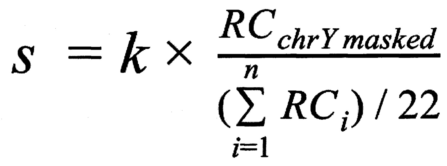 то мужским; затем производят подсчет фетальной фракции для образцов методом DEFRAG и подсчет фетальной фракции для образцов пакетом SeqFF и определяют фетальную фракцию для образцов по формуле: