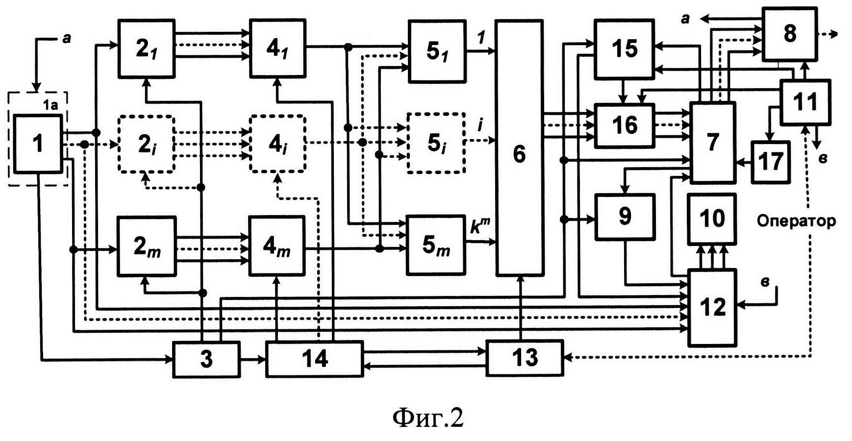 Полезная модель относится к области прикладного телевидения и может быть использована в системах телевизионной (ТВ) автоматики и автоматического регулирования, в следящих устройствах, различных системах технического зрения для определения дальности до объектов, их размеров, углового положения объектов в кадре на основе их ТВ изображений, выработки на основе углового отклонения объекта от заданного, управляющих сигналов для управления линией визирования электронной стабилизации ТВ изображений и т.д. Принципы определения параметров объектов на основе ТВ изображений нашли свое отражение в работах [1, 2]. Использование видеоинформации с ТВ камеры для вычисления параметров объектов может осуществляться в измерительной системе координат ТВ камеры Оху [3]. При этом, если х, у - измерительная система координат, центр которой О совмещен с центром рабочей поверхности матричного фотоприемника (МФП), то положение изображения центра объекта на МФП характеризуется координатами xi и yi. Если через центр МФП ТВ камеры проходит ось оптической системы, то координаты xi и yi, характеризуют угловое отклонение линии визирования объекта от оптической оси. Другими словами, текущие величины координат xi и yi характеризуют угол «рыскания» и угол «тангажа» объекта наблюдения (фиг. 1), а значения Δxi и Δyi расстояние от центра МФП до центра наблюдаемого объекта (объекта селекции). В работе [1] представлены ТВ устройства летательных аппаратов, где отражаются вопросы построения ТВ визиров или координаторов. В общем случае ТВ визир может измерять угловое отклонение объекта от оптической оси ТВ камеры в горизонтальной и вертикальной плоскостях и может осуществлять выработку сигналов управления по углу «рыскания» (влево-вправо) и углу «тангажа» (вверх-вниз) в измерительной систем координат ТВ камеры Оху. В ней также рассматриваются ТВ визиры с амплитудной, а также корреляционной обработкой видеосигналов применительно к обработке одноканальных черно-белых ТВ изображений, что является их недостатком. Это связано с тем, что необходимо использовать ТВ изображения с высокой контрастностью цели и фона. Недостаточный уровень освещенности объектов приводит к снижению уровня сигнала и контрастности ТВ изображения, что в конечном итоге влияет на точность определения координат и положения объекта в пространстве. Наиболее близким по совокупности операций и техническим признакам является устройство определения углового положения объектов заданного цвета, согласно патенту [4]. Структурная схема устройства для определения углового положения объектов заданного цвета и представляет собой ТВ автомат, имеющий блоки и узлы, включающие спектрозональную ТВ камеру, m - аналого-цифровых преобразователей (АЦП) видеосигналов, формирующих на своих выходах цифровые сигналы в n-разрядном двоичном коде и представленные в параллельном виде, первая группа m-дешифраторов сигналов, вторая группа m-дешифраторов сигналов, коммутатор выбора сигнала объектов заданного цвета, сумматор сигналов, знакогенератор, видеоконтрольное устройство (ВКУ), блоки и панель управления, исполнительное устройство, вычислительное устройство с возможностью определения углового отклонения αi объектов заданного цвета по углу рыскания (αх) и углу тангажа (αу). Принцип работы устройства заключается в