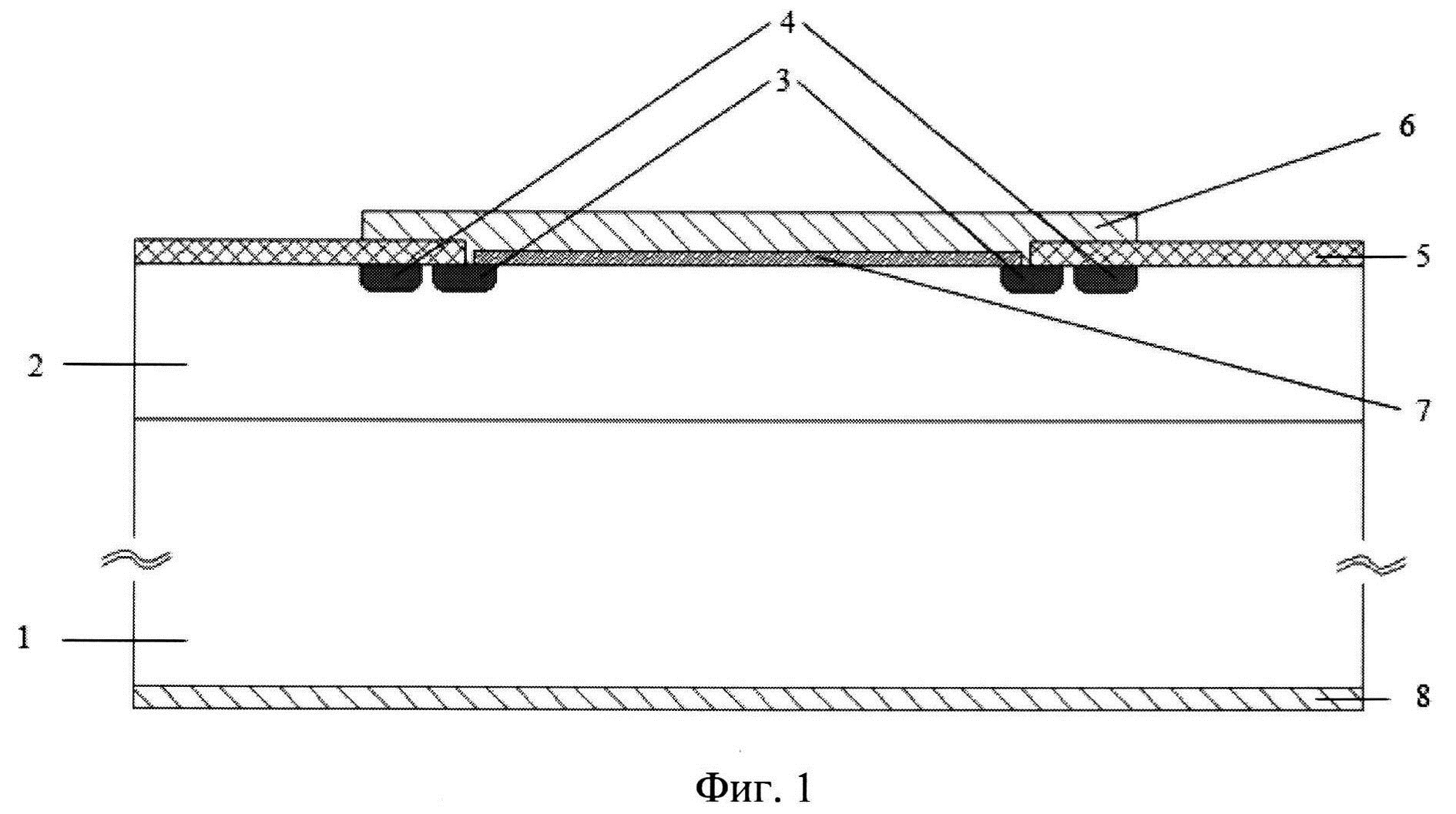 Диод с низким падением напряжения, содержащий кремниевую сильнолегированную подложку n-типа проводимости, на лицевой стороне которой расположен слаболегированный эпитаксиальный слой n-типа проводимости; слой оксида кремния, расположенный на слаболегированном эпитаксиальном слое n-типа проводимости по периметру с стороны анода; охранное кольцо р-типа проводимости, выполненное в слаболегированном эпитаксиальном слое n-типа проводимости со стороны анода под границей контактного окна слоя оксида кремния; контакт Шоттки, сформированный в пределах охранного кольца р-типа проводимости на слаболегированном эпитаксиальном слое n-типа проводимости; слой алюминиевой металлизации анода, расположенный на контакте Шоттки, отличающийся тем, что дополнительно содержит делительное кольцо р-типа проводимости, расположенное рядом с охранным кольцом р-типа проводимости с его внешней стороны на таком расстоянии от охранного кольца р-типа проводимости, что при обратном смещении области пространственных зарядов этих колец объединяются; делительное кольцо р-типа проводимости выполнено в слаболегированном эпитаксиальном слое n-типа проводимости со стороны анода; контакт Шоттки выполнен на основе слоя молибдена; устройство также содержит многослойную металлизацию катода из последовательно нанесенных на обратную сторону кремниевой сильнолегированной подложки n-типа проводимости слоев титана, молибдена и никеля, при этом охранное кольцо р-типа проводимости, делительное кольцо р-типа проводимости, слой молибдена и слой алюминиевой металлизации анода расположены соосно и имеют форму прямоугольника с закругленными углами с радиусом кривизны не менее 190 мкм.