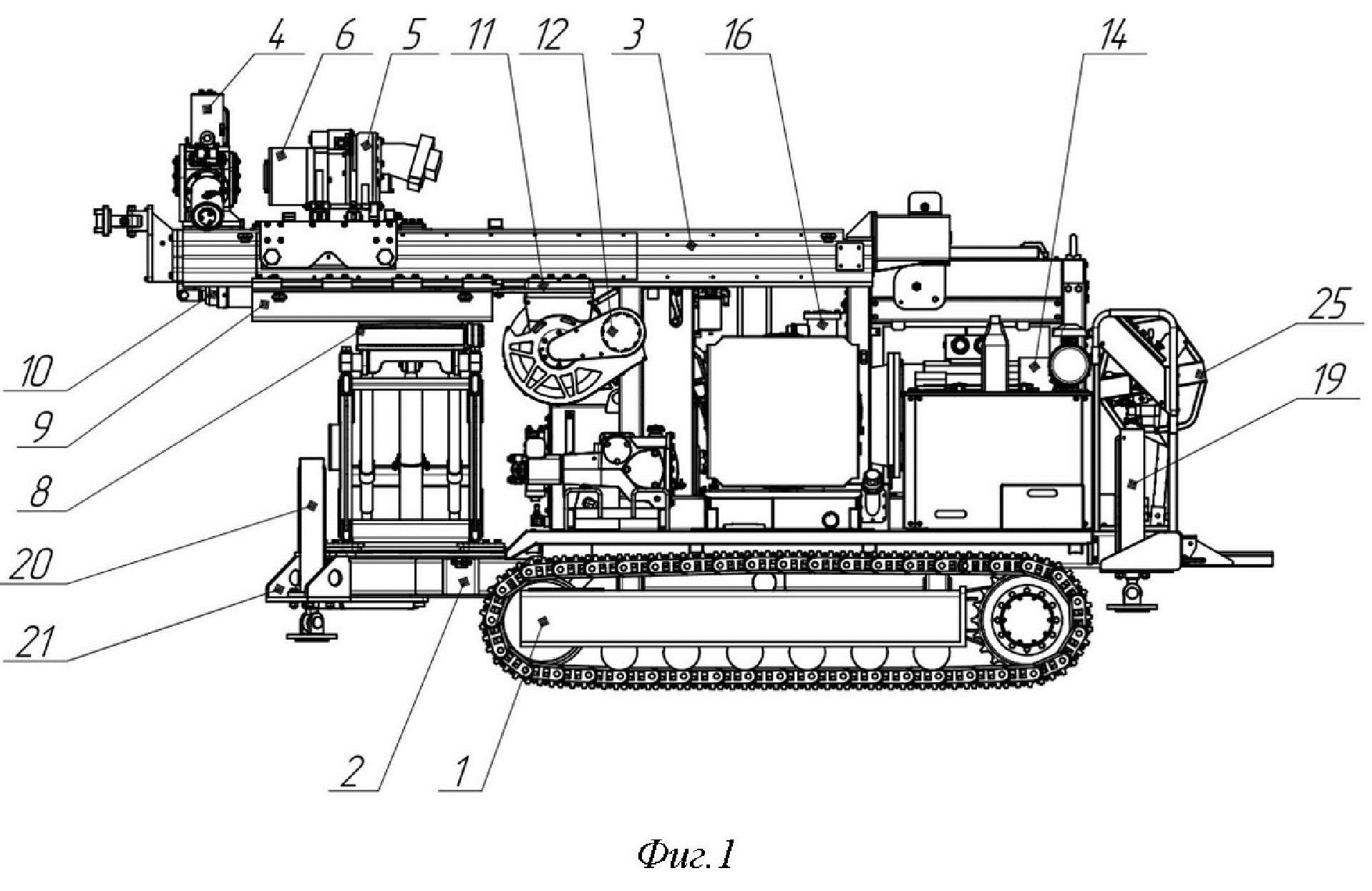 В задней левой части несущей рамы 2 буровой установки установлен модуль 17 с дизельным двигателем, обеспечивающим работу второго контура гидравлической системы для привода гусениц 1 и позиционирования мачты 3 в то время, когда установка не подключена к внешнему источнику питания. Прямо за ним находится пульт 18 управления ходом станка, а также рычаги управления задним домкратом 19 и передним домкратом 20, при помощи которых несущая рама 2 буровой установки отжимается от опорной поверхности и переводится в рабочее положение, выравниваясь в горизонтальной плоскости. При этом передние домкраты 20 установлены на поворотных кронштейнах 21, что позволяет обеспечить их отвод в сторону в том случае, когда при бурении вниз устье располагается в зоне предполагаемой точки опоры.
