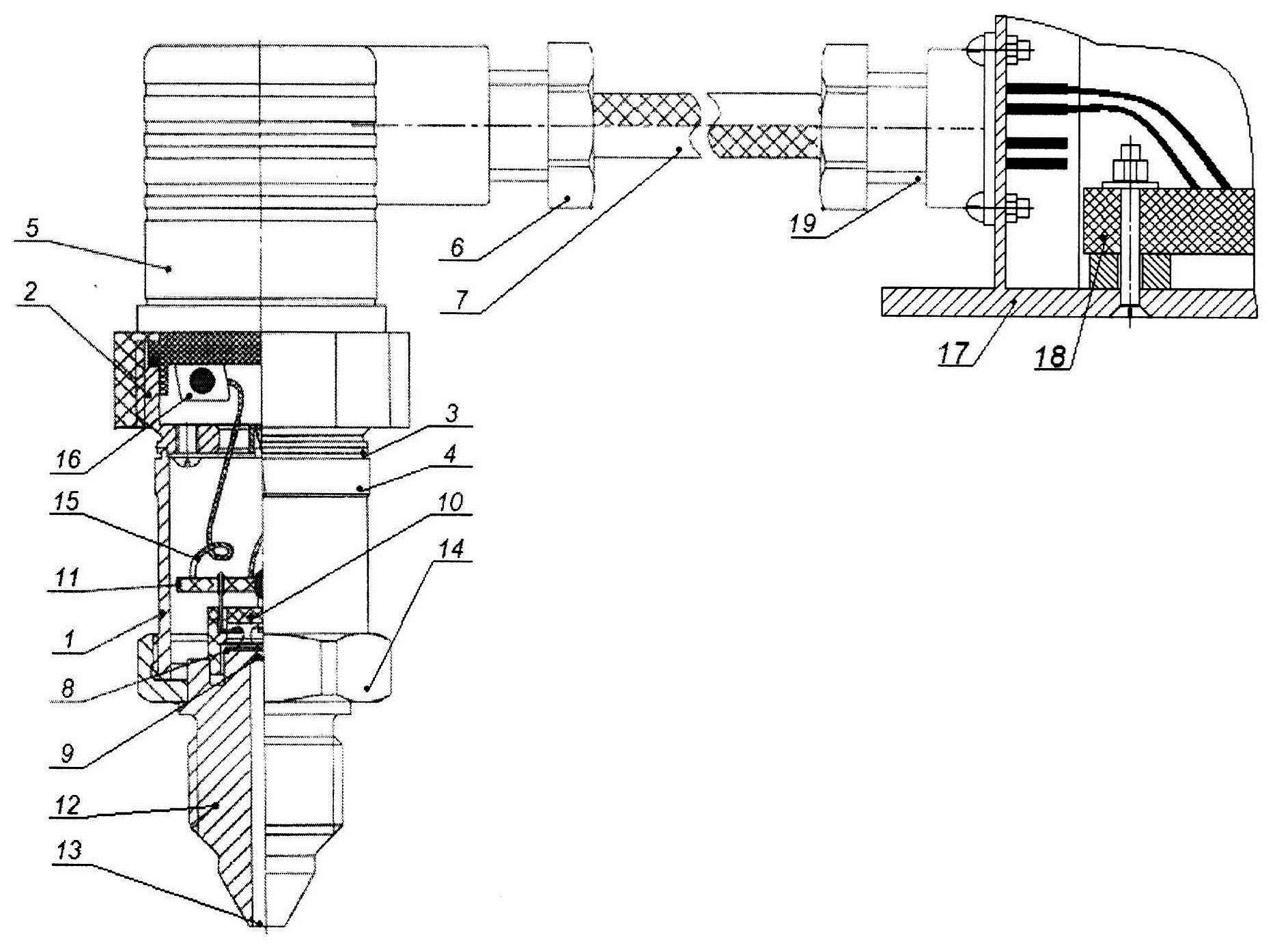 Полезная модель относится к измерительной технике и может быть использована для измерения и контроля давления газовых и жидких сред в различных областях техники. Известен тензорезистивный преобразователь давления, содержащий корпус с крышкой и размещенным на ней разъемом для подключения электрического кабеля электропитания и связи, встроенную в корпус мембрану с тензорезисторами, электронную плату для обработки сигнала, корпус дополнен штуцером с каналом подвода давления, имеющим ступенчатую наружную поверхность, причем верхняя ступень наружной поверхности цилиндрическая и имеет резьбу, а нижняя ступень наружной поверхности коническая, мембрана выполнена двухслойной, причем нижний слой мембраны является частью штуцера и изготовлен из титана, а верхний слой мембраны изготовлен из сапфира с нанесенными на него полупроводниковыми тензорезисторами, изготовленными из монокристаллического кремния, электронная плата представляет собой печатный блок измерительной цепи преобразователя, собранный на печатной плате и расположенный внутри корпуса между мембраной и крышкой, а выводы электронной платы подключены к разъему, выполненному в виде цилиндрического электрического соединителя с винтовым креплением к крышке корпуса преобразователя и гаечным креплением выходного электрического кабеля (см. патент РФ №212293, МПК G01L 9/04, опубл. 2022). Основными недостатками данной конструкции является высокая вероятность влияния температуры жидких и газовых сред на точность преобразования давления в электрический сигнал и отсутствие аппаратных средств компенсации температурной погрешности преобразования давления в электрический сигнал. Технической задачей является повышение степени защиты электронных компонентов от деструктивного воздействия температуры жидких и газовых сред, верхний предел которой может достигать 350°С, а также введение в структуру преобразователя аппаратных средств компенсации температурной погрешности преобразования давления в электрический сигнал. Техническая задача достигается тем, что высокотемпературный тензорезистивный интеллектуальный преобразователь давления, содержащий корпус с крышкой и размещенным на ней разъемом, выполненным в виде цилиндрического электрического соединителя с винтовым креплением к крышке корпуса преобразователя и гаечным креплением выходного электрического кабеля электропитания и связи, встроенную в корпус мембрану с тензорезисторами, причем корпус дополнен штуцером с каналом подвода давления, имеющим ступенчатую наружную поверхность, верхняя ступень наружной поверхности цилиндрическая и имеет резьбу, а нижняя ступень наружной поверхности коническая, мембрана выполнена двухслойной, причем нижний слой мембраны является частью штуцера и изготовлен из титана, а верхний слой мембраны изготовлен из сапфира с нанесенными на него полупроводниковыми тензорезисторами, изготовленными из монокристаллического кремния, в корпусе преобразователя над верхним слоем мембраны размещена на подложке плата с тонкопленочным платиновым терморезистором, выполняющим функцию аппаратной компенсации температурной погрешности преобразования давления в электрический сигнал, а выводы тензорезисторов и тонкопленочного платинового терморезистора сваркой присоединены к 