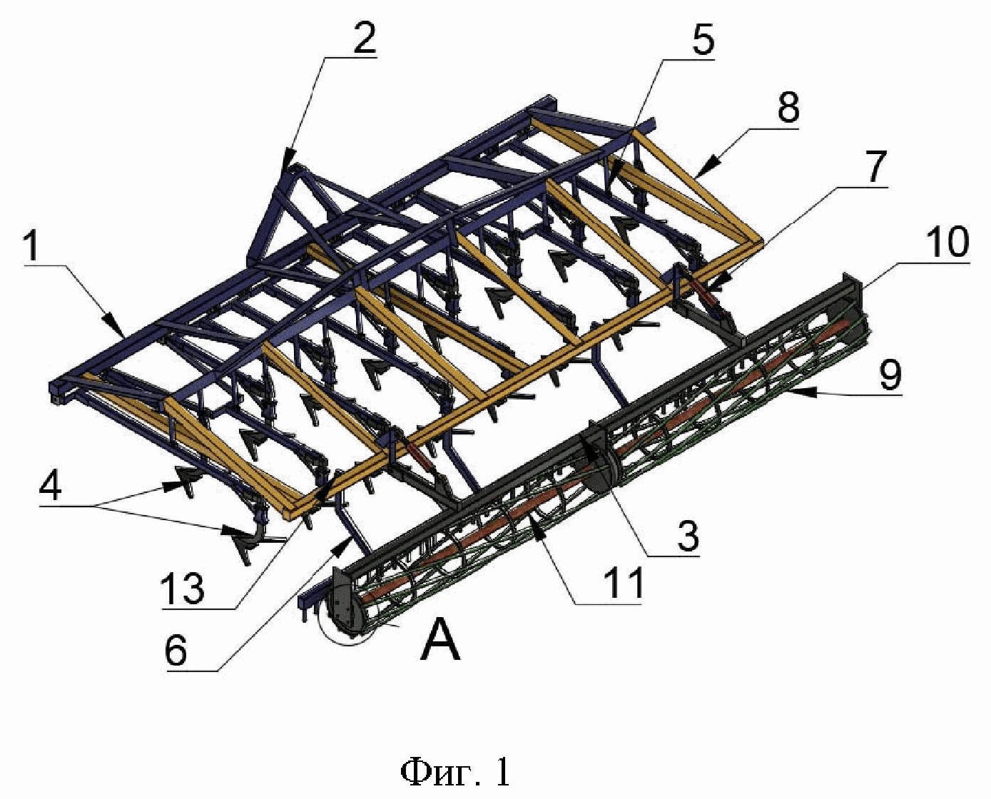 Область техники, к которой относится полезная модель Полезная модель относится к сельскохозяйственному машиностроению, а именно к устройствам для поверхностной обработки почвы, в частности к культиваторам для сплошной обработки почвы. Уровень техники Культиватор обрабатывает почву под посевы яровых, овощных и пропашных культур, необходим для обработки паровых полей, а также для предпосевного рыхления верхнего слоя почвы. Культиватор включает несущую раму с навесным устройством и двумя опорными катками, два ряда универсальных стрельчатых лап, закрепленных на пружинных стойках, две секции игольчатых граблин. На раме культиватора жестко установлено навесное устройство, опорный каток с механизмами регулировки глубины обработки почвы. Секции игольчатых граблин установлены под углами атаки с перекрытием зоны рыхления. Такое сочетание рабочих органов обеспечит подготовку почвы с наименьшими затратами энергии и повышении качества выполняемой работы. Соседние рабочие органы в последовательных по ходу движения рядах установлены с перекрытием. Культиватор включает несущую раму и дополнительную для опорных катков, состыкованных через шарниры поверх основной рамы. Грабли установлены на дополнительной раме на шарнирах, рядом установлены цепи для плавной регулировки рабочего наклона граблин. Применение полезной модели позволит повысить качество поверхностной обработки почвы. Известен культиватор для сплошной обработки почвы (см. инф. лист. А.О. "Красный Аксай". Культиватор прицепной широкозахватный КПК-8,0. Ростов-на-Дону. 1999. - 2 с.), включающий секционную раму, опорно-транспортные колеса, механизм регулировки и управления, рабочие органы (рыхлительные лапы, позади которых размещен присоединенный к раме уплотняюще-рыхлительный каток). К недостаткам известного культиватора для сплошной обработки почвы следует отнести то, что при обработке почвы в весенне-летний период, а именно - в период предпосевной обработки и во время ухода за паром, на дневную поверхность обрабатываемого поля выносится значительное количество влажной почвы, влага которой в течение 2-х часов полностью испаряется. Вынос влаги этим культиватором происходит из-за ряда технологических и конструктивных недостатков, которые приводят к интенсивному нависанию пожнивных остатков и части подрезанных сорняков, которые даже при наличии устройств для вибрации неудовлетворительно сбрасываются со стоек. Известен культиватор навесной комбинированный КНК-4, содержащий раму, опорные колеса, навесное устройство, механизм регулировки глубины обработки почвы, два ряда стрельчатых лап, один ряд дисков и катки. Стойки стрельчатых лап жестко прикреплены к раме (https://agrocentr-ug.ru/technics/kultivator-navesnoy-kombinirovannyiy-knk-4-knk-4k). Недостатком данного культиватора является низкое качество обработки почвы задним финишным оборудованием - дисками и катками, что приводит к снижению качества выравнивания поверхности, неравному распределению растительных остатков и удалению сорняков. Известен культиватор для поверхностной обработки почвы [RU 155209 U1, А01В 35/00 (2006.01), 27.09.2015], содержащий раму, на которой установлены ходовая часть с вращающейся опорой на почву, механизм регулировки глубины обработки почвы, рыхлительные рабочие органы в виде стрельчатых лап, почвообрабатывающие катки, представляющ