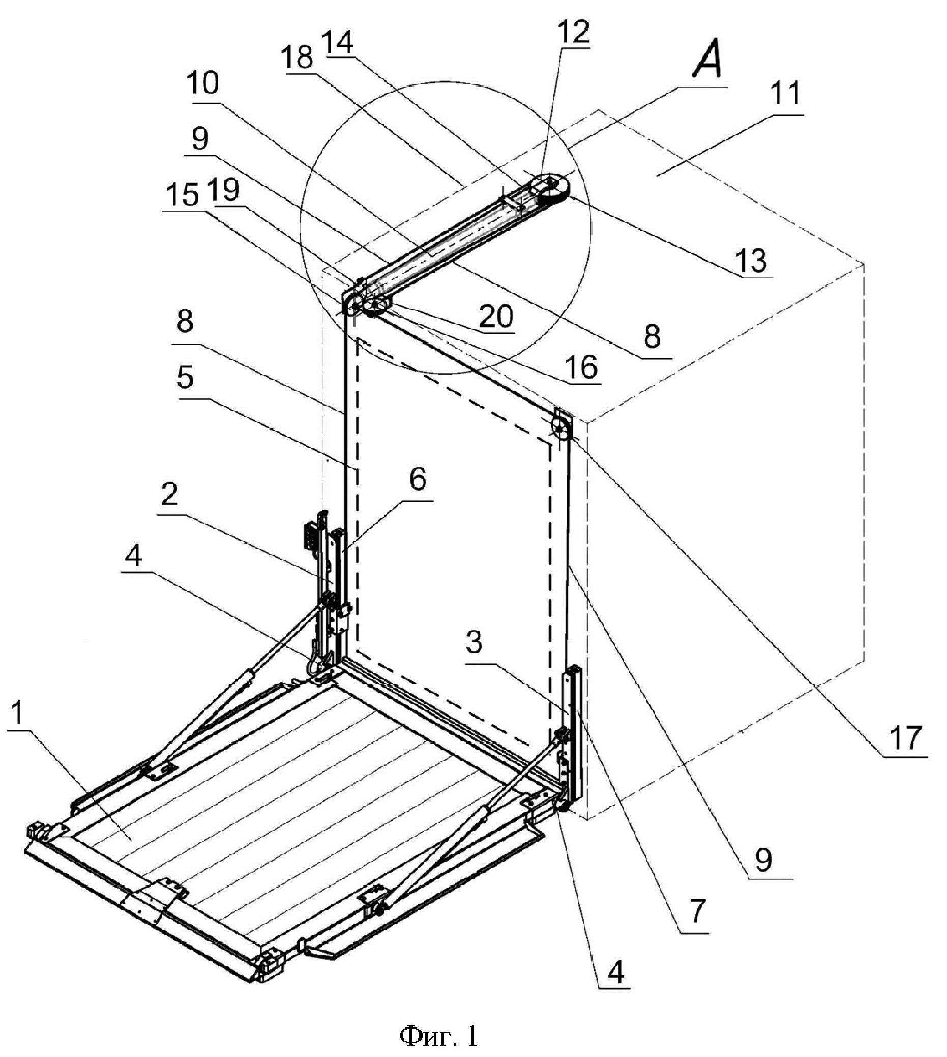 Полезная модель относится к грузовому транспорту, а именно к погрузочно-разгрузочным устройствам, устанавливаемым на транспортных средствах: автомобилях и прицепах, и может применяться для погрузки животных. Известно погрузочно-разгрузочное устройство транспортного средства, содержащее установленные на платформе вертикальные стойки с горизонтальными перекладинами, средство захвата и перемещения груза (См. Хмелев О.А. Погрузоразгрузочное устройство транспортного средства. Патент РФ на полезную модель № 76606. Опубликовано: 27.09.2008.) Недостаток указанного устройства в том, что погрузка животных с его помощью может производиться только в клетках, что ограничивает возможности устройства. Известно транспортное средство с грузоподъемным задним бортом, содержащее кузов, оборудованный в задней части вертикальными трубчатыми направляющими, на которых посредством тяг и ползунов закреплен задний борт, имеющий привод перемещения по направляющим, средство снабжено связанными с ползунами ходовыми винтами, размещенными внутри направляющих, и установленными в задней части кузова горизонтальным и двумя вертикальными валами, снабженными на концах зубчатыми колесами для взаимодействия друг с другом, при этом верхние концы ходовых винтов снабжены зубчатыми, колесами, зацепленными с зубчатыми колесами вертикальных валов, а горизонтальный вал связан с приводом (См. В.А. Гуткин, В.И. Крюковский и М.Н. Григорьев. Транспортное средство с грузоподъемным задним бортом. А.С. СССР № 626994, опубл. 05.10.78, бюл. № 37). Данное транспортное средство может быть использовано для перевозки животных без клеток, поскольку включает в себя подвижную платформу в виде перемещающегося по вертикали откинутого заднего борта. Недостатком указанного транспортного средства является сложность механического привода, включающего в себя ходовые винты и зубчатые колеса, требующие смазки в условиях постоянной запыленности, что ведет к росту расходов на обслуживание и ремонт. Известно транспортное средство с грузоподъемной платформой, содержащее кузов с проемом в задней стенке, в котором размещена несущая рама, с вертикальными направляющими для перемещения по ним грузоподъемной платформы посредством привода и трособлочной системы, причем грузоподъемная платформа прикреплена с несущей раме шарнирно, транспортное средство снабжено канатной лебедкой и системой блоков, огибаемых канатом для прикрепления свободного конца к верхней части грузоподъемной платформы, при этом задняя стенка кузова выполнена наклонной наружу от вертикали (См. А.И. Власов, С.Ш. Рутфайн, А.М. Бабак, В.М. Лобанов, В.И. Холодов, А.И. Садомов, В.К. Семенов. Транспортное средство с грузоподъемной платформой. А.С. СССР № 806495, опубл. 23.02.81, бюл. №7). Недостаток данного транспортного средства состоит в том, что его задняя стенка кузова должна быть наклонной, вследствие чего устройство подъема и опускания платформы не может быть применено на автомобилях и прицепах с вертикальной задней стенкой кузова. Известен грузоподъемный борт транспортного средства, преимущественно автомобиля, оборудованного кузовом-фургоном, содержащий подвижную посредством привода, включающего силовой цилиндр, грузонесущую площадку, связанную с ползунами, установленными в вертикальных направляющих, закрепленных в задней част
