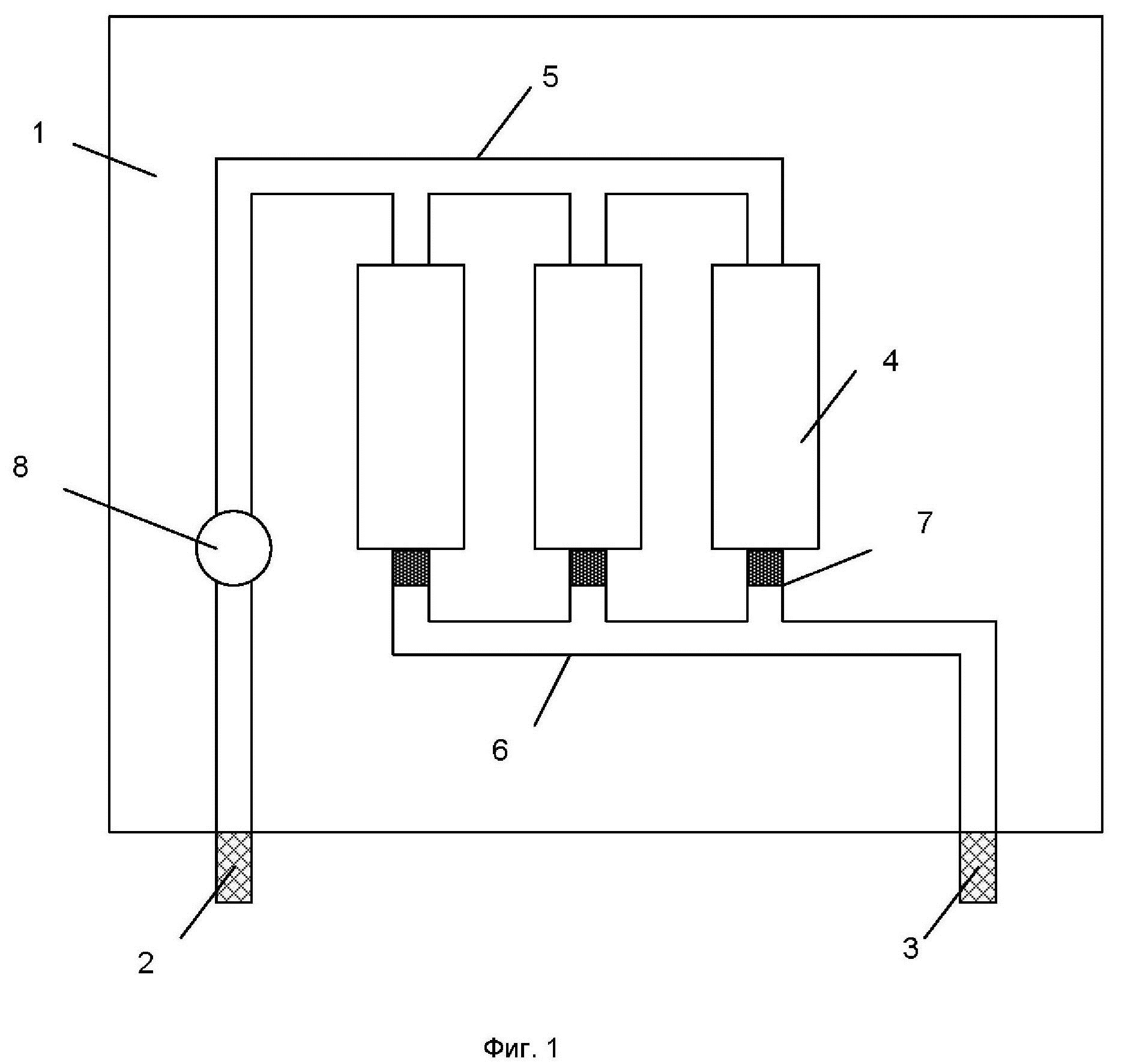 1 - корпус; 2 - узел подачи исходного газа на озонирование; 3 - узел выхода озона; 4 - реактор генерации озона; 5 - трубопровод подачи исходного газа на озонирование; 6 - трубопровод подачи озона; 7 - датчик концентрации озона; 8 - безмасляный компрессор.