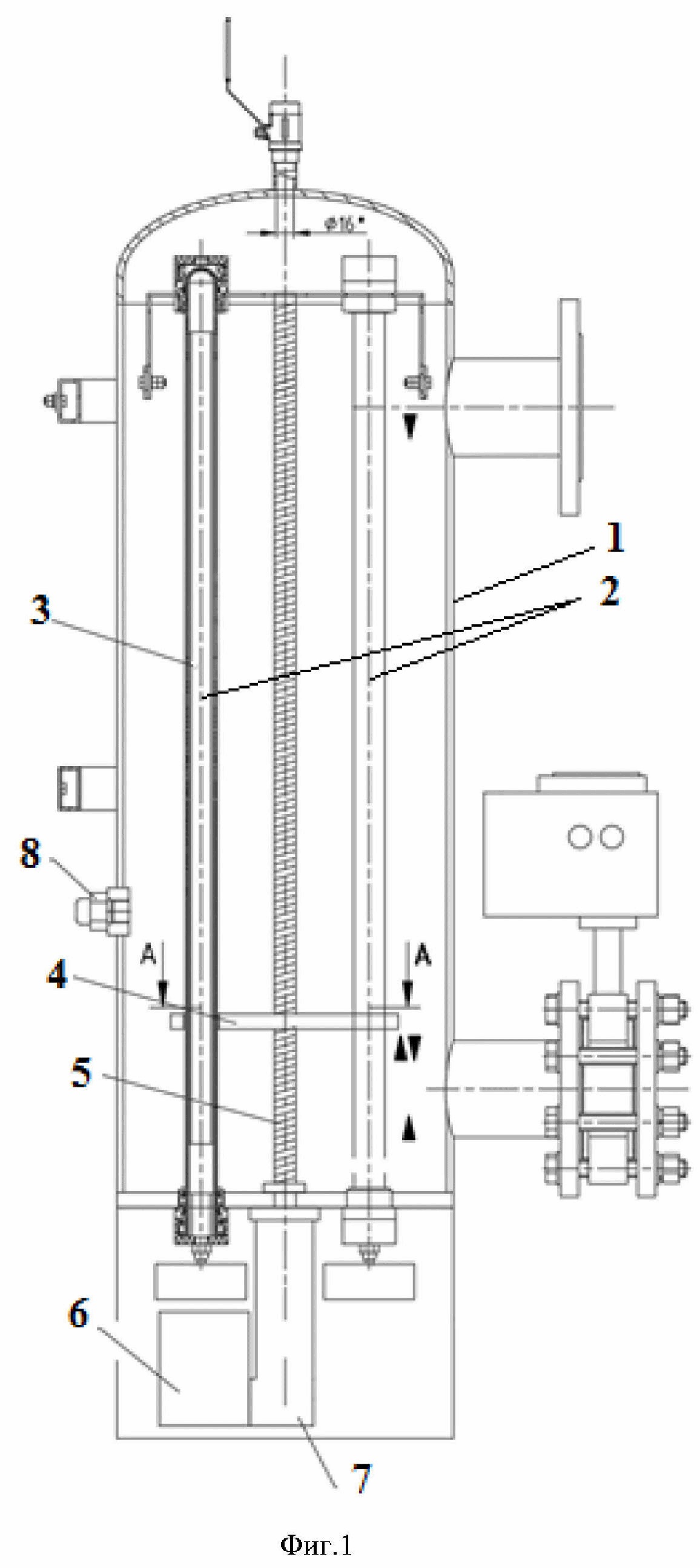 Полезная модель относится к устройству обеззараживания воды (сточной, балластной и пр.) или иной жидкости, инфицированной патогенной микробной флорой, в заданном объеме (расходе) при помощи бактерицидного ультрафиолетового (УФ) облучения. Для обеззараживания воды используются три метода: химический, физический и комбинированный. Физические методы дезинфекции воды делятся на термический метод, метод обработки УФ-излучением и метод дезинфекции ультразвуком. Метод обеззараживания УФ-излучением основан на способности излучения приводить к фотохимическим реакциям в структуре молекул ДНК и РНК, следствием чего является их необратимые повреждения. Известен способ, где в зависимости от необходимой бактерицидной мощности определяют количество источников УФ-излучения и размещают их равномерно в пространстве или объеме обеззараживаемой среды, при этом энергию подают к источнику УФ-излучения от внешнего источника электрической энергии, а источники УФ-излучения размещают таким образом, чтобы изолировать их от контакта с обрабатываемой средой (ист. «Водоснабжение Санкт-Петербурга», под. Ред. Ф.В. Кармазинова, СПб.: «Новый журнал», 2003 г.). В настоящее время существуют УФ-облучатели, в основе которых используются газоразрядные лампы (например, УОВ 11W Philips, GPH356T5L-17W Full Sun, T5L10W Wonder Light) и имеющие промышленное применение для очистки воды установки с погружными источниками УФ-излучения, которые состоят из корпуса, в котором размещены УФ-лампы, заключенные в защитные, светопрозрачные для УФ-излучения, трубки. Недостатком таких устройств является низкий срок службы, а также снижение эффективности обеззараживающего воздействия УФ-излучения из-за поглощающих УФ-излучение загрязнений защитных трубок. Для обеспечения требуемого качества очистки необходимо своевременно проводить профилактические работы по промывке трубок от загрязнений. Задачей и техническим результатом заявленной полезной модели, направленным на повышение качества обеззараживания воды, является создание устройства, лишенного указанных недостатков. Технический результат достигается тем, что предлагается устройство обеззараживания воды, включающее корпус в котором размещены УФ-излучатели, заключенные в защитные, светопрозрачные для УФ-излучения, колбы и механизм очистки поверхности колб, содержащий профилированный скребок, выполненный с возможностью перемещения его по направляющей вдоль поверхности защитных колб, отличающееся тем, что дополнительно содержит датчик УФ-излучения, связанный с механизмом очистки поверхности колб от поглощающих УФ-излучение загрязнений. Сущность полезной модели поясняется чертежами: фиг. 1 - схема устройства обеззараживания воды и пример исполнения механизма очистки с профилированным скребком, выполненным с возможностью перемещения по винтовой направляющей, вращающейся при помощи электродвигателя; фиг. 2 - пример выполнения профилированного скребка с возможностью перемещения по винтовой направляющей, где 1 - корпус; 2 - УФ-излучатели; 3 - защитные колбы; 4 - профилированный скребок; 5 - направляющая; 6 - электродвигатель; 7 - редуктор, 8 - датчик УФ-излучения; 9 - зубчатые колеса. Очистка защитных колб осуществляется по мере их загрязнения и определяется автоматически на основании данных датчика УФ-излучения, от которого поступает сигн