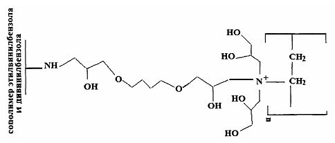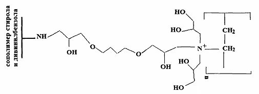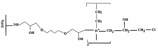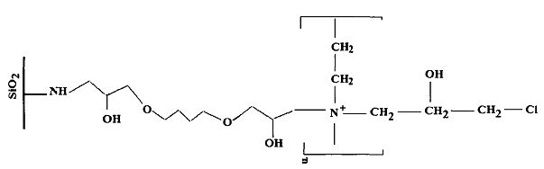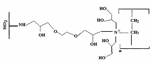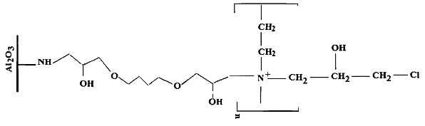 Изобретение относится к новому анионообменному материалу на основе полимеров либо неорганических оксидов, который может быть использован в ионной хроматографии в качестве сорбента для одновременного определения органических и неорганических анионов с повышенной эффективностью, позволяющий произвести селективное разделение смеси свыше десяти анионов, в частности, для анализа воды, почвы и других объектов на содержание анионов. Для анионообменных сорбентов удерживание функциональных ионогенных групп на матрице может осуществляться посредством различных механизмов: электростатического или гидрофобного взаимодействия, с использованием адгезионного прикрепления («приклеивания»). В известных из литературы способах модифицирования матриц водорастворимыми полимерами для получения так называемых полиэлектролитных сорбентов обычно реализуется вариант электростатического закрепления. Известны полиэлектролитные анионообменные сорбенты на основе матриц, представляющих собой силикагель, модифицированных водорастворимым полимером, содержащим в цепи положительно заряженные четвертичные аммониевые группы (O.V. Krokhin, A.D. Smolenkov, N.V. Svintsova, O.N. Obrezkov, O.A. Shpigun, Modified silica as a stationary phase for ion chromatography. // J. Chromatogr. A. 1995. V.706. P.93-98). Для их приготовления матрицу - оксид кремния марки Silasorb C8 - смешивали с додецилбензилсульфоновой кислотой (для создания отрицательного заряда на поверхности матрицы). Затем проводили модифицирование водорастворимым полимером, содержащим положительно заряженные четвертичные аммониевые группы в цепи - например, раствором поли(N-этил-4-винилпиридиния бромида) или поли(диметилдиаллиламмония хлорида). Удерживание водорастворимого полимера осуществляется за счет электростатических взаимодействий между отрицательно заряженной поверхностью матрицы и положительно заряженными четвертичными аммониевыми группами в цепи полимера. Одним из достоинств полиэлектролитных сорбентов является их высокая эффективность, обусловленная тем, что при таком подходе к синтезу отсутствует диффузия анионов вглубь частицы матрицы, что приводит к отсутствию размывания хроматографических пиков. Другим важным преимуществом является их хорошая селективность, которая зависит от структуры используемого водорастворимого полимера и может легко варьироваться при выборе подходящего ионена, то есть полимера, содержащего четвертичные атомы азота в цепи. Однако существенным недостатком полиэлектролитных сорбентов является их невысокая стабильность, которая приводит к постепенному снижению ионообменной емкости в результате изменения конформации электростатически закрепленного водорастворимого полимера, а также его постепенного смывания с поверхности матрицы. Известны полиэлектролитные анионообменные сорбенты на основе полимерных матриц, представляющих собой сополимер стирола и дивинилбензола, модифицированный водорастворимым полимером, содержащим в цепи положительно заряженные четвертичные аммониевые группы (Касьянова Т.Н., Смоленков А.Д., Пирогов А.В., Шпигун О.А. Полиэлектролитные сорбенты для ионной хроматографии на основе полистирол-дивинилбензольной матрицы. // Сорбционные и хроматографические процессы. 2007. Т.7. Вып.1. С.52-59). Способ их получения включает получение отрицательно заряженной поверхности матрицы сульф