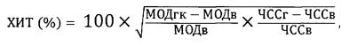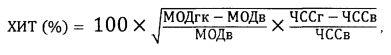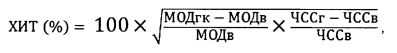 где МОДв - минутный объем дыхания в исходном состоянии при дыхании обычным воздухом, л/мин.; МОДгк - минутный объем дыхания л/мин при гиперкапнии для уровня 7.5 об. % углекислого газа в составе вдыхаемого воздуха; ЧССв - частота сердечных сокращений в исходном состоянии, уд./мин при дыхании обычным воздухом; ЧССг - частота сердечных сокращений, уд./мин при гипоксии для уровня 11 об. % кислорода в составе вдыхаемого воздуха; при величине ХИТ в интервале 28-38% включительно делают заключение о хорошей тренированности спортсмена, за пределами указанного интервала - о недостаточной тренированности спортсмена в видах спорта, связанных с циклической аэробной мышечной деятельностью, сопровождающейся волевыми задержками дыхания; при величине ХИТ в интервале 44-58% включительно делают заключение о хорошей тренированности спортсмена, за пределами указанного интервала - о недостаточной тренированности спортсмена в видах спорта, связанных с циклической аэробной мышечной деятельностью без волевых задержек дыхания; при величине ХИТ в интервале 62-78% включительно делают заключение о хорошей тренированности спортсмена, за пределами указанного интервала - о недостаточной тренированности спортсмена в видах спорта, связанных с ациклической мышечной деятельностью с резкими изменениями мощности нагрузки силовой или скоростной направленности.
