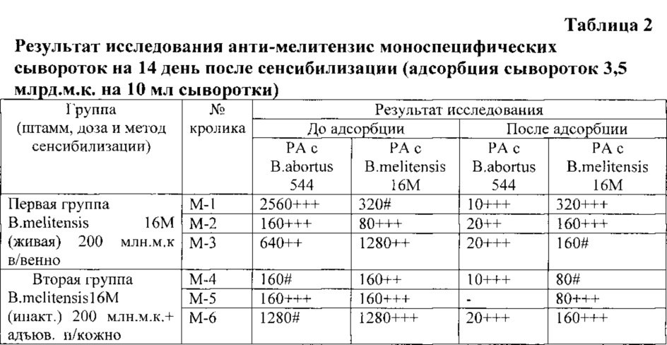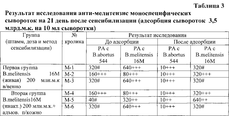 Изобретение относится к ветеринарии, к диагностике инфекционных болезней, а именно к дифференциации возбудителей бруцеллеза. Бруцеллез - инфекционная болезнь животных, представляющая большую опасность и для людей. Существуют различные возбудители бруцеллеза. Среди сельскохозяйственных животных наиболее распространены бруцеллы видов abortus и melitensis. Но наиболее опасным как для животных, так и людей является возбудитель бруцелл вида melitensis (В.melitensis). В этой связи принципиально важно в случае возникновения вспышки бруцеллеза объективно установить вид возбудителя, так как от этого существенно зависит выбор оптимальной схемы противобруцеллезных мероприятий. В этой связи наиболее актуальным является получение эффективной бруцеллезной моноспецифической сыворотки anti-melitensis. Известно, что для дифференциации возбудителей бруцеллеза в бактериологической диагностике в качестве одного из основных методов используют антивидовые моноспецифические бруцеллезные сыворотки. От уровня их чувствительности зависит надежность видовой дифференциации бруцелл. Кроме того, практически важны простота и безопасность их получения. В литературе давно известен принцип получения бруцеллезных моноспецифических (монорецепторных) антивидовых диагностических сывороток по определенной схеме, преследующей достижение высокого уровня антител за счет многократной гипериммунизации животных-продуцентов (кроликов) культурами вирулентных штаммов бруцелл, с последующей адсорбцией полученных сывороток взвесью бруцелл гетерологичного вида, с целью удаления общих для них антител (Вершилова П.А. Биохимическая и серологическая дифференциация группы Brucella и ее значение в эпидемиологии / Архив биологических наук, 35, сер. Б, 2 М., 1934; Кириллов Л.В. Получение монорецепторных сывороток // В кн. Биологические и химиотерапевтические ветеринарные препараты / М., 1963. С. 366-371.; Иванов Н.П. Бруцеллез животных и меры борьбы с ним/ под ред. Т.С. Сайдулдина - Алматы, 2007. - 433 с). Недостатками этого принципа получения бруцеллезной моноспецифической сыворотки являются трудоемкость внутривенного метода, высокая себестоимость конечного продукта за счет получения сыворотки только при однократном взятии крови, а также эпидемическая опасность, связанная с использованием в процессе производства живых вирулентных штаммов бруцелл. Наиболее близким техническим результатом является способ получения бруцеллезной моноспецифической сыворотки anti-melitensis (патент RU №2104031 C1 от 10.02.1998 г. A61K 39/10). Способ получения моноспецифических сывороток для дифференциации возбудителей бруцеллеза, включающий внутривенную иммунизацию кроликов разовой дозой штамма B.melitensis 28 в дозе 2,8-3,0×108 КОЕ в 1 мл физиологического раствора, обескровливание животных через 5-7 дней, инактивацию сыворотки при 60-65°C в течение 1-1,5 часов и перекрестную абсорбцию сыворотки бактериальной массой штамма В.abortus 544, выращенной в течение 70-72 ч., центрифугированной, охлажденной в течение 24-26 ч. и разбавленной физиологическим раствором, при концентрации абсорбирующей бактериальной массы в 3,5-3,7×109 КОЕ на 10 мл сыворотки) с последующим добавлением к готовой сыворотке раствора фенола и фасовку. Недостатками этого способа являются трудоемкость процесса, эпидемическая опасность, связанная с использованием живой культуры бруцелл вида meliten