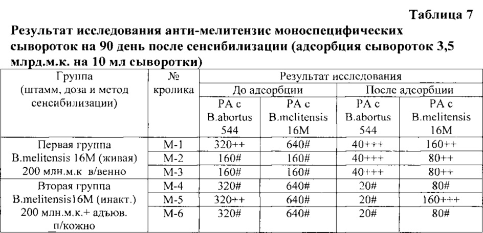 Изобретение относится к области медицины, а именно к ветеринарии и иммунологии, и может быть использовано для получения бруцеллезной моноспецифической сыворотки. Для этого проводят иммунизацию кроликов разовой дозой штамма В. melitensis. Иммунизацию кроликов проводят подкожно в область подгрудка суспензией в объеме 1 мл, представляющую собой смесь: 200 млн. м.к. инактивированной культурой штамма В. melitensis16М с адъювантом MONTANIDE™ ISA 61 VG. На 14-16 день проводят пробное крововзятие, а на 21-45 дни осуществляют трехкратное взятие крови и на 60 день обескровливают. Получают сыворотку и инактивируют при 60-65°С в течение 1-1,5 часа. Проводят перекрестную адсорбцию бактериологической массой штамма В. abortus 544, полученной путем выращивания культуры в течение 70-72 ч. Центрифугируют с охлаждением осадка в течение 24-26 часов, добавляя к осадку физиологический раствор для получения бактериальной массы в количестве 3,5-3,7×10КОЕ на 10 мл сыворотки. Далее инкубируют при 37°С в течение 2 часов и восстанавливают сыворотку путем центрифугирования с дальнейшим консервированием и фасовкой. Использование данного способа позволяет использовать инактивированную культуру бруцелл с получением моноспецифической сыворотки, а также брать кровь от каждого кролика минимум четырехкратно, повышая количество получаемой сыворотки. 2 пр., 8 табл.