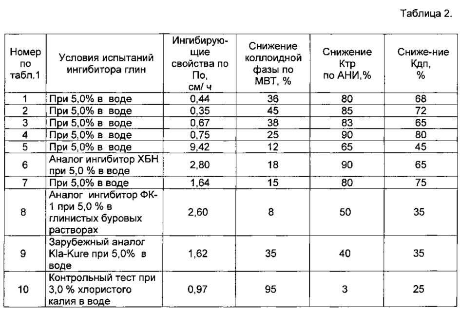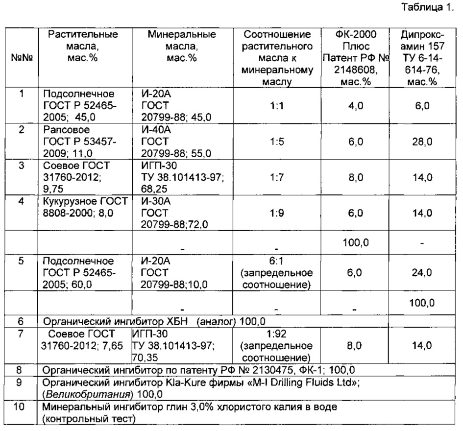 Изобретение относится к бурению нефтяных, газовых и геологоразведочных скважин, а именно к органическим ингибиторам глин для буровых растворов. Известны органические ингибиторы глин марок ГКЖ-10 (натриевые соли этилсилантриола), ГКЖ-11 (натриевые соли метилсилантриола, ТУ 6-02-696-76), ГКЖ-11Н (метилсиликонат натрия, ТУ 2229-276-05763441-99) для обработки буровых растворов, которые применяются в качестве гидрофобизирующей добавки для предотвращения диспергирования и гидратации глин в буровых растворах. Продукты представляют собой высокощелочные водно-спиртовые растворы с узким концентрационным диапазоном применения от 0,01 мас. % до 0,35 мас. % и высоким гидрофобизирующим эффектом, приводящим в ряде случаев при бурении глинистых пластов к загущению, флокуляции и дестабилизации буровых растворов. Известен органический ингибитор глин марки ATREN SL (натриевая соль сульфированного битума), который выпускается по ТУ 2458-009-63121839-2010 и применяется для предотвращения диспергирования и набухания глин сланцев. Зарубежный аналог Soltex - сульфанат натрия нефтяного битума или калиевая соль сульфированного битума сокращает крутящий момент, улучшает смазывающие свойства и укрепляет жесткость глинистой корки. Концентрационный диапазон применения продуктов на основе сульфированного битума составляет от 15,0 мас. % до 35,0 мас. % к объему бурового раствора. Эффект ингибирования этими продуктами состоит в поверхностном экранировании путем скрепления неустойчивых глинистых сланцев. Известна органическая смазочная добавка, обладающая ингибирующими свойствами по отношению к глинам, для обработки буровых растворов, которая содержит: 5,0 мас. % до 65,0 мас. % растительного масла, содержащего не более 20,0 мас. % насыщенных триглицеридов; 30,0 мас. % до 90,0 мас. % фосфатидного концентрата растительных масел, содержащего не более 20,0 мас. % насыщенных триглицеридов и остальное воду. Эффективность реагента оценивают по влиянию на технологические, смазочные и ингибирующие свойства буровых растворов в интервалах температур от 20 до 200°С. Приготовленная ингибирующая смазочная добавка обеспечивает улучшение ингибирующих свойств на 40-120%. При этом достигается снижение показателя фильтрации бурового раствора на 30-50%. Таким образом, техническим результатом является улучшение ингибирующих, смазочных и фильтрационных параметров бурового раствора (СМАЗОЧНАЯ ДОБАВКА ДЛЯ БУРОВЫХ РАСТВОРОВ ФК-1. Патент РФ, №2130475, МПК C09K 7/02, заявка №98100378/03 от 20.01.1998 г., дата публикации: 20.05.1999г). Аналогом органического ингибитора глин является смазочная добавка для буровых растворов, включающая жирные кислоты триглицеридов с числом углеродных атомов от 14 до 24 в количестве 50-80 мас. %, нейтрализующий агент (гидрат окиси калия или натрия) в количестве 3-6 мас. %, полиэтиленгликолевый эфир моноизононилфенола с 6-12 мономерными звеньями в радикале в количестве 5-30 мас. % и воду. Указанная органическая добавка марки ФК-2000 Плюс может быть использована для всех видов буровых растворов в качестве смазочной добавки к буровым растворам на водной основе для снижения трения, крутящего момента и величины поверхностного натяжения водного раствора в 4-5 раз (СМАЗОЧНАЯ ДОБАВКА ДЛЯ БУРОВЫХ РАСТВОРОВ. Патент РФ №2148608, МПК C09K 7/02, заявка №99108243/03 от 27.04.1999 г, дата публикации: 10.05.2000. Бюл. №13). Смазочная добавка ФК-2000 Плюс выпускается по ТУ 245