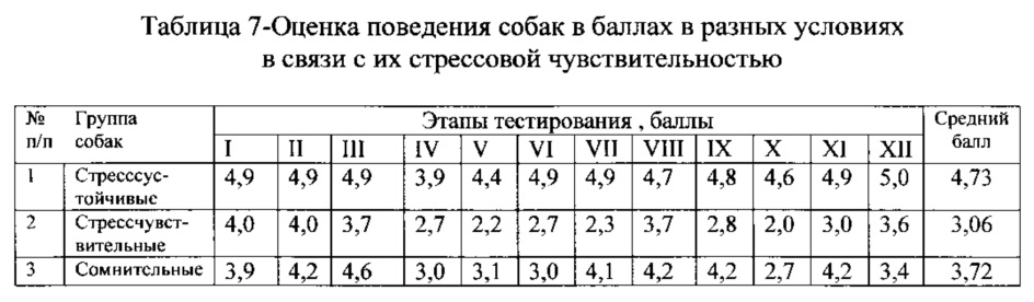 Изобретение относится к служебному собаководству, в частности к оценке рабочих качеств собак при их отборе для обучения. Способ включает установление степени стрессовой чувствительности собак на воздействие раздражителя. В качестве раздражителя используют 50-60%-ный очищенный скипидар на вазелиновом масле в дозе 0,050-0,075 мл. Скипидар вводят внутрикожно в середину наружной поверхности ушной раковины животных. Через 24-72 ч оценивают местную реакцию на введение препарата. При утолщении ушной раковины на 5,1 мм и более, диаметре припухлости 36,3 мм и более, повышении местной температуры кожи на 1,2°C и более собак относят к животным с низкими рабочими качествами. При отсутствии местной реакции или проявлении ее в слабой форме - утолщение ушной раковины не более 1,8 мм, диаметр припухлости не более 12,0 мм, при повышении температуры кожи не более 0,4°C собак относят к животным с высокими рабочими качествами. При местной реакции со средними признаками - утолщение кожной складки до 4,1 мм, диаметре припухлости до 23,4 мм, повышении местной температуры кожи до 1,0°C собак относят к особям с низкими рабочими качествами. Способ позволяет проводить быстрое тестирование и объективно оценивать рабочие качества собак при их отборе для обучения. 2 пр., 8 табл.