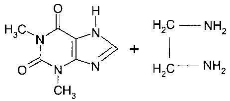 Изобретение относится к области органической химии, а именно к способу получения фармакопейного эуфиллина (аминофиллина). Известен способ получения эуфиллина, по которому смешивают теофиллин с этилендиамином (см. https://ru.wikipedia.org/wiki/Эуфиллин). Недостатком известного способа является то, что полученный по известному способу продукт нестабилен при хранении, кроме того, прямое смешение теофиллина и этилендиамина имеет ряд технологических недостатков вследствие физико-химических свойств этилендиамина, являющихся едкой летучей жидкостью. Технический результат, на достижение которого направлено изобретение, заключается в получении эуфиллина фармакопейного качества с длительным сроком хранения, производство которого является менее опасным. Технический результат достигается распылением спиртового раствора этилендиамина на теофиллин при перемешивании, с последующей выдержкой под вакуумом и одновременной сушкой смеси от спирта изопропилового. Полученный по предлагаемому способу продукт отвечает нормам и требованиям Государственной Фармакопеи и может быть использован в производстве лекарственных бронхолитических средств. Сущность способа получения эуфиллина заключается в получении эуфиллина (аминофиллина) формулы путем смешения теофиллина и этилендиамина. В смеситель загружается (180,0-220,0) кг теофиллина, на который при перемешивании распыляется предварительно полученный спиртовый раствор этилендиамина (10,0-12,0 л спирта изопропилового и 30,0-35,0 кг этилендиамина). Масса перемешивается в течение 1 часа, затем выдерживается под вакуумом в течение 1,5 часов при охлаждении. Одновременно происходит сушка смеси от спирта изопропилового. Затем масса анализируется на содержание этилендиамина и прозрачность раствора. Прозрачность раствора - опалесценция раствора не должна превышать опалесценцию эталонного раствора II. Содержание этилендиамина должно быть (13,5-15,0)% в пересчете на безводное вещество. Далее эуфиллин просеивается через вибросито и передается на стадию упаковки и маркировки. Для получения эуфиллина для нестерильных лекарственных средств загрузку этилендиамина и теофиллина в пересчете на сухое вещество производят в соотношении 1:6. Для получения эуфиллина для стерильных лекарственных средств загрузку этилендиамина и теофиллина в пересчете на сухое вещество производят в соотношении 1:4.