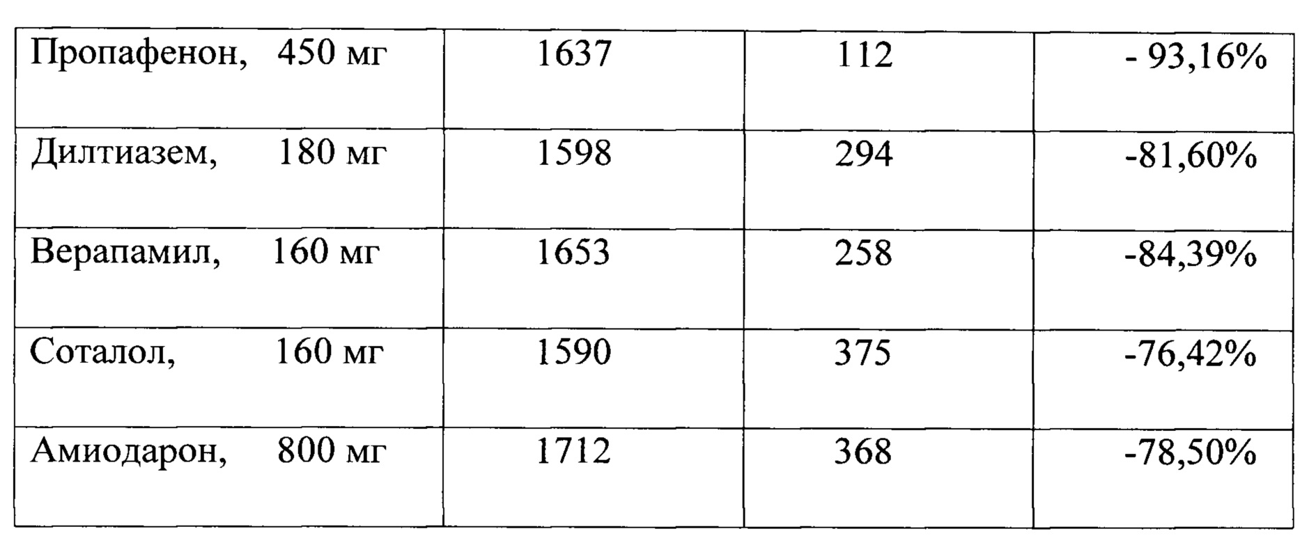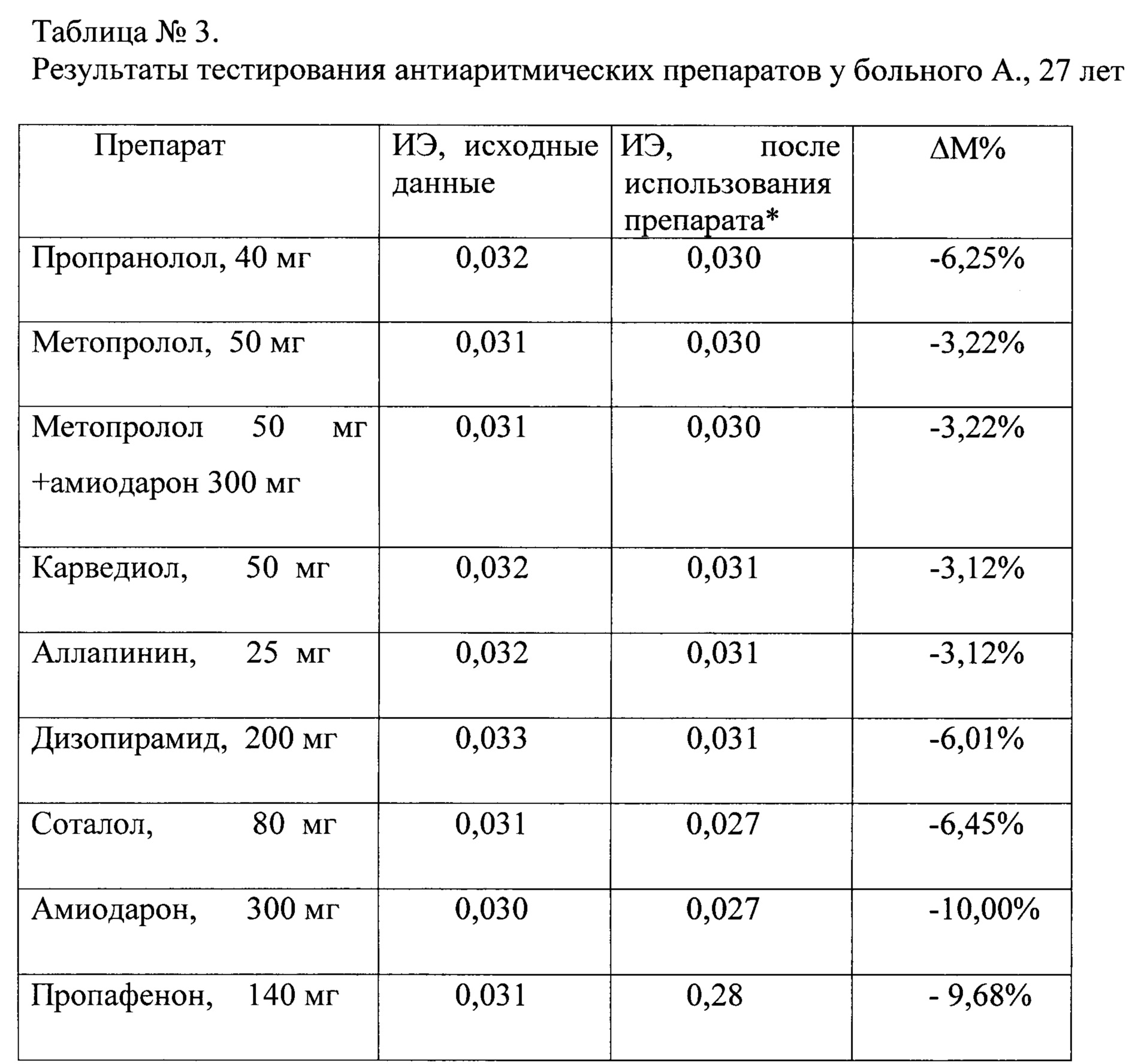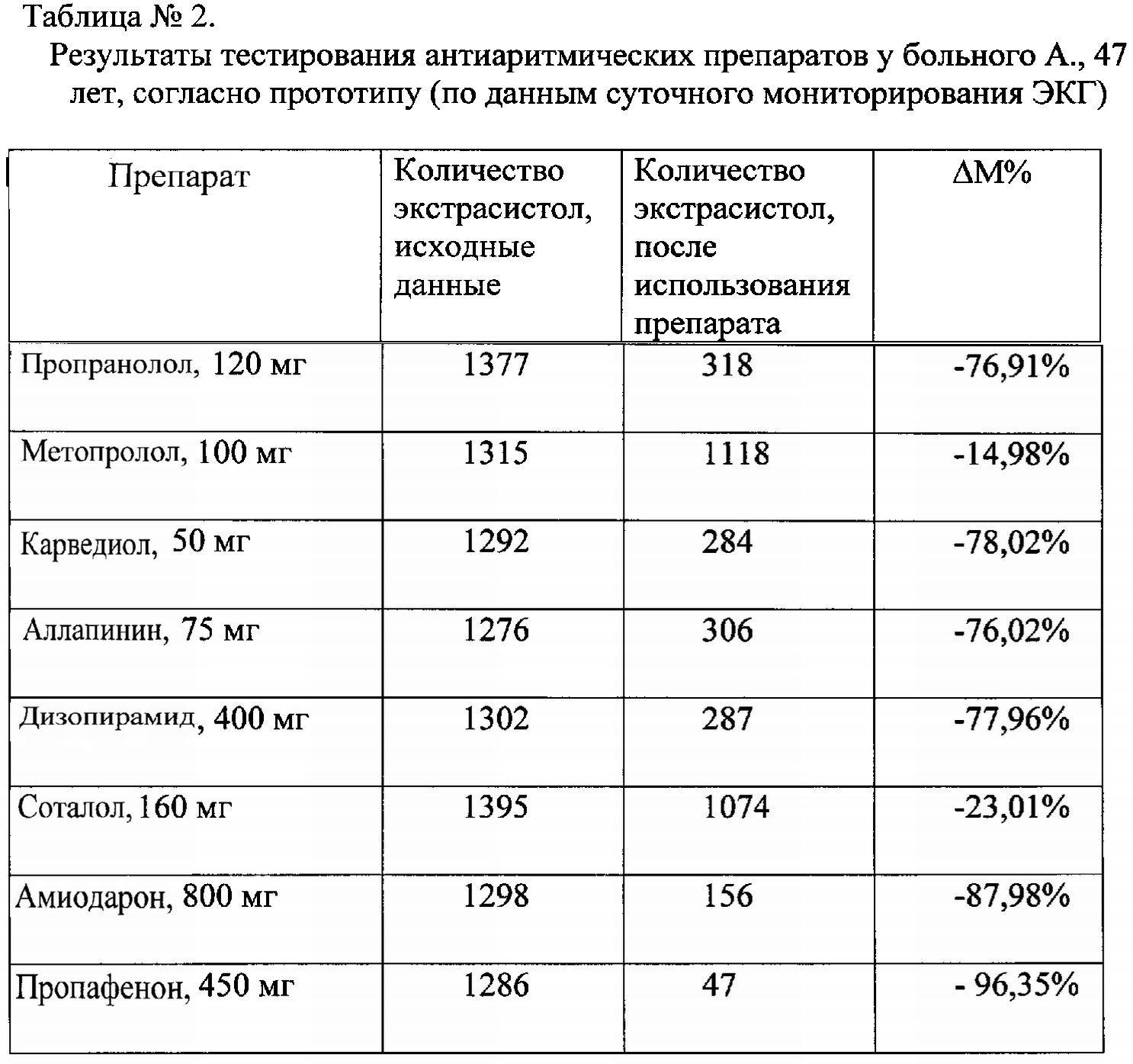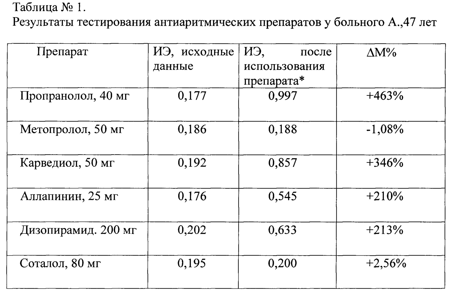 Изобретение относится к области медицины, а именно к кардиологии, в частности к способам выбора наиболее эффективного антиаритмического препарата для больных с экстрасистолией. В широко распространенном способе выбора эффективного антиаритмического препарата для больных с экстрасистолией учитывается основное заболевание, на фоне которого развилась аритмия, характер экстрасистолии (желудочковая или наджелудочковая), ее прогностическая оценка, например, в отношении развития жизнеугрожающих аритмий или внезапной смерти, наличия противопоказаний и возможное развитие побочных эффектов [Мазур Н.А. Пароксизмальные тахикардии. - М.: ИД Медпрактика-М, 2005. - 252 с., Кардиология: национальное руководство / под ред. Е.В. Шляхто. - 2 издание дополненное и переработанное. М.: ГЭОТАРМедиа, 2015. - 800 с.]. Известен также способ выбора дифференцированной антиаритмической терапии (ААТ) желудочковых нарушений сердечного ритма в зависимости от механизма их развития, заключающегося в том, что при выявлении триггерного механизма желудочковой экстрасистолии наиболее эффективными для ее купирования являются препараты II(IV) классов, а при определении re-entry - препараты III(I) классов [А.И. Олесин, А.В. Шабров, А.В. Козий, К.А. Полянская, Е.В. Семенова Возможность выбора дифференцированной терапии желудочковых нарушений сердечного ритма в зависимости от механизма их развития // Вестник СПбГМА им. И.И. Мечникова. - 2005. - №4. - С. 66-69]. Недостатком аналогов является отсутствие независимых предикторов для выбора наиболее эффективного антиаритмического препарата для больных с экстрасистолией. В качестве прототипа по наиболее близкой технической сущности нами выбран способ выбора наиболее эффективного антиаритмического препарата для больных с экстрасистолией, заключающийся в тестировании антиаритмических препаратов. Проводят суточное мониторирование электрокардиограммы (ЭКГ) до приема больным противоаритмического препарата и через 5-7 дня после его приема. Препаратом выбора является тот, после приема которого наблюдается уменьшение числа экстрасистол на 75% и более в сравнении с их исходной частотой, а также устранение парных, групповых экстрасистол, причем при отсутствие эффекта одного препарата, каждый последующий препарат тестируется, как минимум, через 5 периодов полувыведения предыдущего [Кушаковский М.С. Аритмии сердца: руководство для врачей / М.С. Кушаковский. - 3-е изд, испр. и доп. - СПб.: Фолиант, 2004. - 672 с.]. Недостатком способа, выбранного нами в качестве прототипа, является длительность выбора наиболее эффективного антиаритмического препарата для больных с экстрасистолией, составляющая для тестирования одного препарата 5-7 дней. Техническим результатом изобретения является сокращение времени выбора наиболее эффективного антиаритмического препарата для больных с экстрасистолией. Технический результат изобретения достигается тем, что больному с экстрасистолией однократно поочередно вводят тестируемые антиаритмические препараты, причем каждый последующий препарат вводят через 3-5 периодов полувыведения предыдущего. До и после начала действия исследуемого антиаритмического препарата, определяемого как полупериод его полувыведения, проводят ЭКГ исследование и определяют ЛО ПДИкор. отдельно для лево- и правожелудочковой экстрасистолии (ЛЖЭ и 