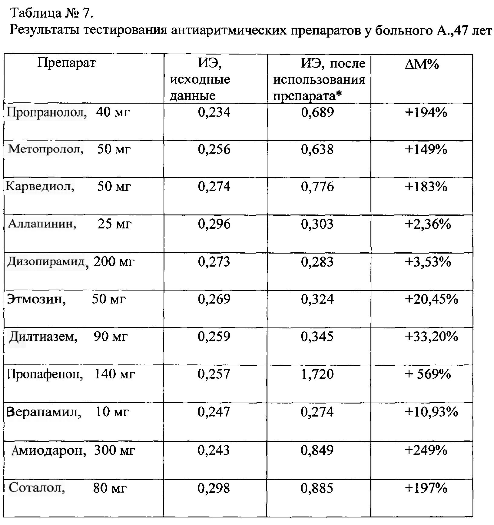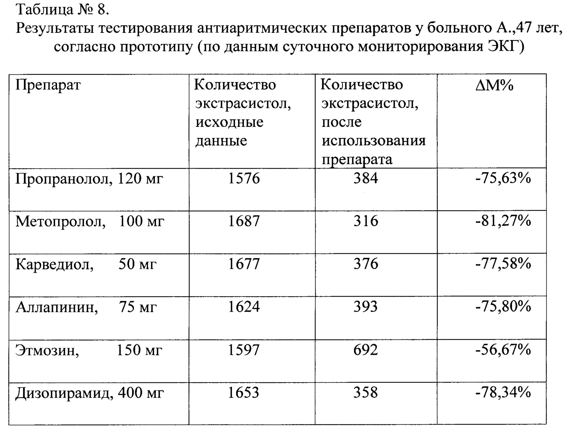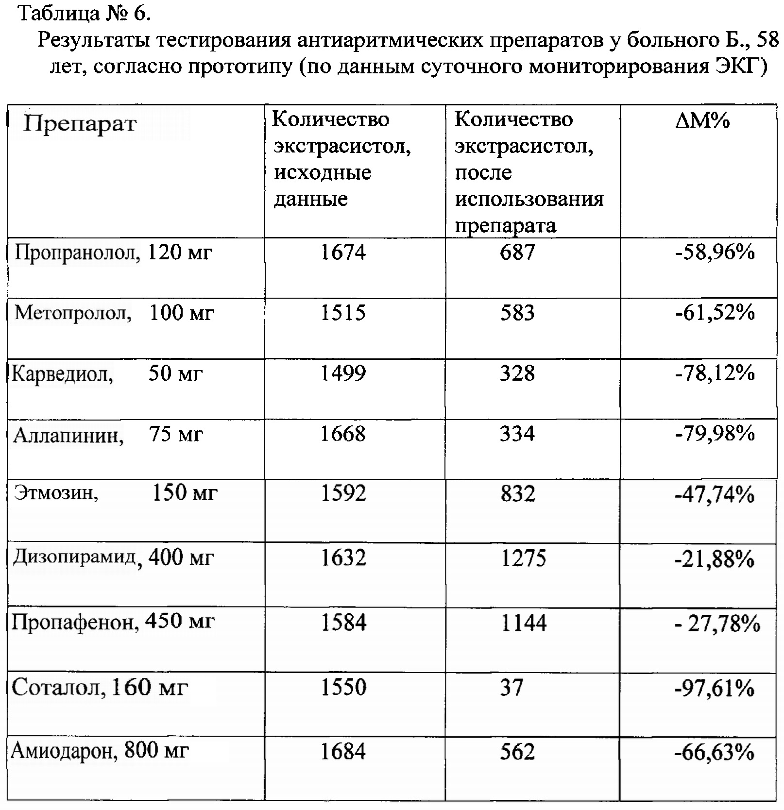 Изобретение относится к медицине, а именно к кардиологии, и касается выбора наиболее эффективного антиаритмического препарата для больных с экстрасистолией. Это достигается тем, что больному с экстрасистолией однократно поочередно вводят тестируемые антиаритмические препараты. Каждый последующий препарат вводят через 3-5 периодов полувыведения предыдущего. До и после начала действия исследуемого антиаритмического препарата, определяемого как полупериод его полувыведения, проводят ЭКГ исследование. При этом определяют линейное отклонение корригированного предэктопического интервала отдельно для лево- и правожелудочковой экстрасистолии, наджелудочковой экстрасистолии не менее чем в 20 экстрасистолах. Затем рассчитывают индекс экстрасистолии по формуле и при наибольшем увеличении индекса экстрасистолии, по сравнению с исходными величинами, определяют исследуемый антиаритмический препарат как наиболее эффективный. Способ обеспечивает значительное сокращение времени выбора препарата в каждом конкретном случае лечения экстрасистолии. 4 пр., 12 табл.