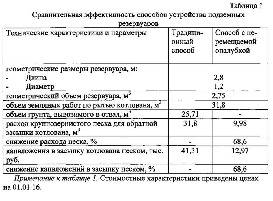 1. Способ устройства подземных резервуаров, заключающийся в рытье котлована под резервуар, установке фундамента, установке резервуара в котлован и креплении его к фундаменту, испытании смонтированного резервуара, размещении на дне котлована вокруг резервуара сборной перемещаемой опалубки, снабженной элементами для захвата и перемещения опалубки в верхней части и засыпке пространства между резервуаром и котлованом, отличающийся тем, что опалубка является сборной, выполненной из набора боковых и торцевых элементов, а засыпку осуществляют послойным заполнением пространства между опалубкой и резервуаром - песком, а между опалубкой и котлованом - грунтом с последующей их трамбовкой каждого слоя, затем производят повторное заполнение опалубки песком и котлована грунтом после перемещения опалубки вверх, вдоль резервуара до полной засыпки котлована и извлечения опалубки. 2. Способ устройства подземных резервуаров, осуществляемый с помощью сборной перемещаемой опалубки по п. 1, отличающийся тем, что опалубка выполнена высотой не более 1,0 м. 3. Способ устройства подземных резервуаров, осуществляемый с помощью сборной перемещаемой опалубки по п. 1, отличающийся тем, что опалубка имеет переменные размеры, определяемые количеством боковых и торцевых элементов, снабженных отверстиями в верхней части для взаимного крепления между собой в соответствии с размерами резервуара. 4. Способ устройства подземных резервуаров, осуществляемый с помощью сборной перемещаемой опалубки по п. 1, отличающийся тем, что увеличение размеров сборной опалубки по длине и ширине осуществляется доборными элементами.