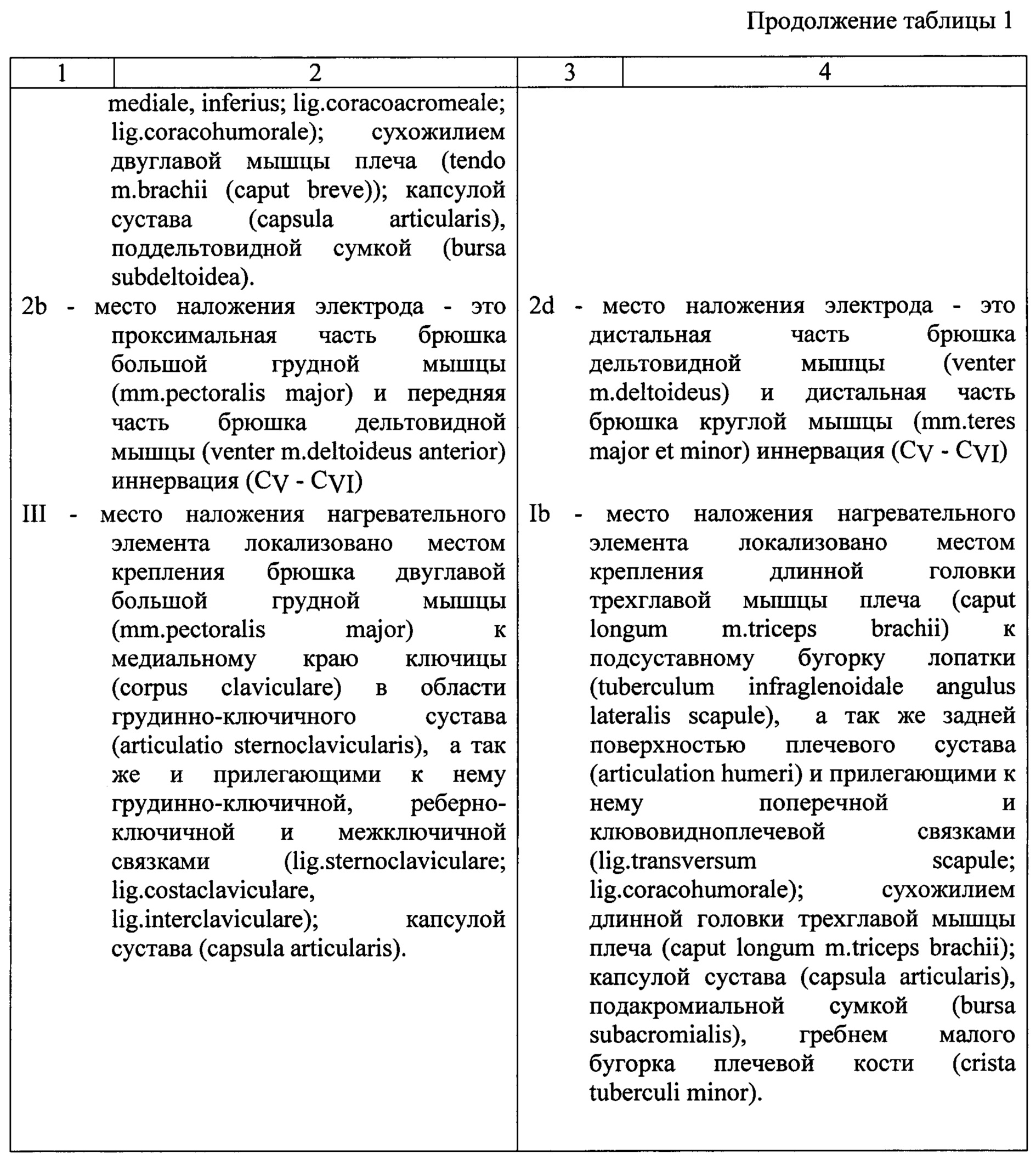 IV - местом наложения нагревательного элемента было выбрано место проксимальной части четырехглавой мышцы бедра (m.quadriceps femoris), проксимальной части портняжной мышцы бедра (m.sartorius), большой ягодичной мышцей (m.gluteus maximus); средней ягодичной мышцей (m.gluteus medius);); малой ягодичной мышцей (m.gluteus minimus); квадратной мышцей бедра (m.qudratus femoris); напрягателем широкой фасции (m.tensor fasciae latae); а также поверхностью тазобедренного сустава (articulatio coxae) и прилегающими к нему поперечной связкой вертлужной впадины (lig.transversum acetabuli); подвздошно-бедренной связкой (lig.iliofemorale); лобково-бедренной связкой (lig.pubofemorale); седалищно-бедренной связкой (lig.ischiofemorale); круговой зоной (zona orbicularis); связкой головки бедренной кости (lig.capitis femoris); сумкой большой ягодичной мышцы (bursa trochanterica m. glutei maximi); межмышечной сумкой ягодичных мышц (bursae intermusculares mm.gluteorum); седалищной сумкой большой ягодичной мышцы (bursa ischiadica m.glutei maximi); вертельной сумкой средней ягодичной мышцы (burse trochantericae m.glutei medii); вертельной сумкой малой ягодичной мышцы (bursa trochanterica m.glutei minimi); капсулой сустава (capsula articularis).