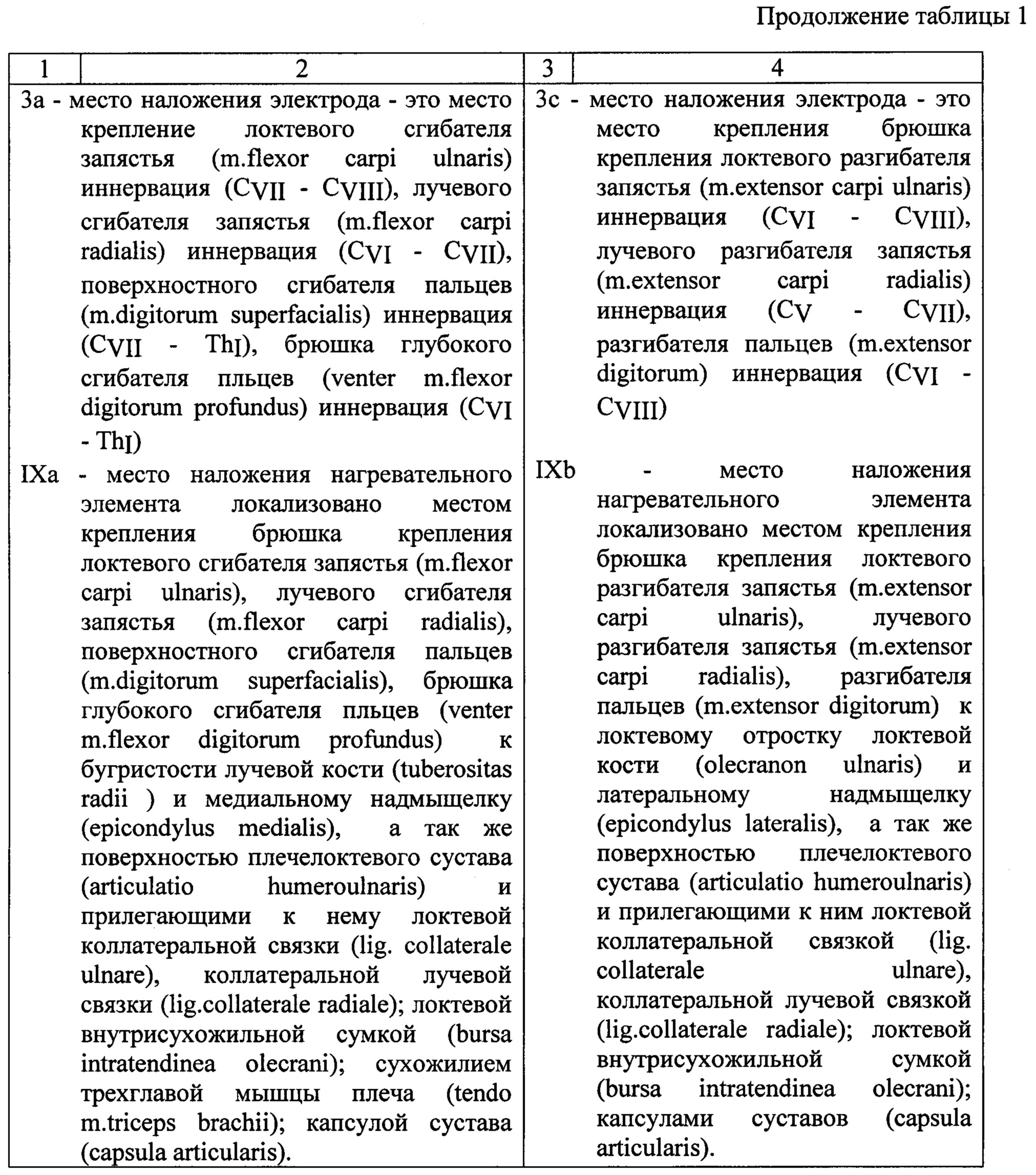 IXb - местом наложения нагревательного элемента было выбрано место крепления брюшка крепления локтевого разгибателя запястья (m.extensor carpi ulnaris), лучевого разгибателя запястья (m.extensor carpi radialis), разгибателя пальцев (m.extensor digitorum) к локтевому отростку локтевой кости (olecranon ulnaris) и латеральному надмыщелку (epicondylus lateralis), а также поверхностью плечелоктевого сустава (articulatio humeroulnaris) и прилегающими к ним локтевой коллатеральной связкой (lig.collaterale ulnare), коллатеральной лучевой связкой (lig.collaterale radiale); локтевой внутрисухожильной сумкой (bursa intratendinea olecrani); капсулами суставов (capsula articularis).