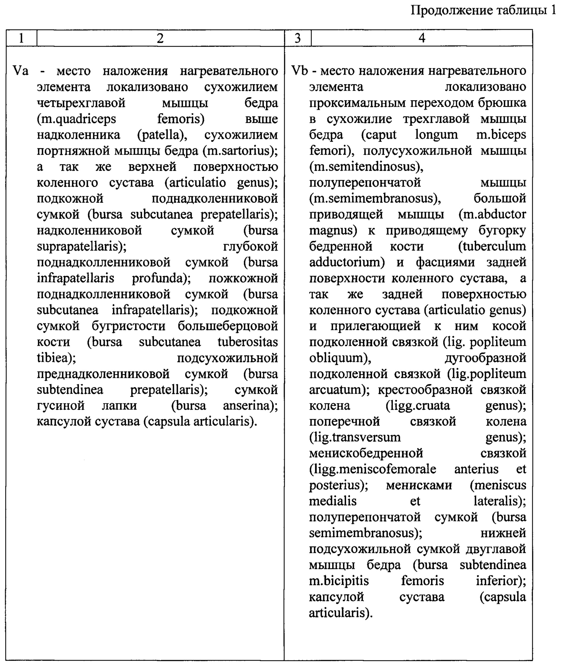 Va - местом наложения нагревательного элемента было выбрано сухожилие четырехглавой мышцы бедра (m.quadriceps femoris) выше надколенника (patella), сухожилием портняжной мышцы бедра (m.sartorius); а также верхней поверхностью коленного сустава (articulatio genus); подкожной поднадколенниковой сумкой (bursa subcutanea prepatellaris); надколенниковой сумкой (bursa suprapatellaris); глубокой поднадколленниковой сумкой (bursa infrapatellaris profunda); пожкожной поднадколленниковой сумкой (bursa subcutanea infrapatellaris); подкожной сумкой бугристости большеберцовой кости (bursa subcutanea tuberositas tibiea); подсухожильной преднадколенниковой сумкой (bursa subtendinea prepatellaris); сумкой гусиной лапки (bursa anserina); капсулой сустава (capsula articularis).