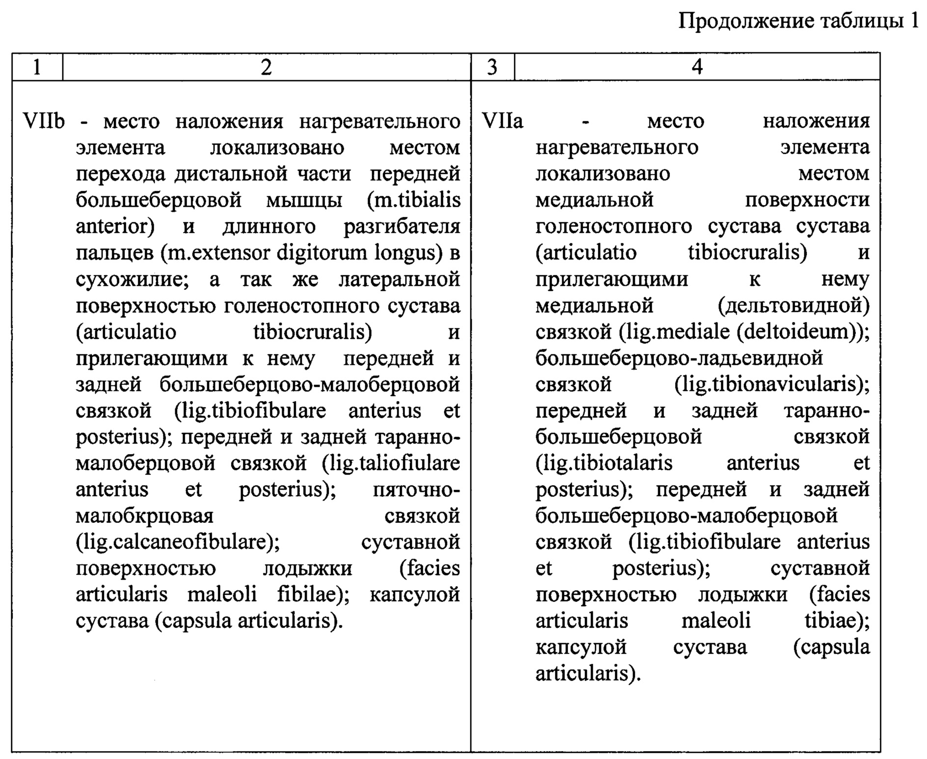 VIIa - местом наложения нагревательного элемента было выбрано место медиальной поверхности голеностопного сустава сустава (articulatio tibiocruralis) и прилегающими к нему медиальной (дельтовидной) связкой (lig.mediale (deltoideum)); большеберцово-ладьевидной связкой (lig.tibionavicularis); передней и задней таранно-большеберцовой связкой (lig.tibiotalaris anterius et posterius); передней и задней большеберцово-малоберцовой связкой (lig.tibiofibulare anterius et posterius); суставной поверхностью лодыжки (facies articularis maleoli tibiae); капсулой сустава (capsula articularis).