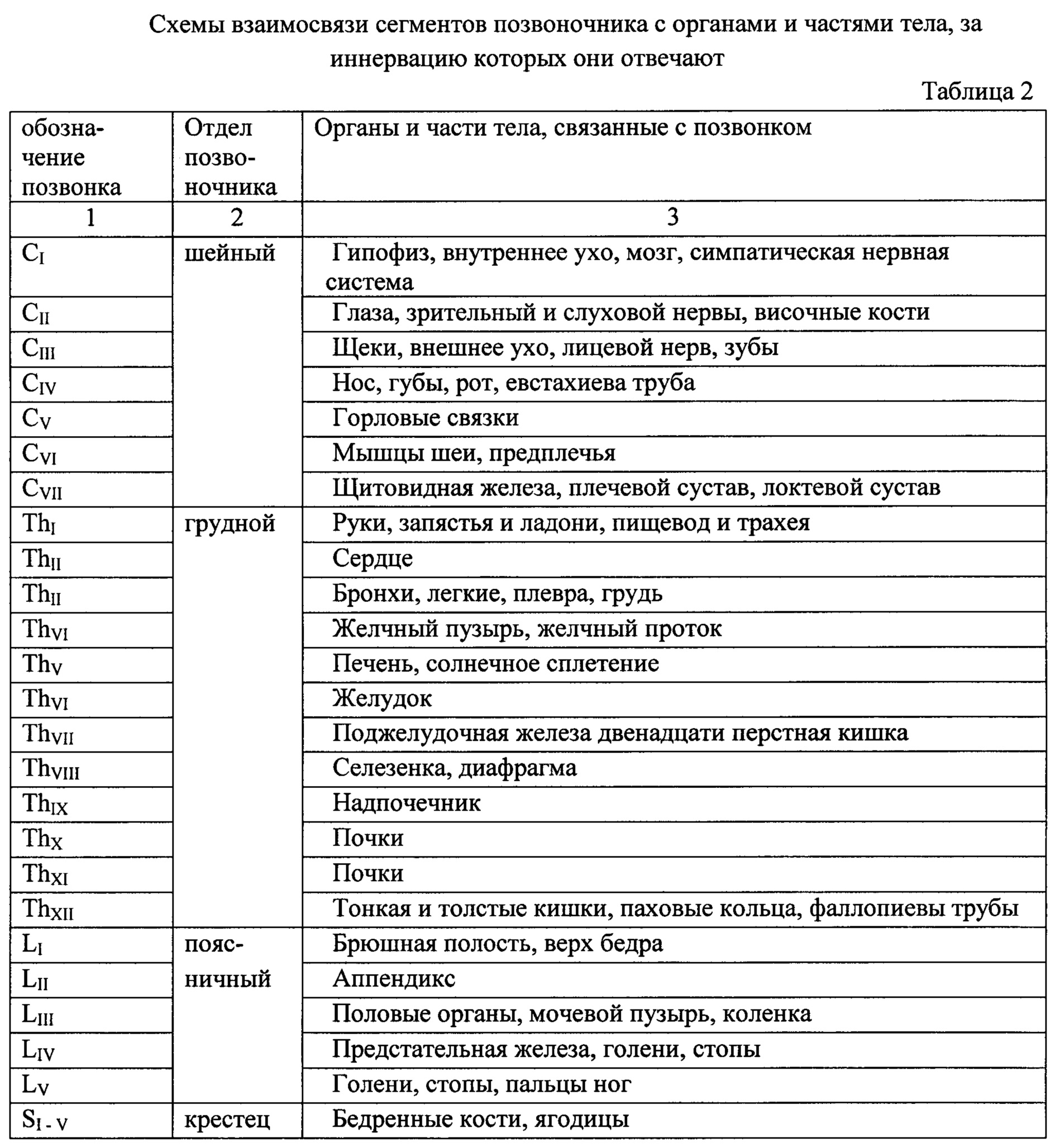 Релаксационное воздействие на спазмированные мышцы-агонисты преимущественно, осуществляют термальным воздействием температурой от 42 до 60оС, при этом электроимпульсное воздействие на расслабленные мышцы-антагонисты осуществляют с частотой импульсов от 15 до 35 Гц, длительность импульсного сигнала составляет от 5 до 60 мкс, текущий уровень сигнала в диапазоне от 5 до 75% от мощности сигнала, при котором пациент чувствует вибрацию. Воздействия на мышечные пары агонист/антагонист и на сегменты позвоночника, отвечающие за иннервацию мышечных пар агонист/антагонист, могут осуществлять одновременно, или поочередно. Воздействия на мышечные пары агонист/антагонист могут осуществляют поочередно на фоне постоянного воздействия на сегменты позвоночника, отвечающие за иннервацию мышечных пар агонист/антагонист. Стимулирующее электроимпульсное воздействие и релаксационное воздействие могут осуществлять на отдельные или на все упомянутые зоны тела одновременно.