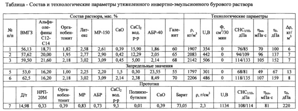Утяжеленный инвертно-эмульсионный буровой раствор при различных массовых соотношениях компонентов при температуре (20±2)°C имеет плотность (ρ) от 1907 до 2142 кг/м3, показатель электростабильности (U) - от 354 до 486 В, показатель фильтрации при перепаде давления на фильтрующем элементе 0,7 МПа (Ф) - 0 см3/30 мин, статическое напряжение сдвига через 1 минуту и 10 минут покоя (CHC1 мин/10 мин) от 76 до 114 и от 120 до 133 дПа соответственно, пластическую вязкость (ηпл) от 70 до 105 мПа⋅с, предельное динамическое напряжение сдвига (τ0) от 120 до 152 дПа, стабильность раствора (Δρ) от 6 до 7 кг/м3.
