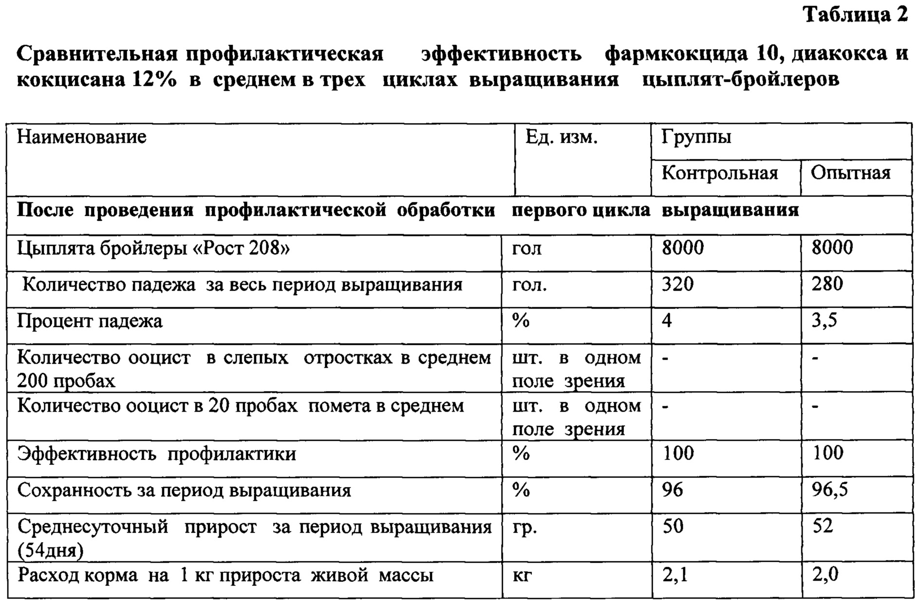 Изобретение относится к области ветеринарии, в частности к способу профилактики кокцидиоза цыплят-бройлеров при выращивании их на мясо. Способ включает ротационное введение им в корм кокцидиостатиков. В качестве кокцидиостатиков цыплятам-бройлерам в корм добавляют композицию, состоящую из фармкокцида 10, диакокса и, отдельно, кокцисана 12%. Причем фармкокцид 10 и диакокс в корм добавляют с 3-5-дневного возраста в течение 30 дн в дозах соответственно 1250 и 500 г на 1 т корма, затем до конца периода выращивания в корм добавляют кокцисан 12% в дозе 500 г на 1 т корма, при этом за 5 дн до убоя прекращают дачу препарата. Использование изобретения позволит повысить среднесуточный прирост живой массы птицы, сохранность поголовья. 3 табл., 1 пр.