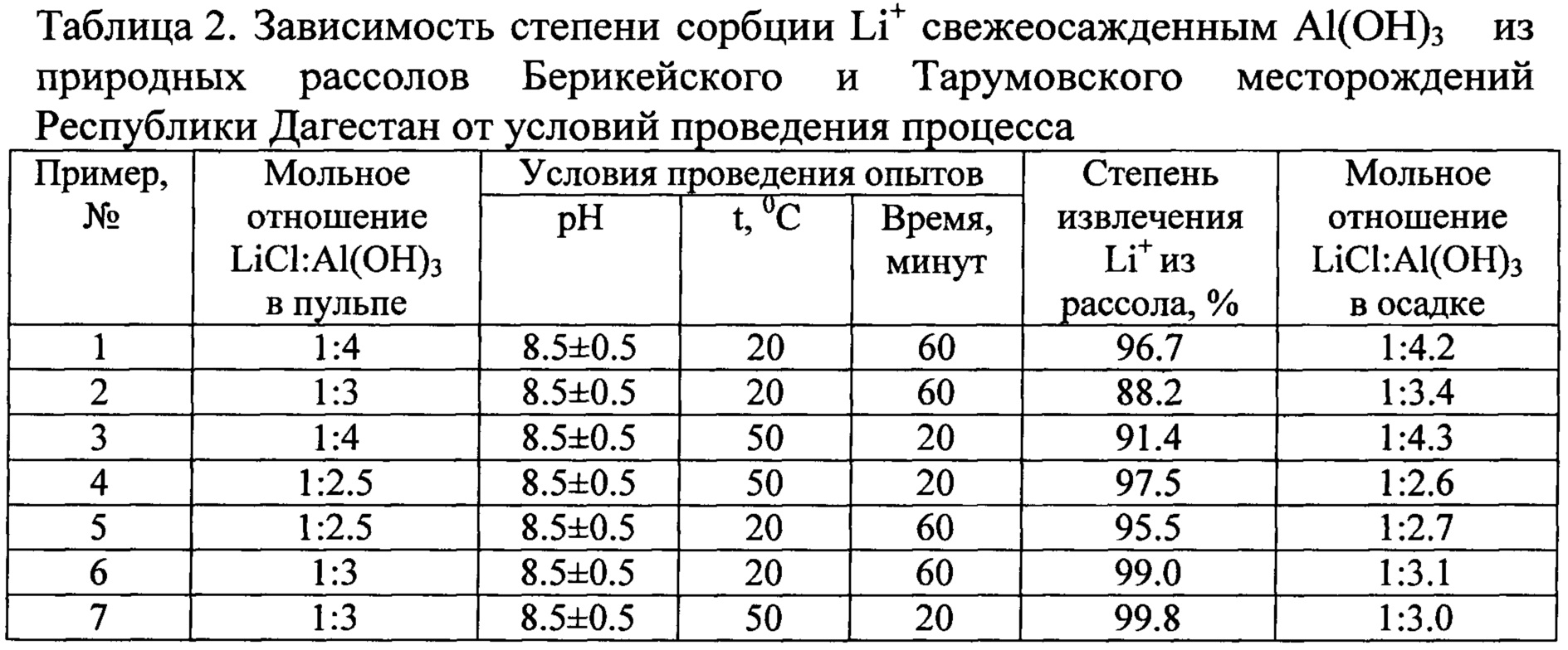 Способ получения карбоната лития из литийсодержащих природных рассолов, отличающийся тем, что получают литийалюминиевый концентрат путем обработки литийсодержащего рассола суспензией свежеосажденного гидроксида алюминия при рН 8,5±0,5, температуре 20-50°С и продолжительности перемешивания 20-60 мин; полученный литийалюминиевый концентрат отделяют от маточного раствора фильтрованием на нутч-фильтре и промывкой пресной водой при Т:Ж=1:5; промытый осадок литийалюминиевого концентрата без сушки с влажностью 60-70% загружают в экстрактор типа Сокслет и 10-кратно обрабатывают дистиллированной водой при температуре 100°С с получением концентрированного раствора хлорида лития, который для очистки от примесей кальция нагревают до 90°С и при перемешивании подвергают обработке насыщенным раствором Na2CO3; из очищенного от примесей кальция литиевого концентрата получают карбонат лития с содержанием основного вещества 99,6% путем дозирования в него насыщенного раствора карбоната натрия, содержащего стехиометрическое количество Na2CO3, необходимого для осаждения Li2CO3; осадок отделяют от маточного раствора, промывают ступенчато тремя порциями насыщенного раствора Li2CO3 при Т: Ж=1:5, после чего Li2CO3 сушат.