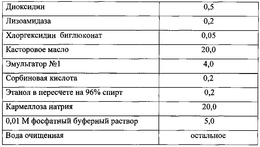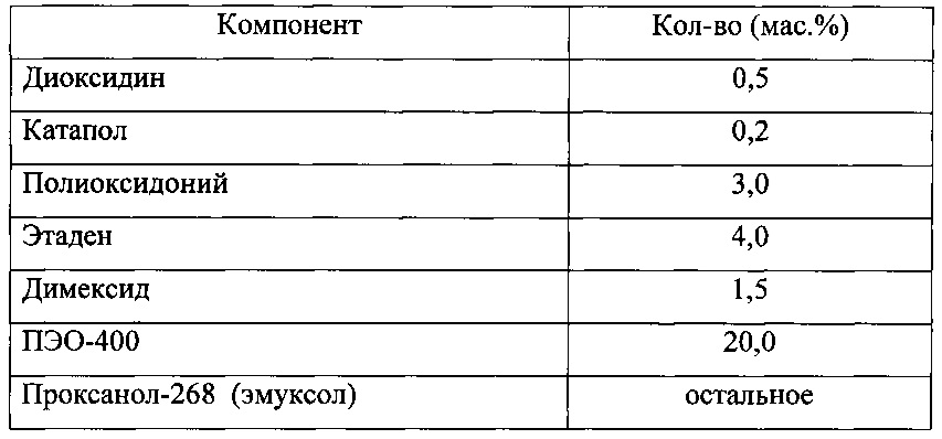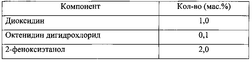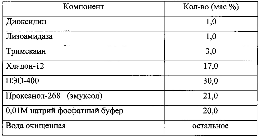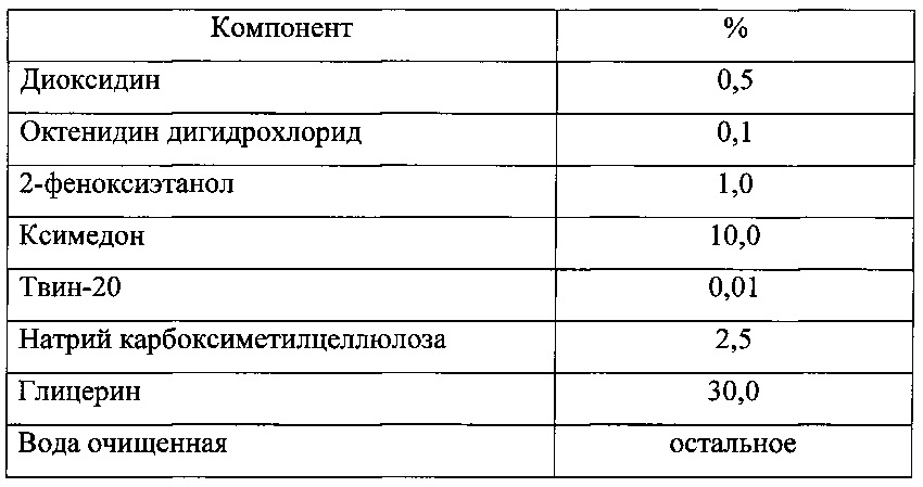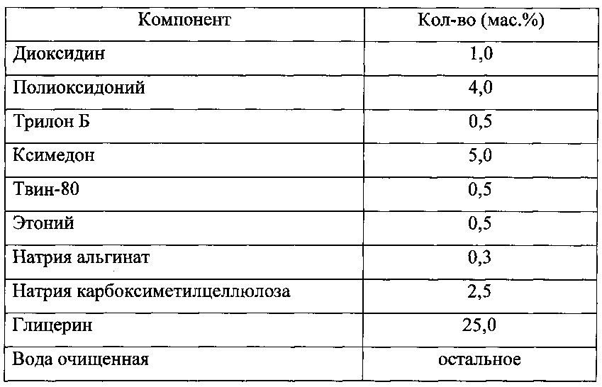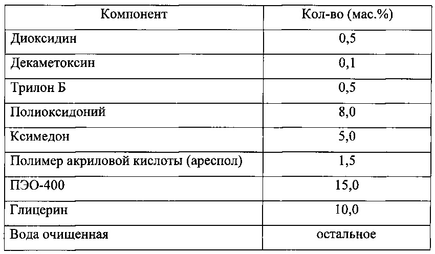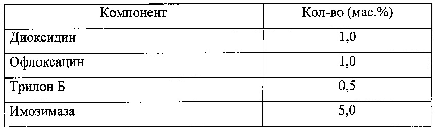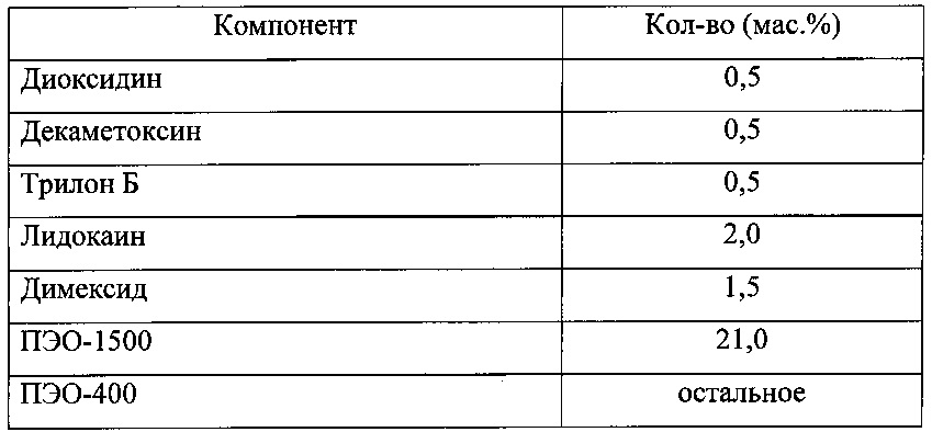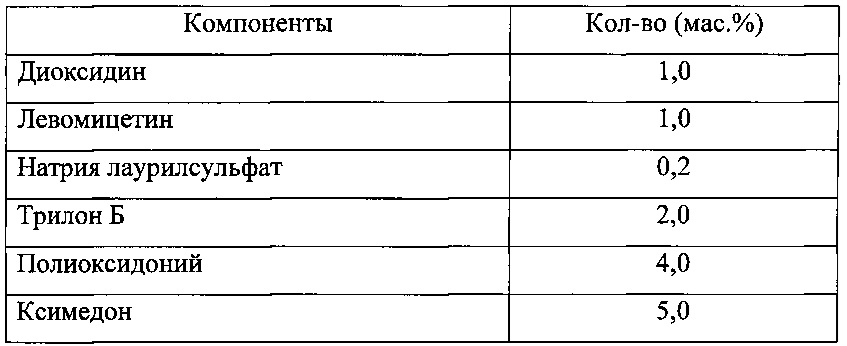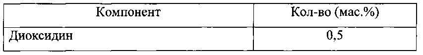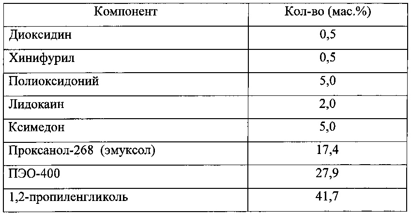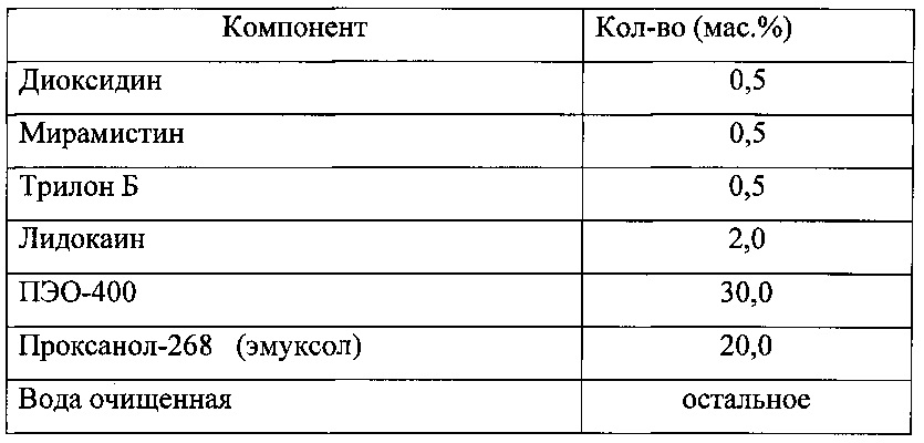 8. Фармацевтическая комбинированная композиция для наружного и местного применения, включающая диоксидин, гидрофильную основу, лидокаин или тримекаин в качестве анестетика, отличающаяся тем, что она дополнительно содержит вещество, выбранное из ряда: офлоксацин, ципрофлоксацин, нетилмицин, амикацин, левомицетин, в качестве антибиотика, а также вещество, выбранное из ряда: этилендиаминтетрауксусная кислота, трилон Б, триметоприм, натрия лаурилсульфат, катапол, мирамистин, декаметоксин, хлоргексидин, полигексанид, в качестве синтетического антибактериального средства, снижающего резистентность микроорганизмов, при следующем соотношении компонентов, мас.%: