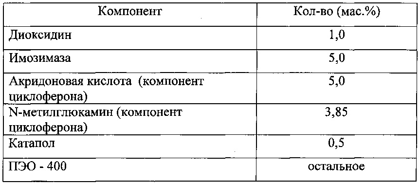 12. Фармацевтическая комбинированная композиция для наружного и местного применения, включающая диоксидин, гидрофильную основу, лидокаин или тримекаин в качестве анестетика, отличающаяся тем, что она дополнительно содержит вещество, выбранное из ряда: полиоксидоний, циклоферон, тилорон или их смесь, в качестве синтетического иммуномодулятора, при следующем соотношении компонентов, мас.%: