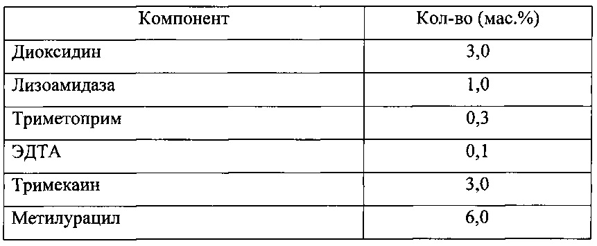 11. Фармацевтическая композиция по п.8, или 9, или 10, отличающаяся тем, что она дополнительно включает комплекс протеолитических ферментов, ограниченный веществом, выбранным из ряда: лизоамидаза, имозимаза, ультрализин, в количестве от 0,05 до 16,00 мас.%.