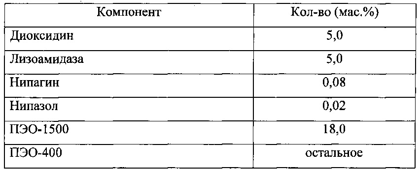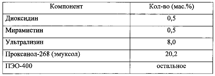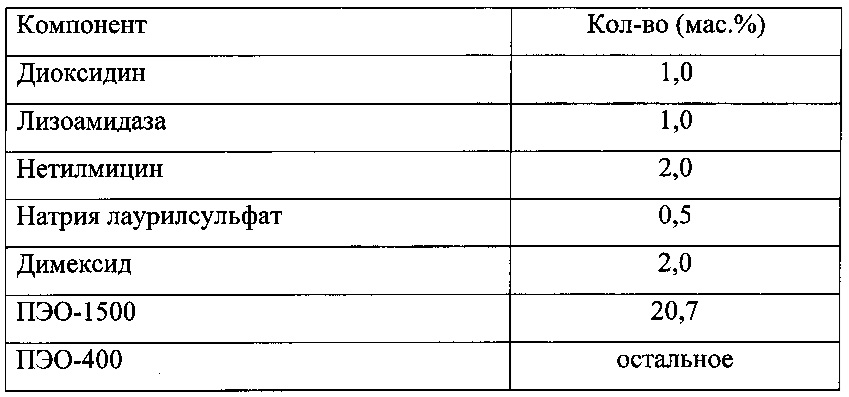 В прилагаемой к описанию таблице 1 даны результаты экспериментальной проверки антимикробной активности в отношении госпитальных штаммов известных мазей по сравнению с некоторыми комбинированными мазевыми композициями на гидрофильной основе по предлагаемому изобретению. Из этой таблицы видно, что антимикробная активность некоторых предлагаемых комбинированных мазевых композиций по отношению к госпитальным штаммам имеет высокую чувствительность, и в ряде случаев выше, чем у известных мазей.