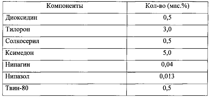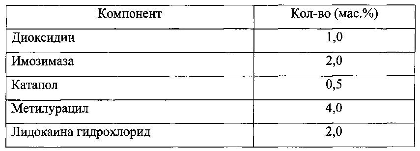 10. Фармацевтическая композиция по п.8 или 9, отличающаяся тем, что она дополнительно включает стимулятор репаративных процессов, ограниченный веществом, выбранным из ряда: ксимедон, метилурацил, кальция пантотенат, солкосерил, этаден, в количестве от 0,5 до 10,5 мас.%.