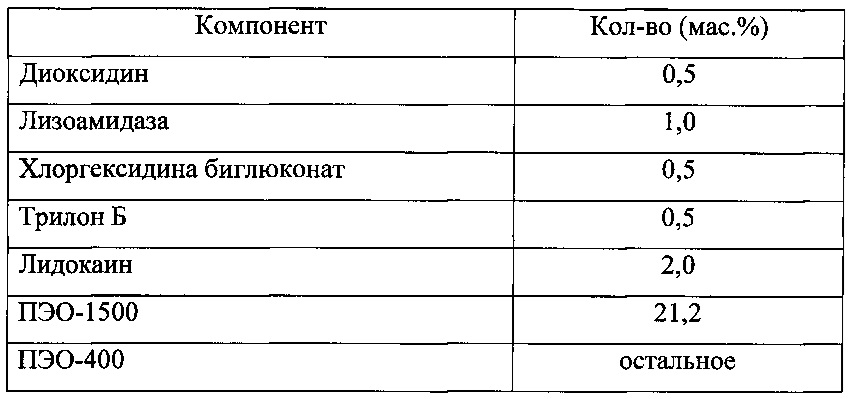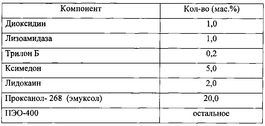 1. Фармацевтическая комбинированная композиция для наружного и местного применения, включающая диоксидин, гидрофильную основу, лидокаин или тримекаин в качестве анестетика, отличающаяся тем, что она дополнительно содержит лизоамидазу, или имозимазу, или ультрализин в качестве комплекса протеолитических ферментов, при следующем соотношении компонентов, мас.%: