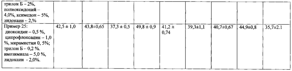 Таким образом, показано, что при использовании предлагаемого изобретения могут быть получены следующие технические результаты: повышение терапевтической активности в сравнении с известными препаратами, в том числе к штаммам микроорганизмов, резистентных к отдельным компонентам композиции, улучшение течения раневого процесса, быстрое очищение раны, сокращения времени реконвалесценции, т.е. создаются оптимальные условия для сокращения сроков проведения системной антимикробной и противогрибковой терапии, ускорения процесса заживления, улучшения условий для заживления ран.