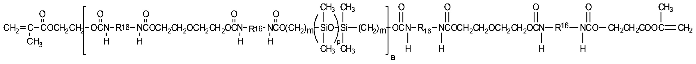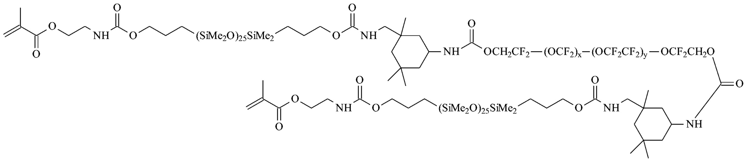 где R16 представляет собой бирадикал диизоцианата после удаления изоцианатной группы, такой как бирадикал изофорондиизоцианата. Другим силиконсодержащим макромером, соответствующим целям настоящего изобретения, является соединение по формуле X (где x+y представляет собой число в диапазоне от 10 до 30), получаемое при реакции фторэфира, полидиметилсилоксана с концевой гидроксильной группой, изофоронизоцианата и изоцианатоэтилметакрилата.