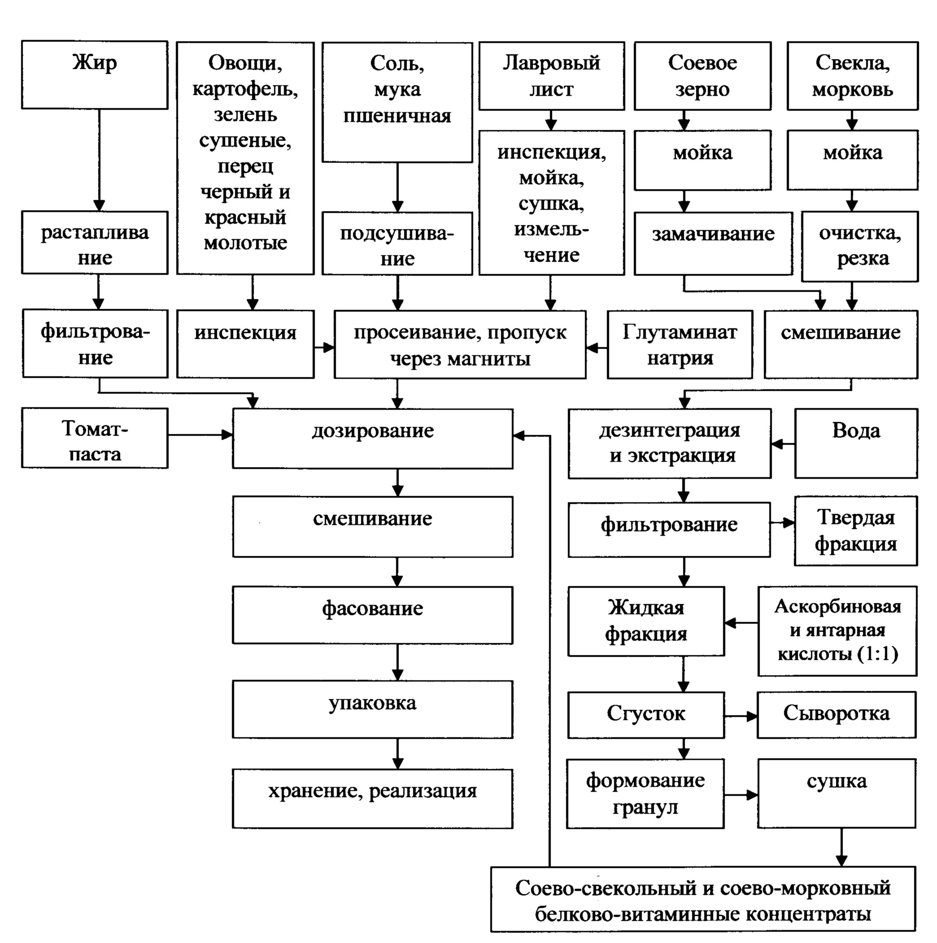 Технологический процесс приготовления пищевых концентратов «Борщ с соево-свекольным и соево-морковным белково-витаминными концентратами» показан на схеме.