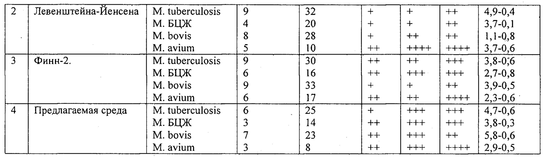Питательная среда для выделения и культивирования микобактерий, содержащая железа аммонийного цитрат, L-аспарагин, лимонную кислоту, магния сульфат, калия гидрофосфат, натрия дигидрофосфат, натрия хлорид, твин-80, отличающаяся тем, что дополнительно содержит агар-агар и геотермальную воду с количественным составом компонентов:Железа аммонийного цитрат, г 0,0167 L-Аспарагин, г 1,330 Лимонная кислота, г 0,660 Магния сульфат, г 0,166 Калия гидрофосфат, г 0,287 Натрия дигидрофосфат, г 0,633 Натрия хлорид, г 0,400 Твин-80, г 0,833 Агар-агар, г 20 Геотермальная вода, мл 1000 Значение pH при 25°С 7,2±0,2