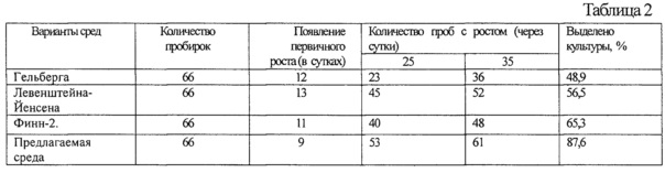 Изобретение относится к биотехнологии. Питательная среда для выделения и культивирования микобактерий содержит железа аммонийного цитрат, L-аспарагин, лимонную кислоту, магния сульфат, калия гидрофосфат, натрия хлорид, твин-80, агар-агар и геотермальную воду при заданном соотношении компонентов. Изобретение позволяет повысить выход биомассы микобактерий и сократить сроки диагностики туберкулеза. 2 табл.